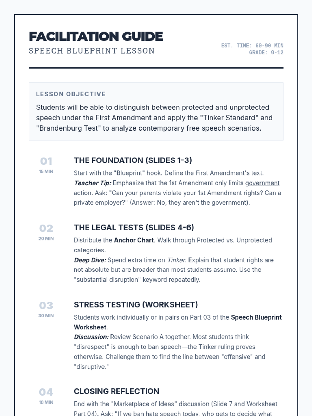 An exploration of the First Amendment's free speech protections and limitations in a democratic society. Students analyze landmark Supreme Court cases and apply legal standards to modern-day scenarios.