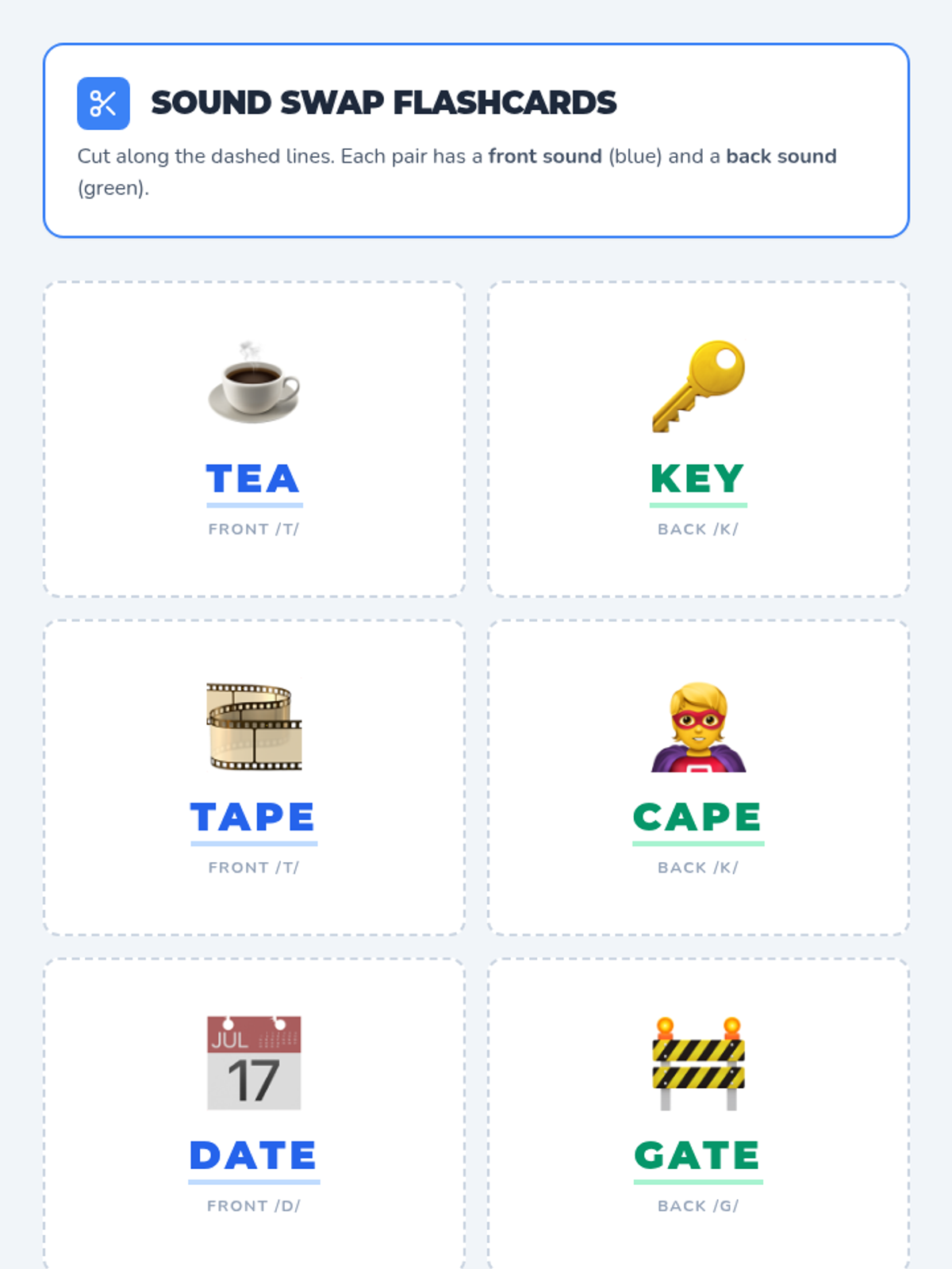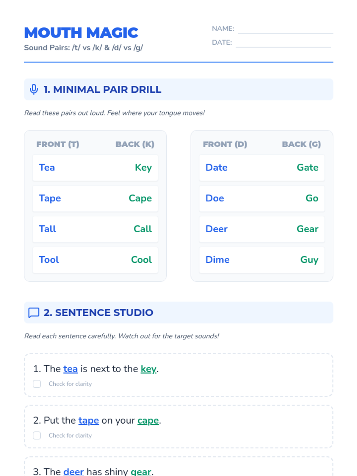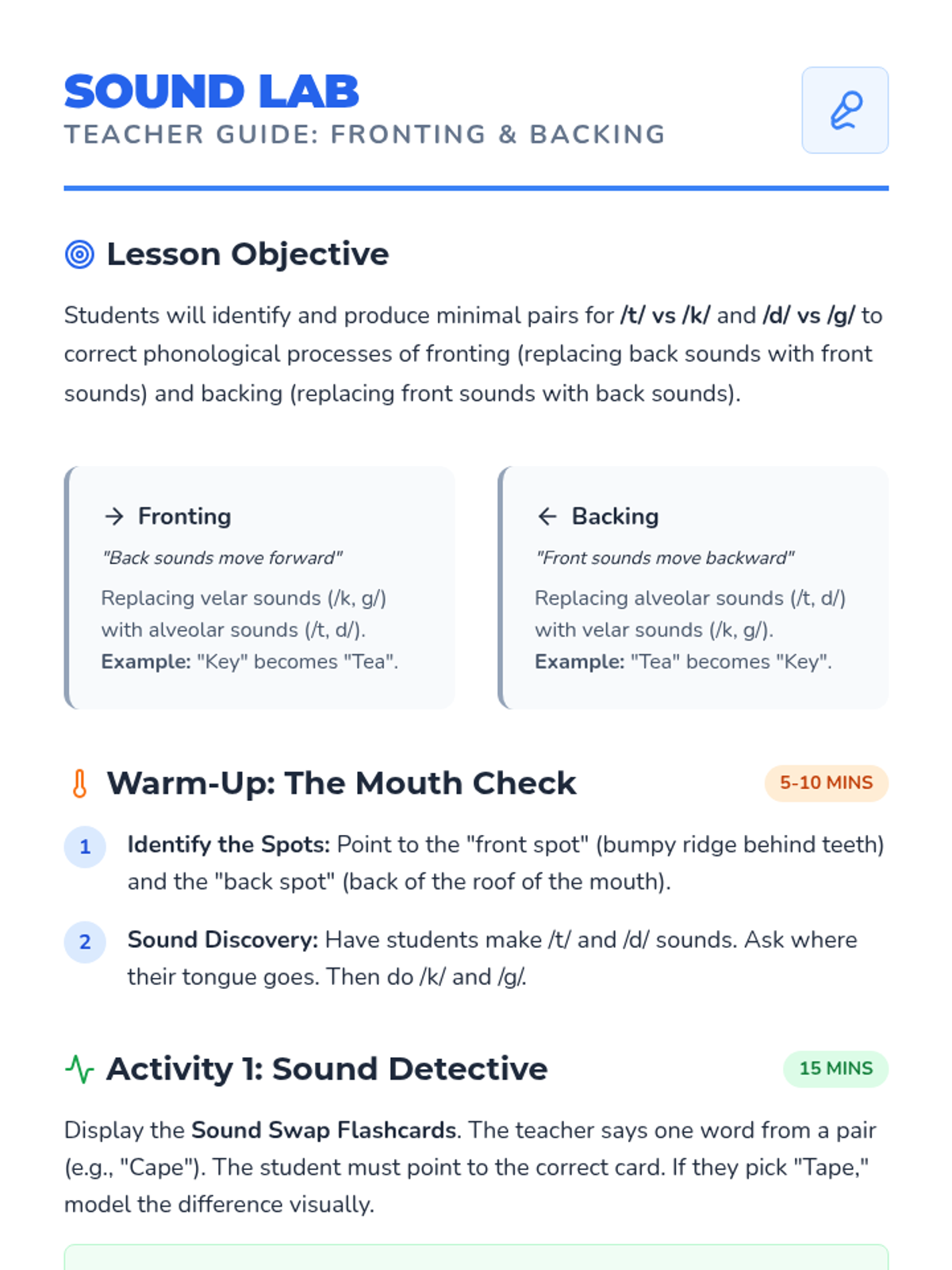 A comprehensive lesson for identifying and correcting fronting and backing phonological processes using /t/ vs /k/ and /d/ vs /g/ minimal pairs.