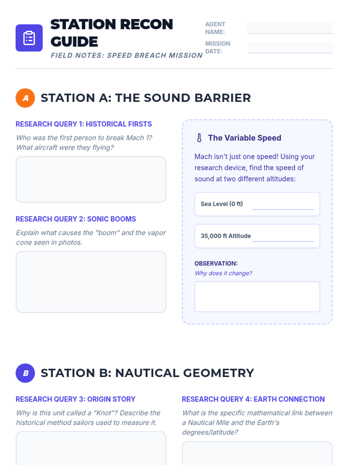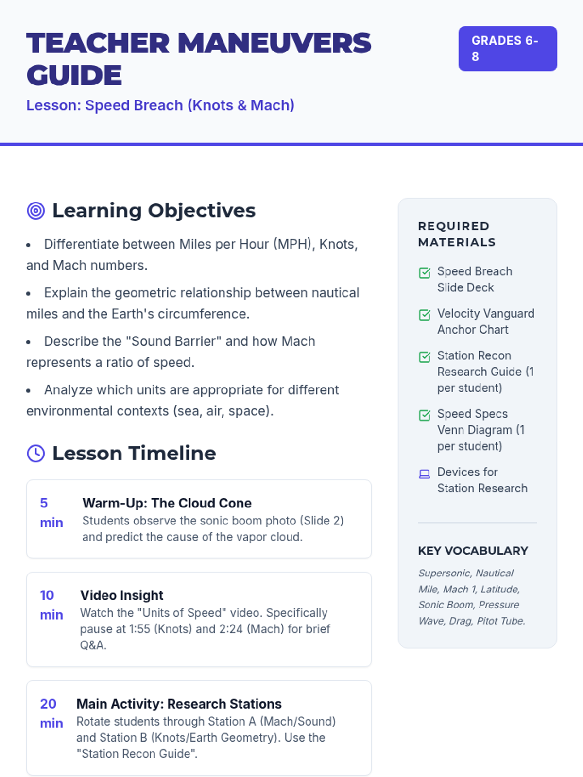 A middle school science lesson exploring specialized units of speed (Knots and Mach), their historical origins in navigation and aviation, and the physics of the sound barrier. Students use collaborative research to bridge the gap between everyday speed and supersonic flight.