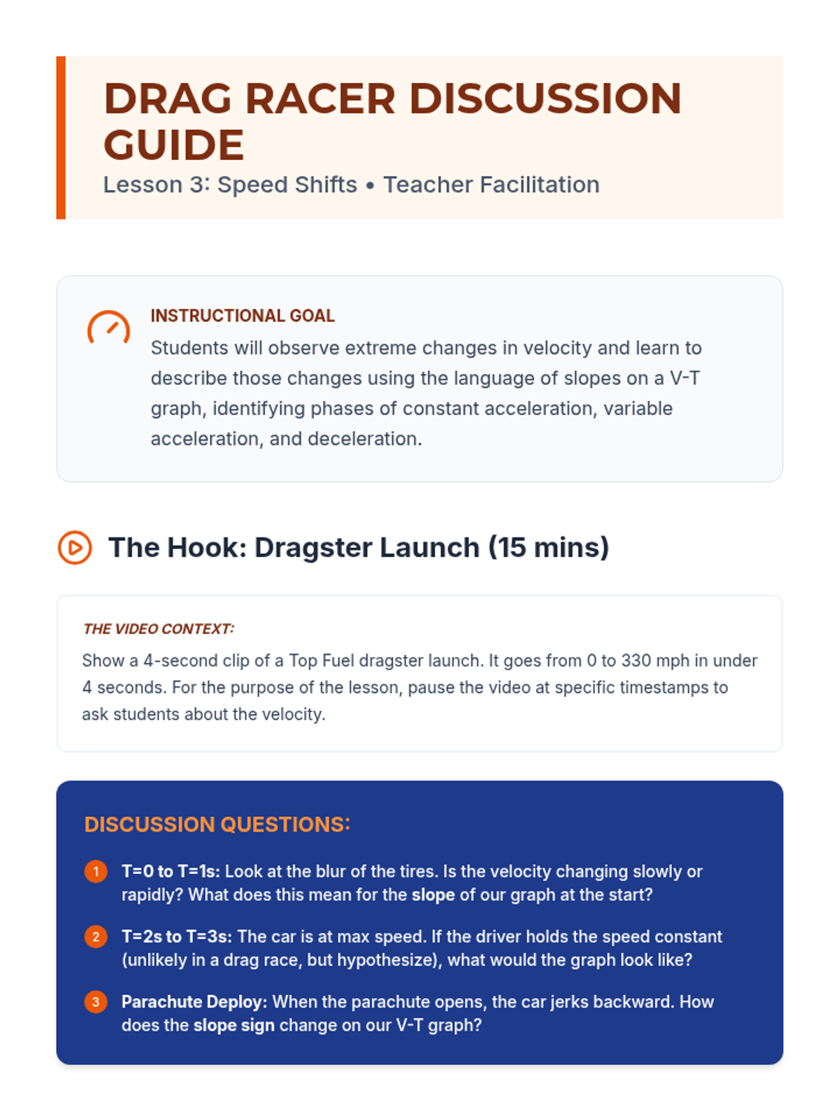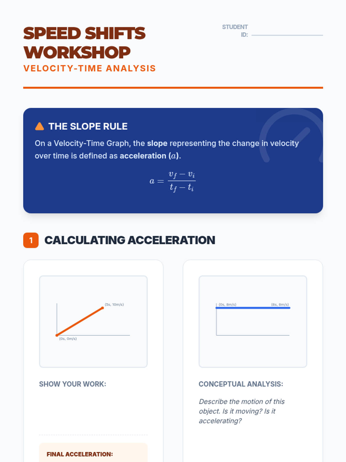 Learners transition to velocity-time graphs, analyzing how changing velocity appears graphically. They define acceleration as the slope of the v-t graph.