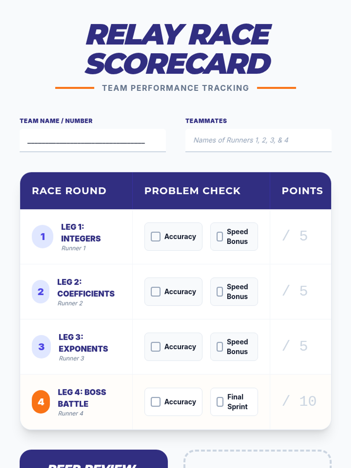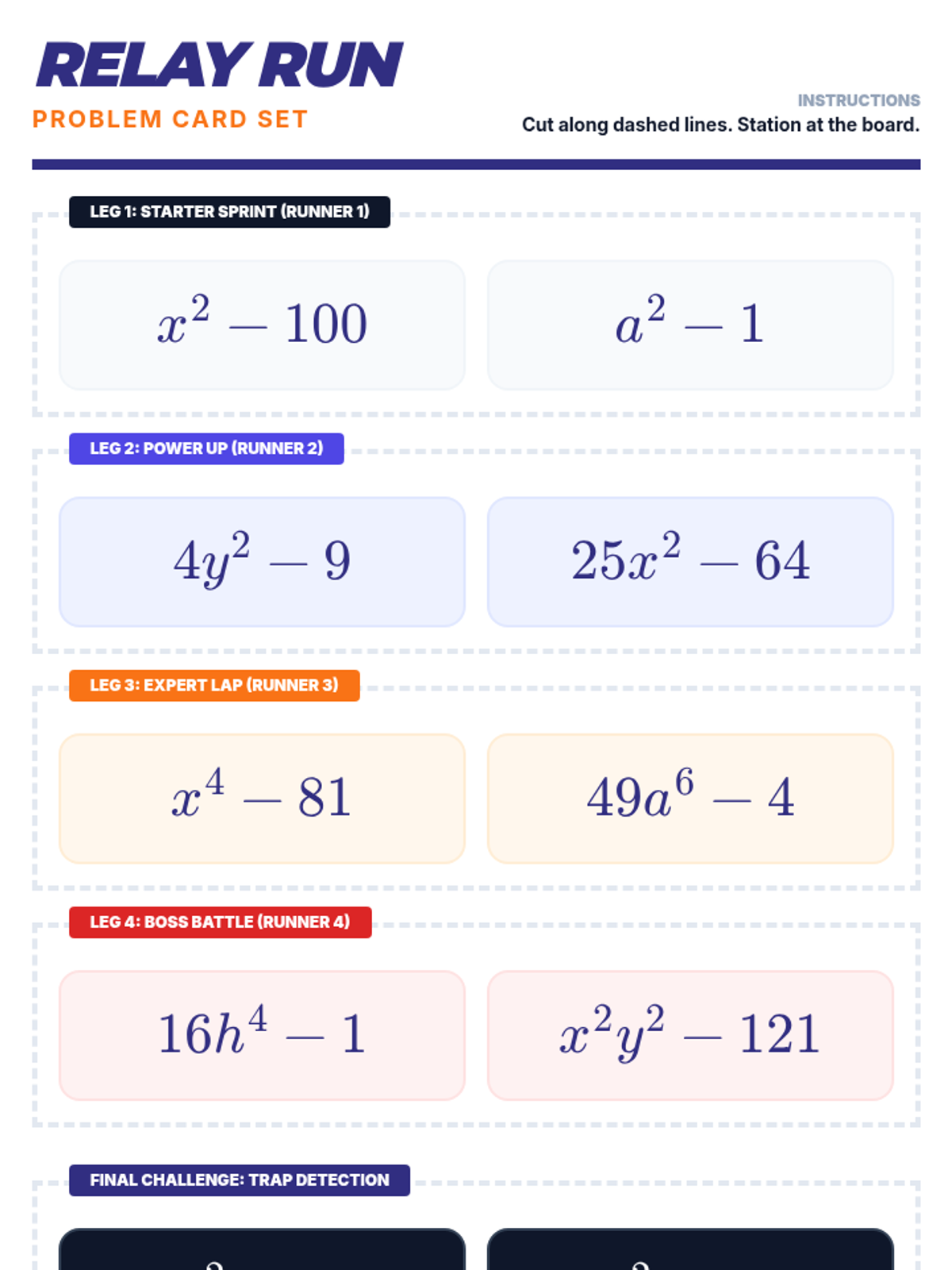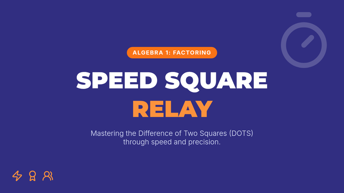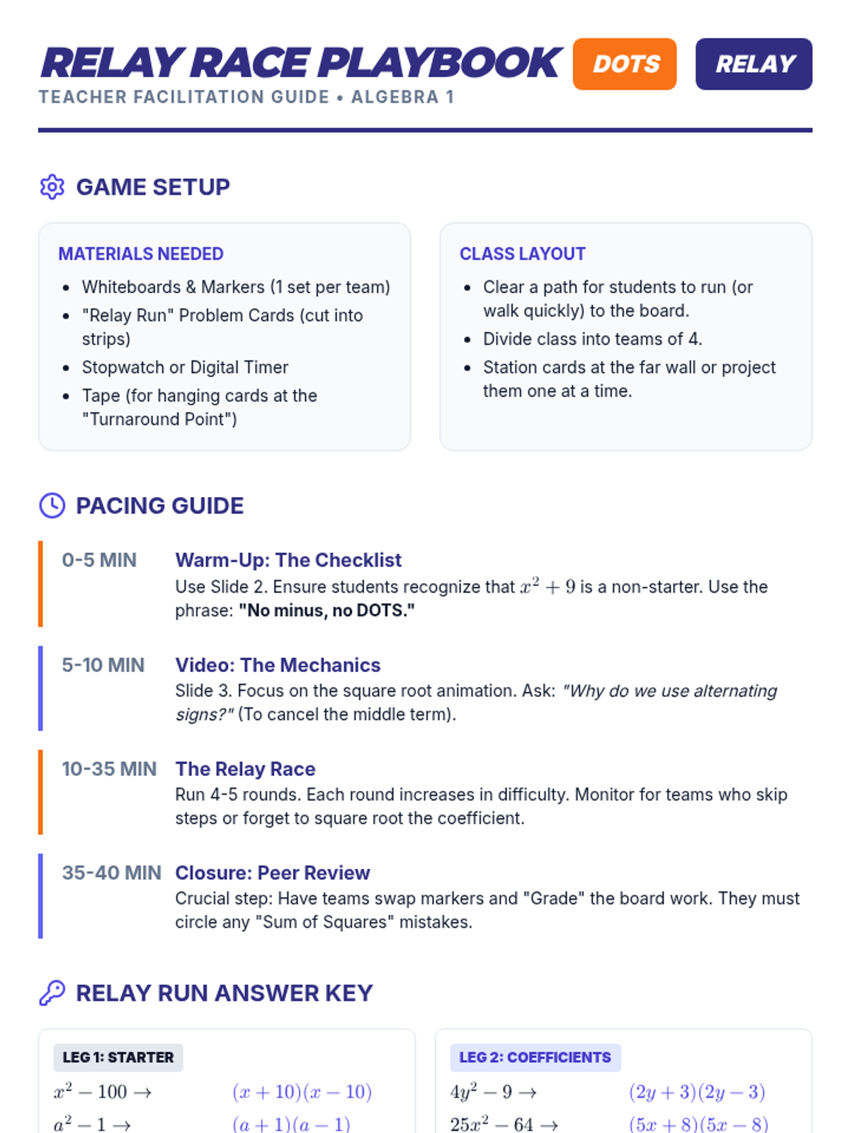 A high-energy, competitive lesson focused on building fluency in factoring the Difference of Two Squares (DOTS) through a relay race activity. Students move from basic pattern recognition to advanced binomial factoring involving coefficients and higher powers.
