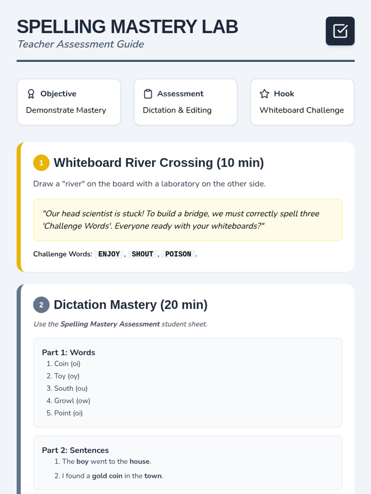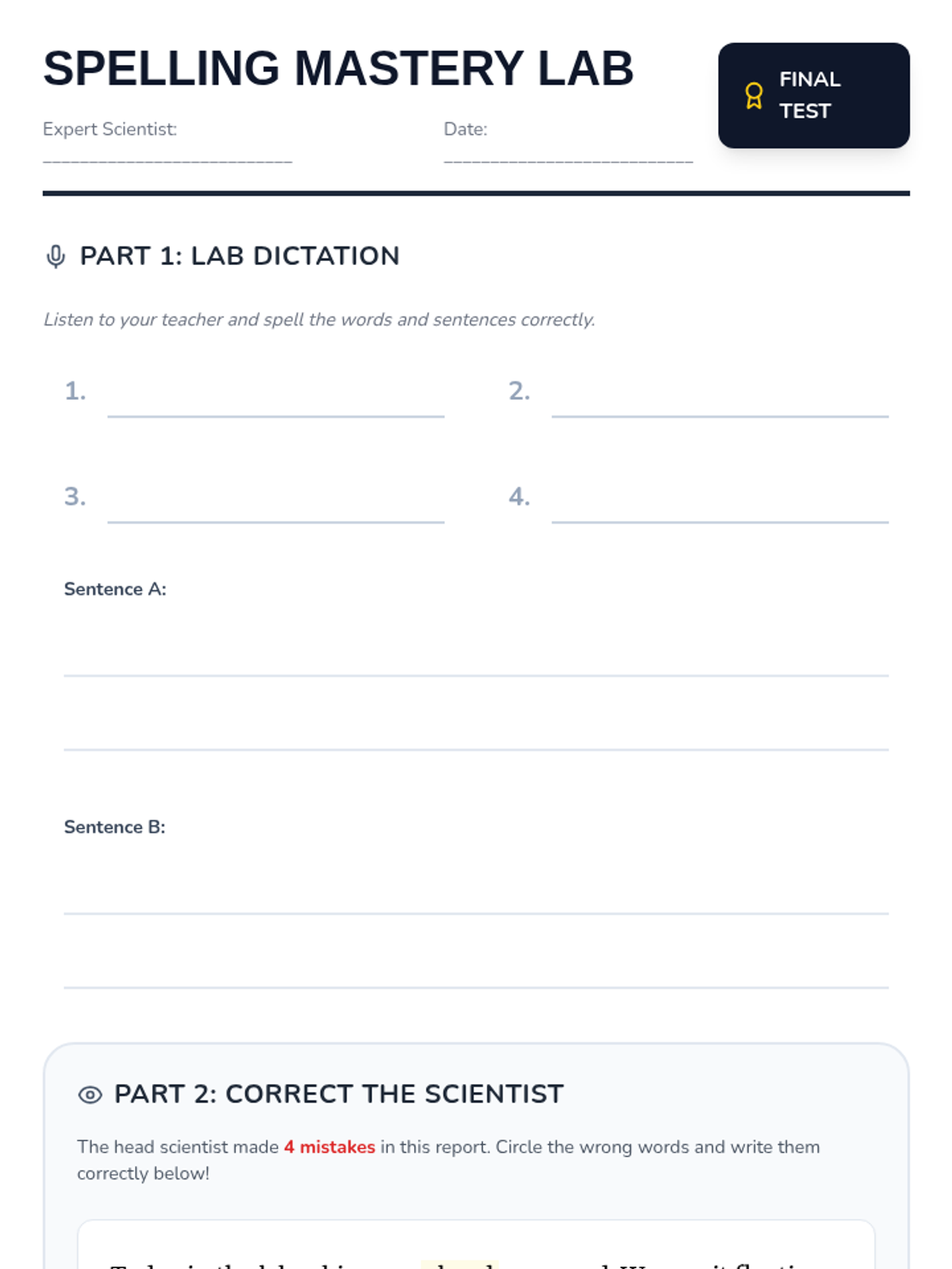 A final assessment of spelling mastery and application. Students demonstrate proficiency through dictation, editing, and a whiteboard challenge.