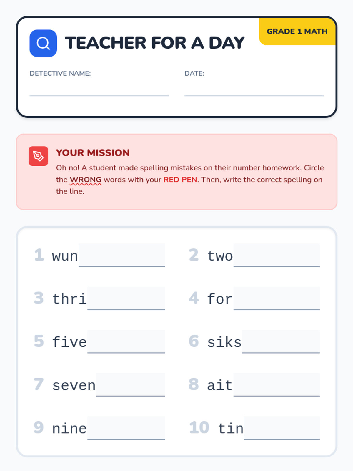 A 1st Grade lesson where students become 'Number Word Detectives' to identify and fix spelling errors in number words 1-10 using a video reference.