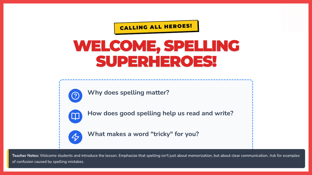 A Tier 2 intervention lesson for 7th-grade students focusing on mastering tricky spelling patterns through a superhero and detective lens. Students identify common errors, learn visual and mnemonic strategies, and apply them in a collaborative game.
