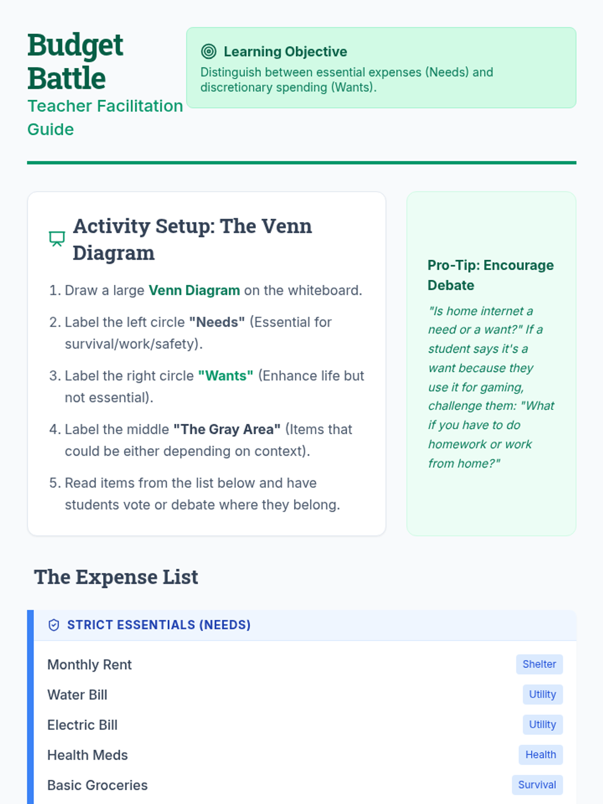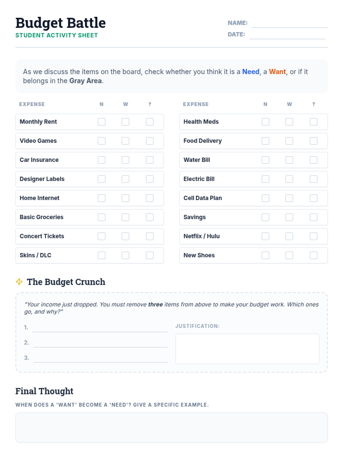 A lesson focused on distinguishing between essential needs and discretionary wants to build foundational financial literacy and budgeting skills.