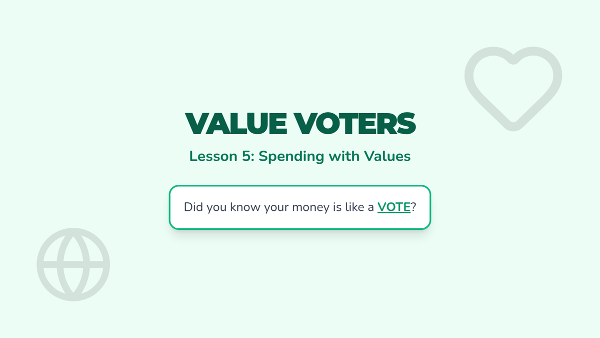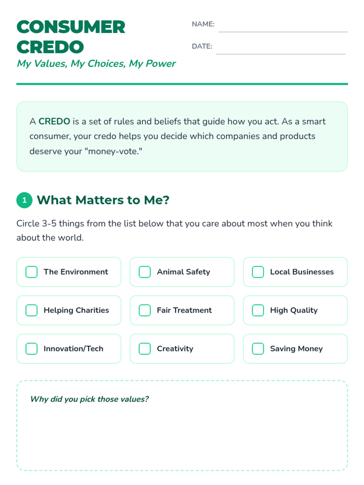 Students reflect on their personal values to create a 'Consumer Credo,' learning how to use their spending power to support causes they care about.