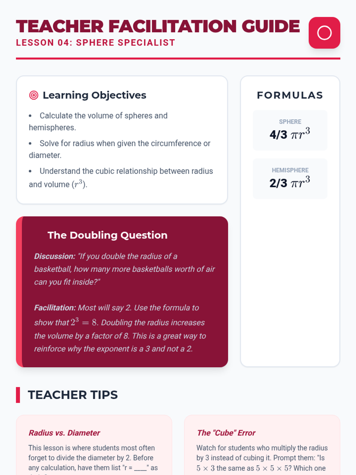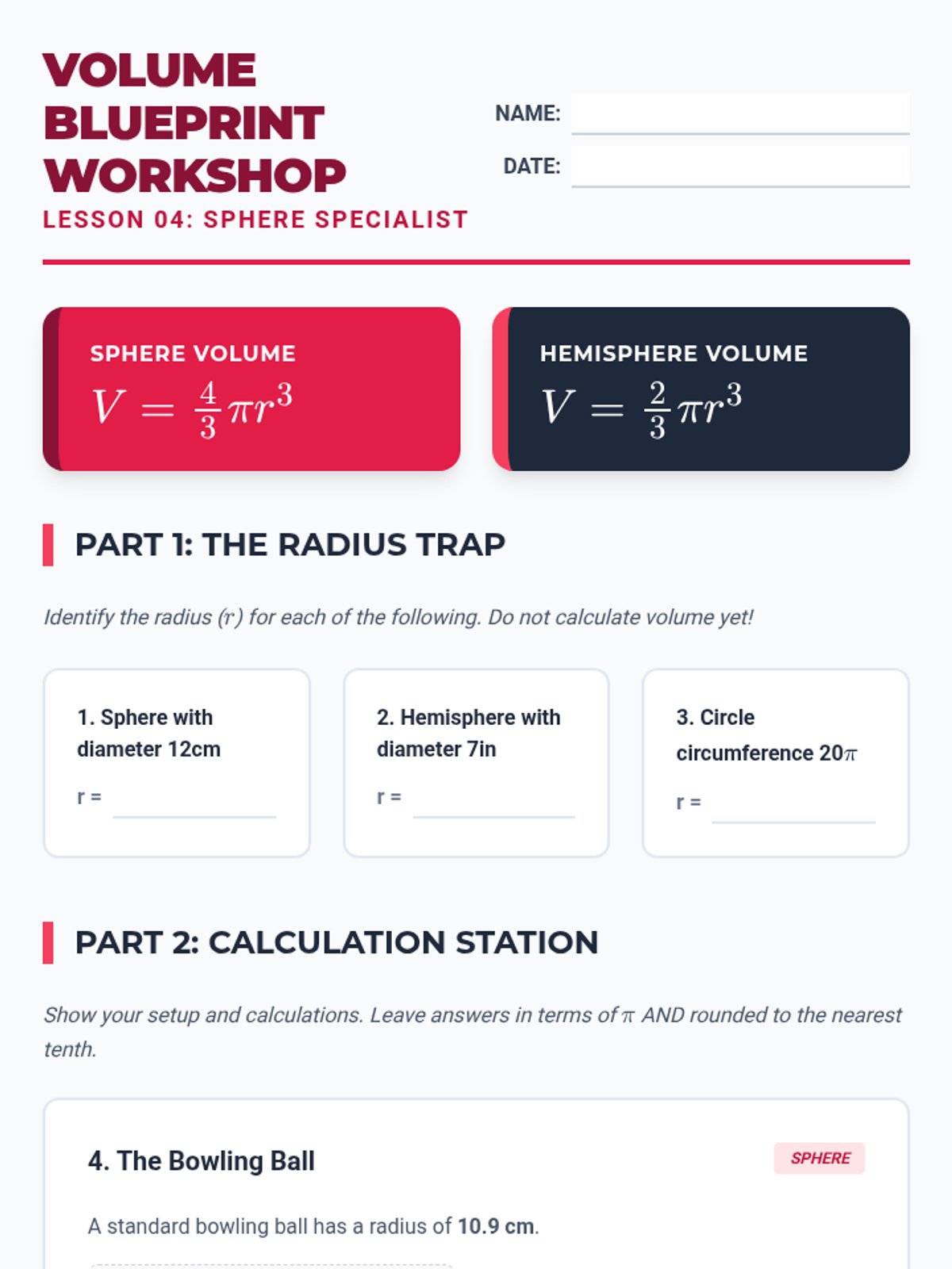 Students explore the volume formula for spheres and hemispheres, performing algebraic manipulations to solve for radius or volume in various contexts.