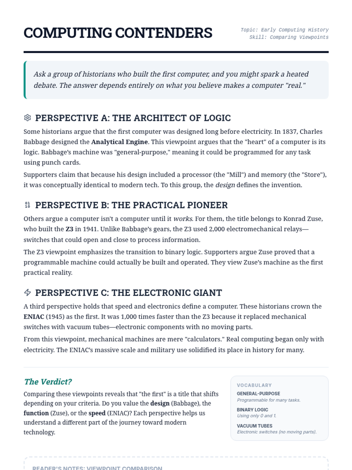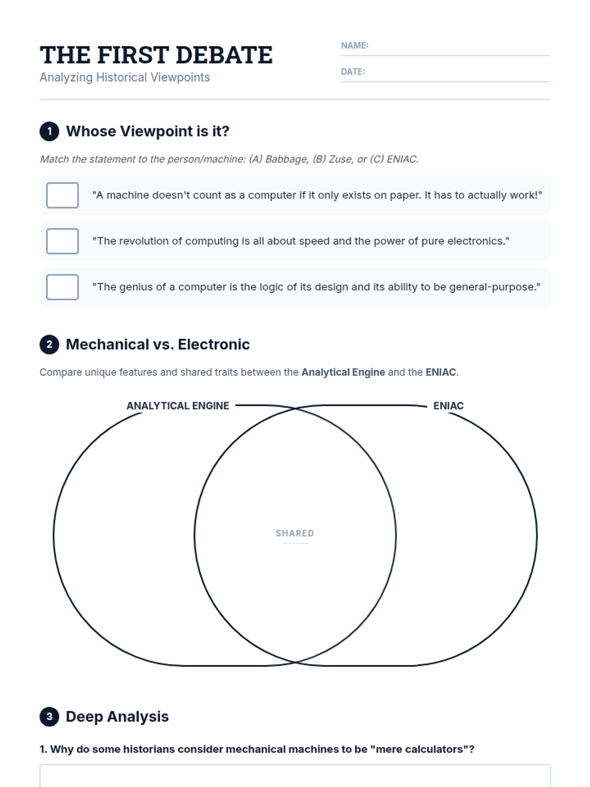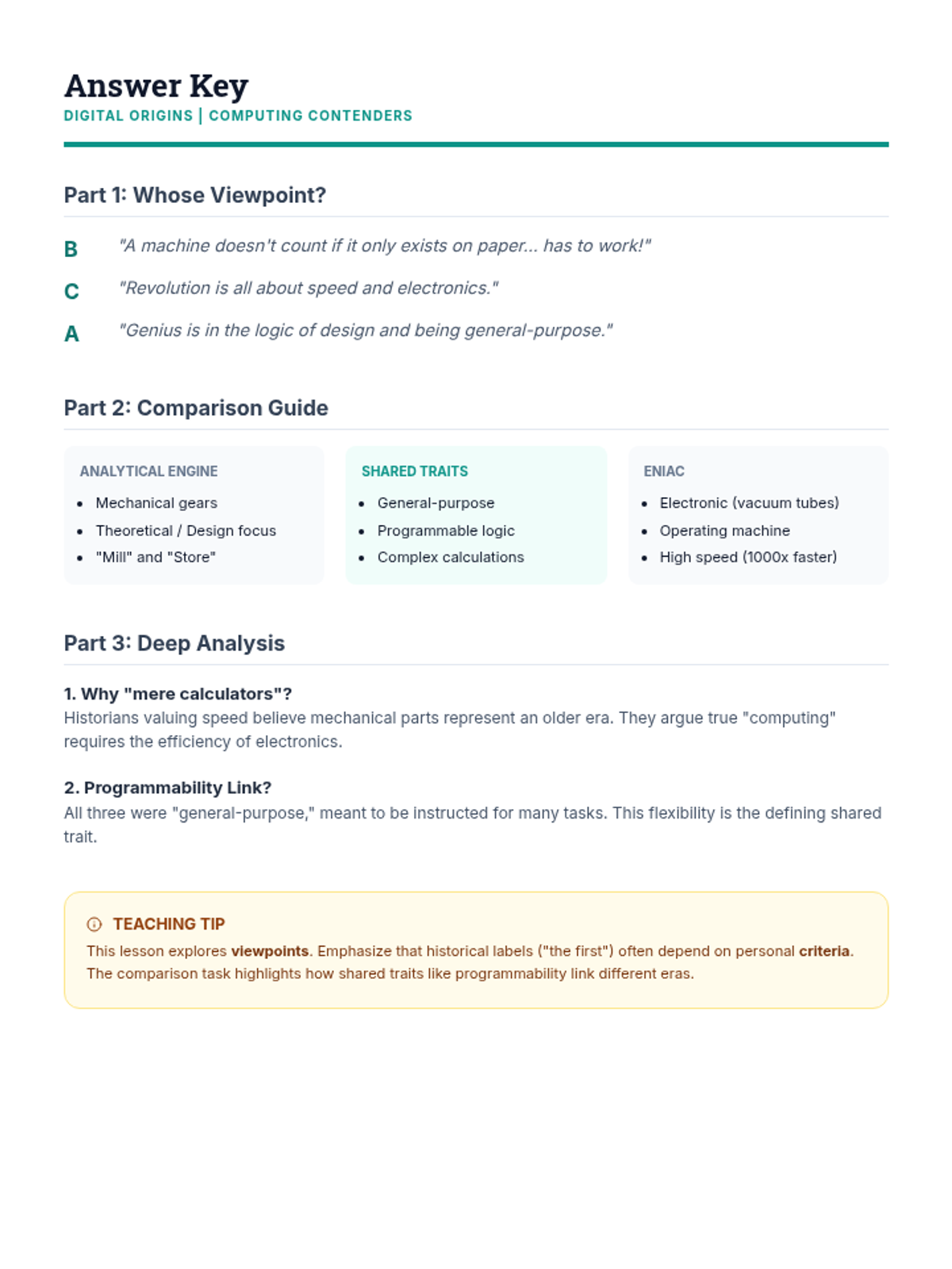 A lesson exploring the evolution of early computing machines and the varying historical perspectives on which machine deserves the title of the 'first' computer. Students will analyze different viewpoints based on technical criteria like programmability, electronics, and logic.