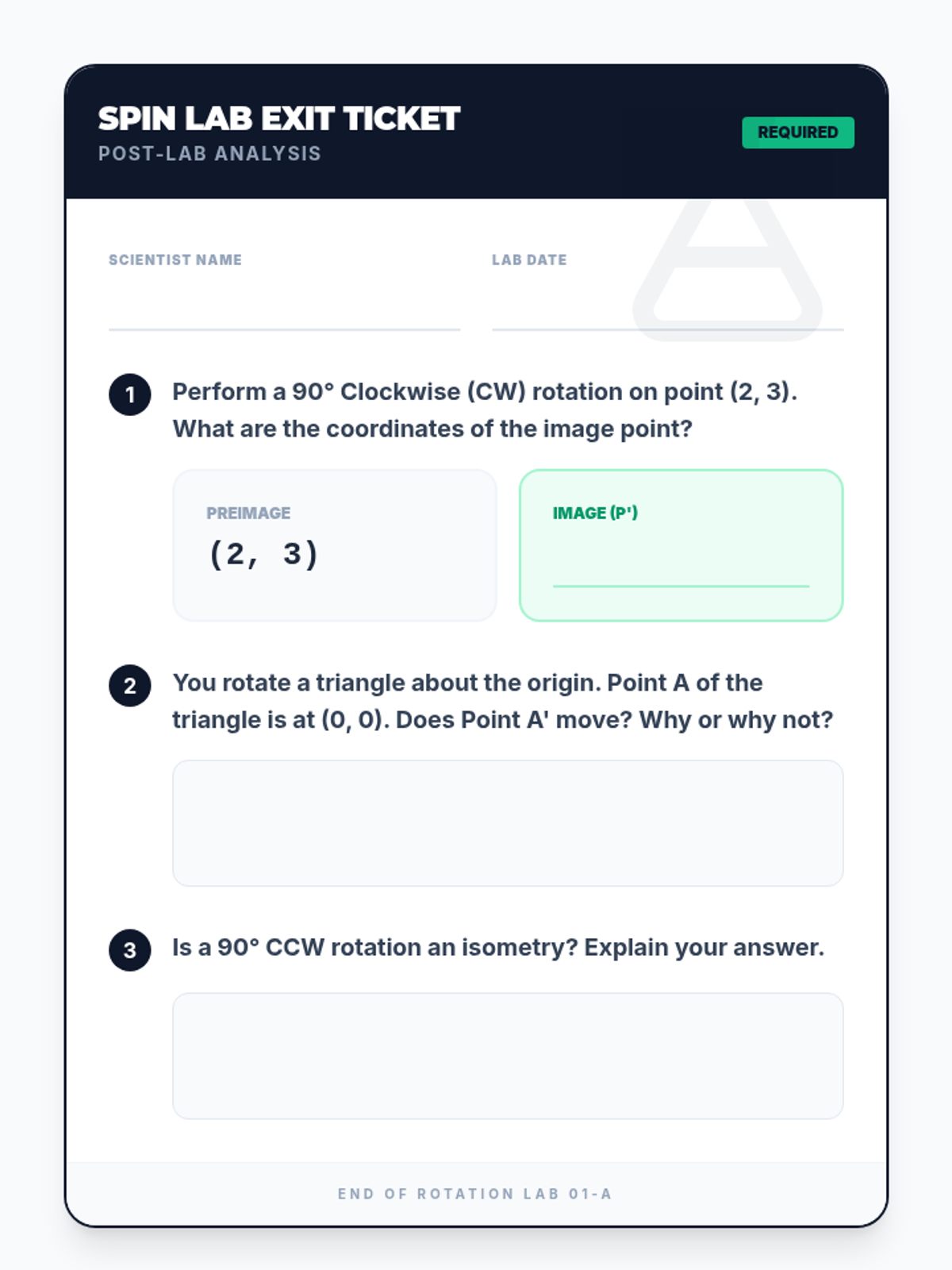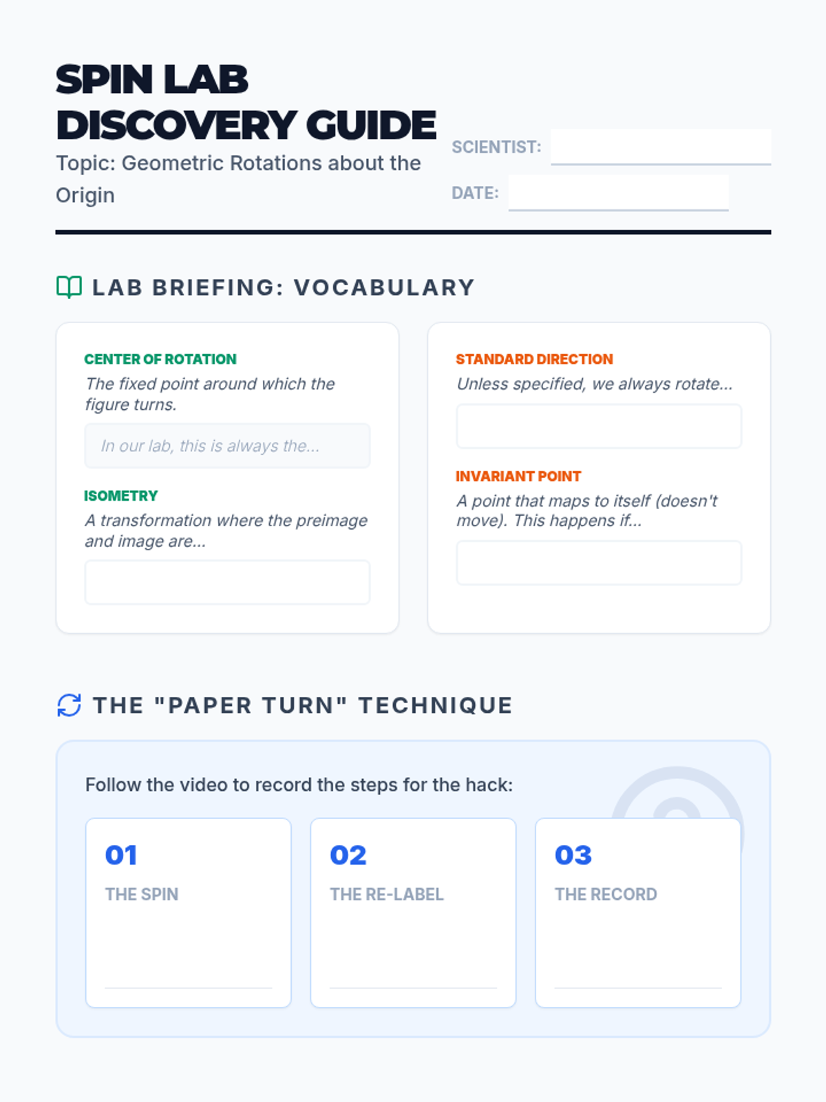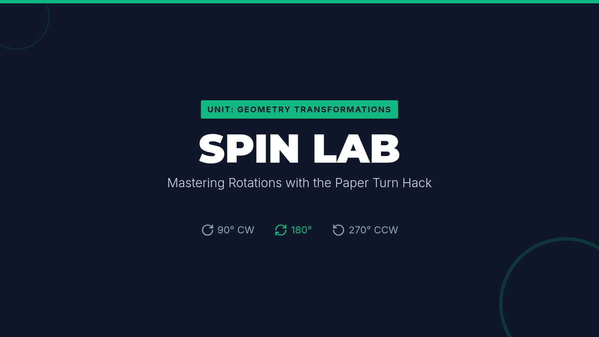 A hands-on geometry lesson for 8th-grade students to master rotations using the 'paper turn' technique. Students use transparencies to physically manipulate shapes and identify coordinates after 90, 180, and 270-degree turns.