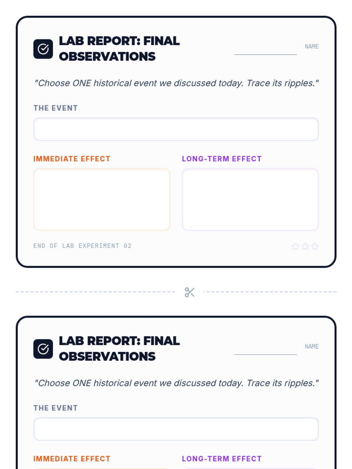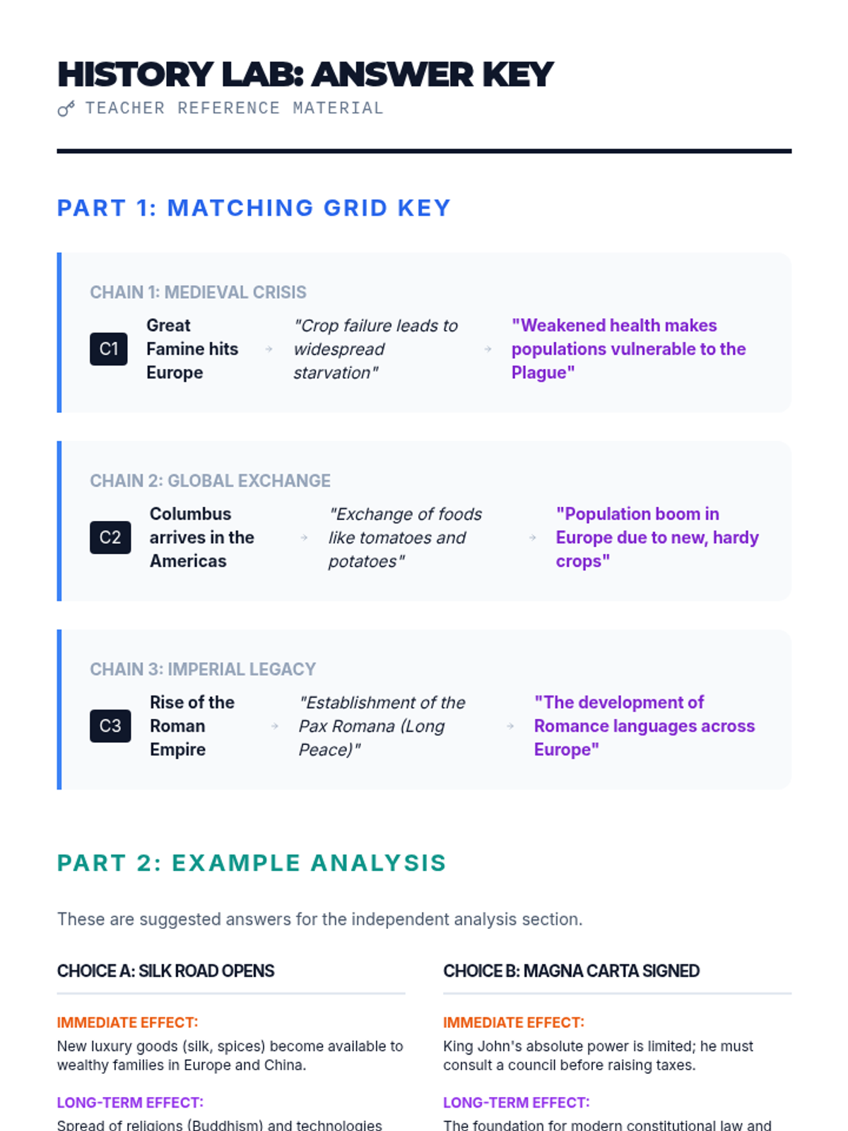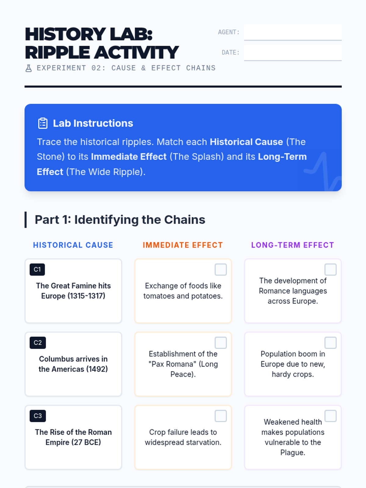 A lesson focused on helping 7th-grade students move beyond simple cause-and-effect pairs to understand complex historical chains and long-term consequences. Students will analyze historical events as 'ripples' that create multiple layers of impact over time.
