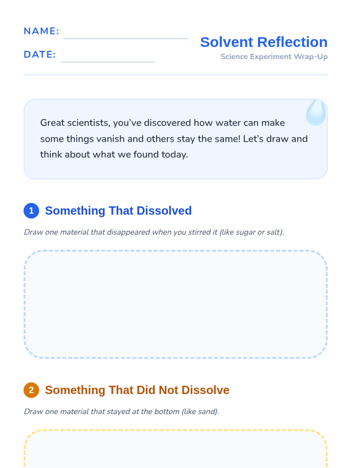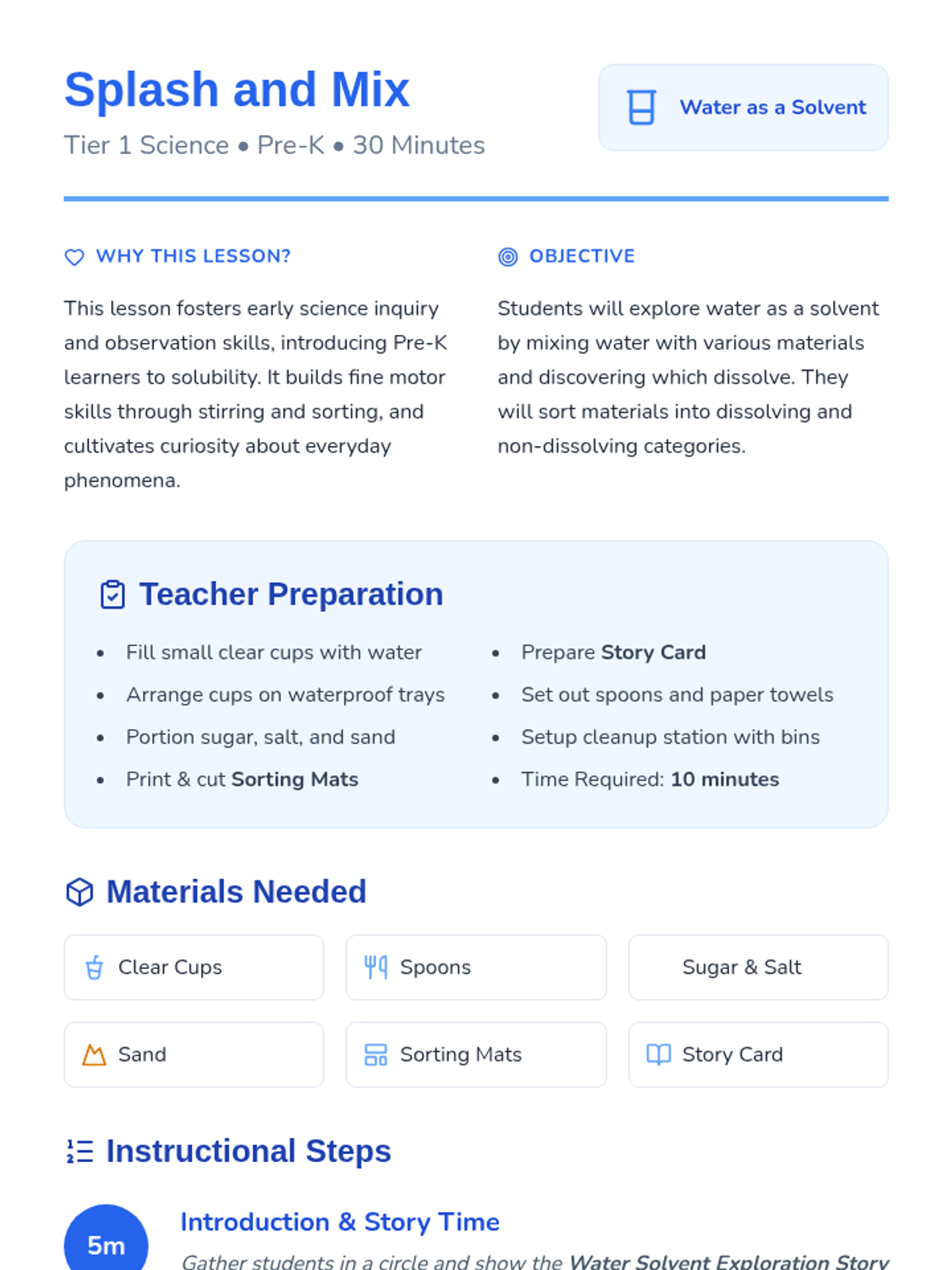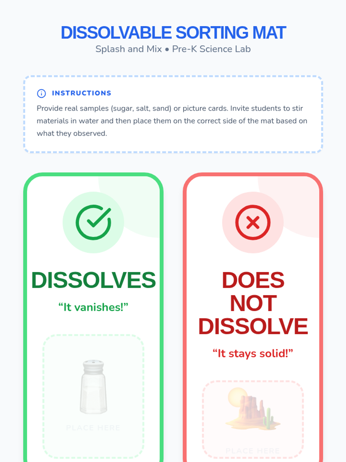 A hands-on Pre-K science lesson exploring water as a solvent through mixing experiments with sugar, salt, and sand. Students observe what dissolves and what stays solid, reinforcing concepts through stories and sorting activities.