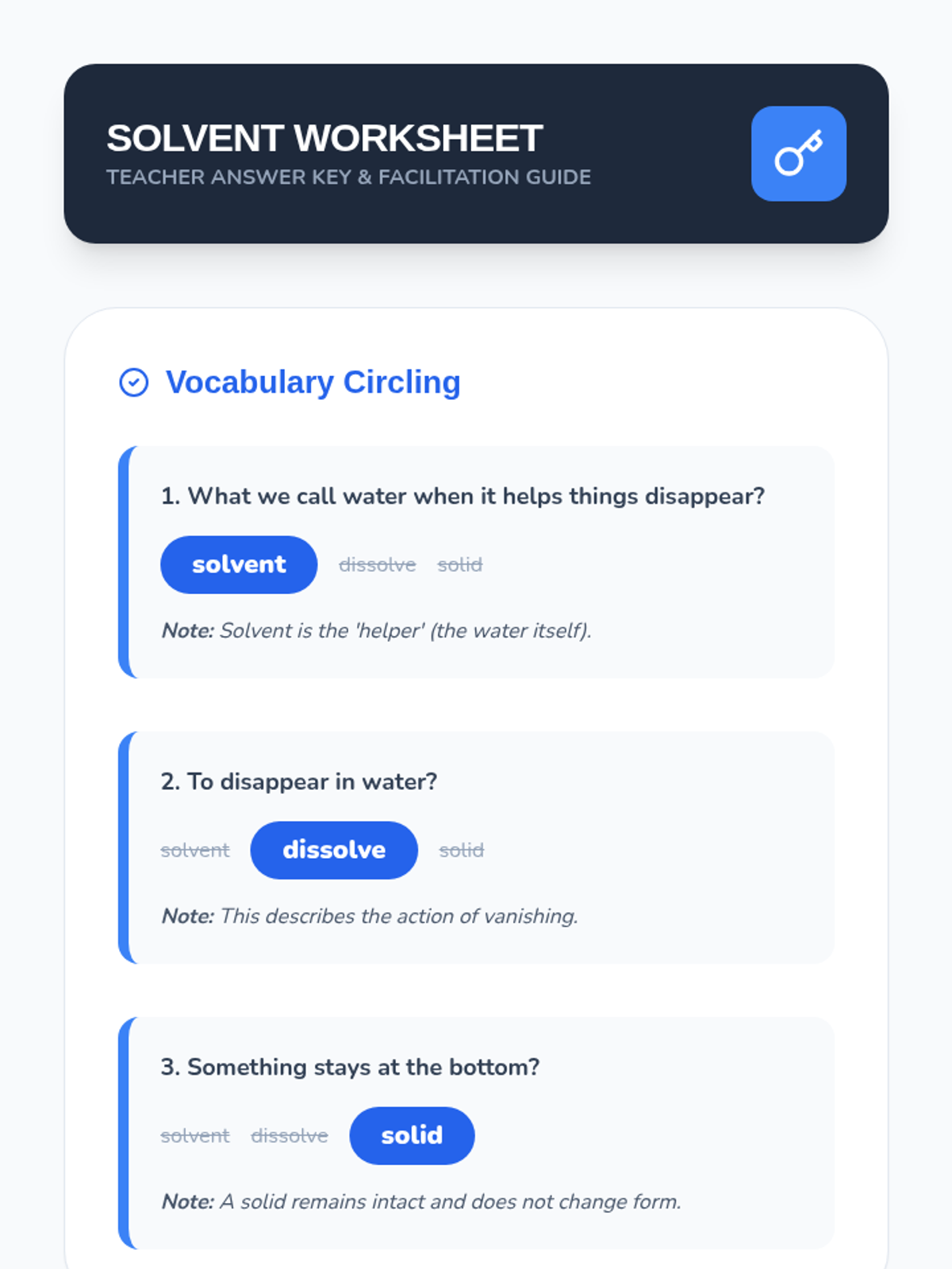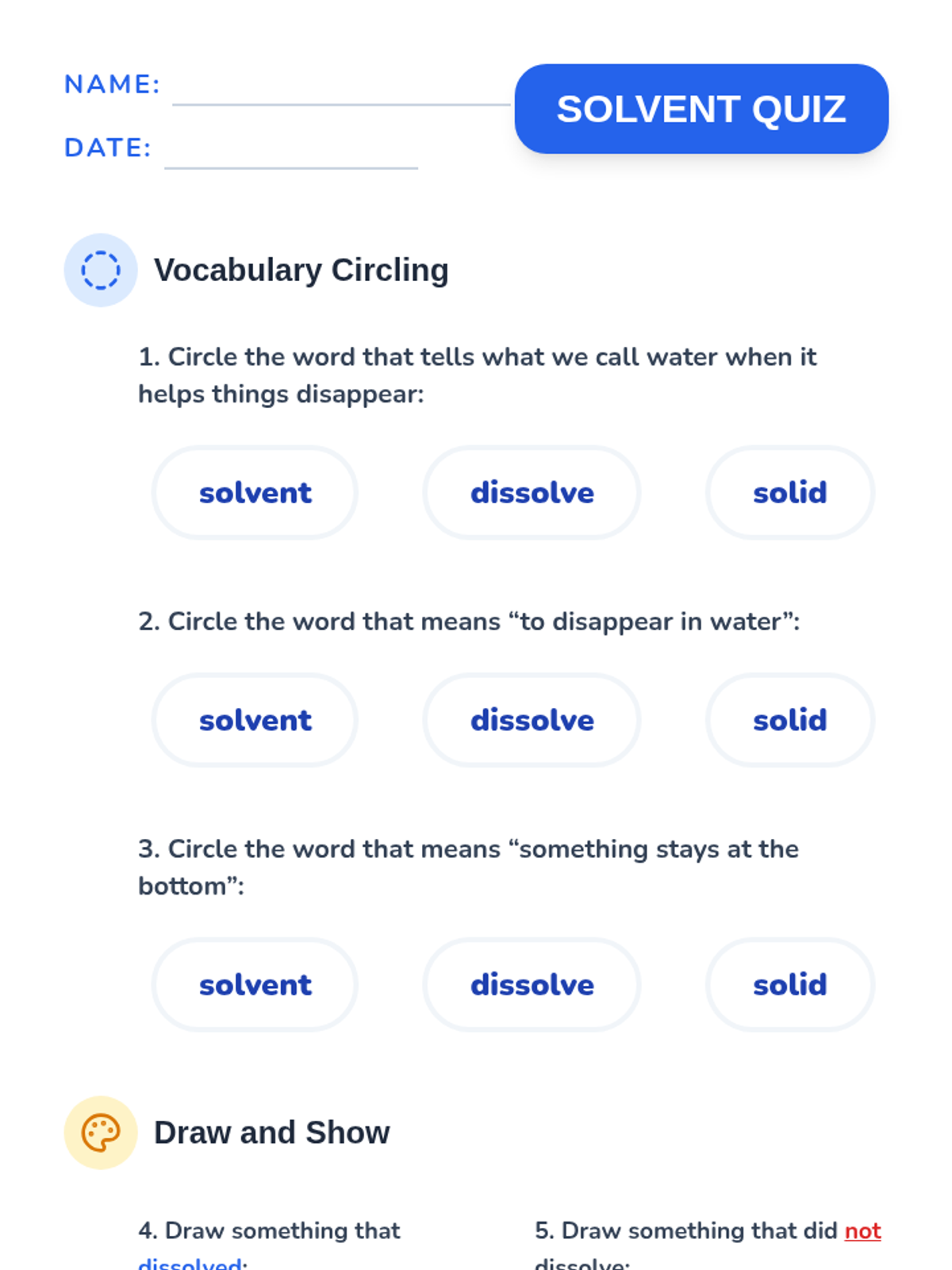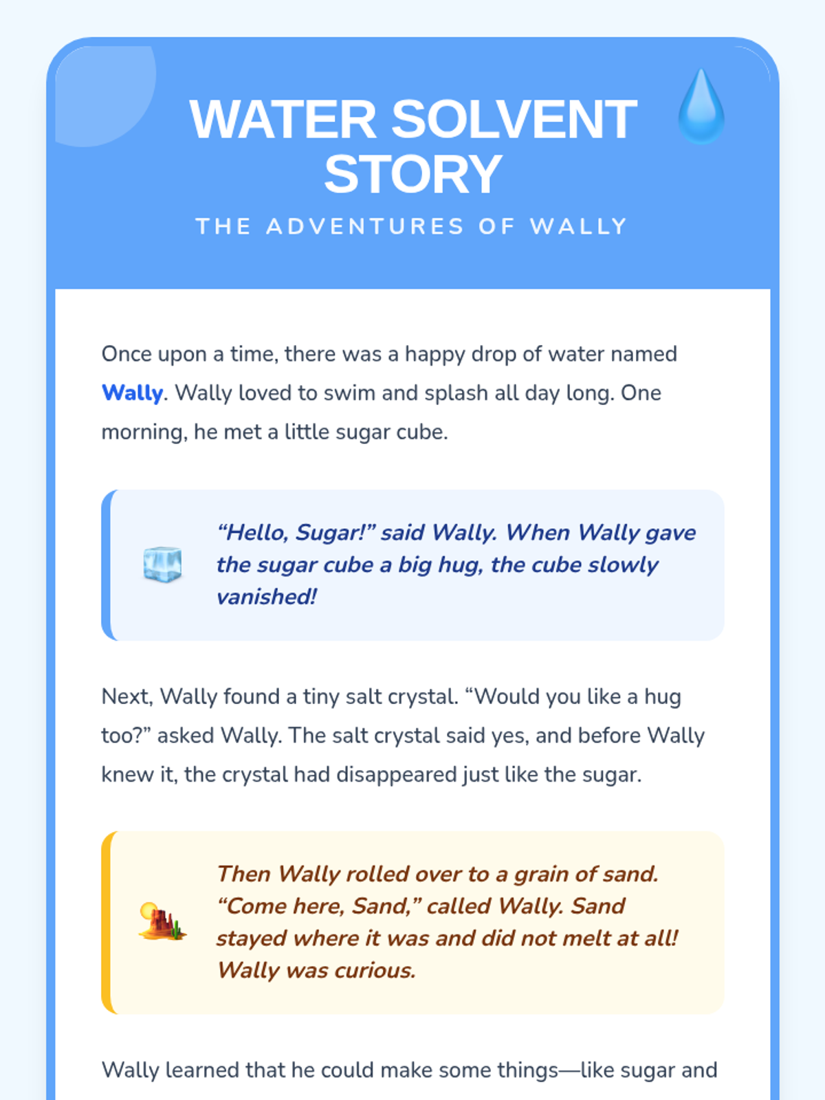 A hands-on Pre-K science lesson exploring water as a solvent through mixing experiments with sugar, salt, and sand. Students observe what dissolves and what stays solid, reinforcing concepts through stories and sorting activities.