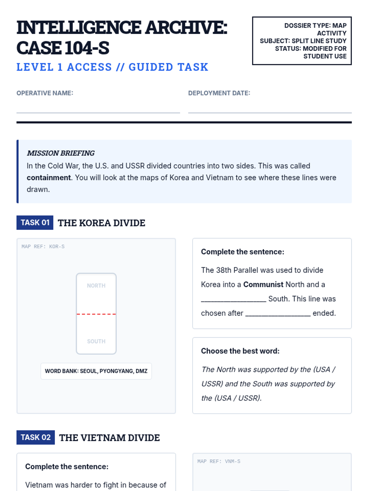 Students analyze the parallels between the Korean and Vietnam Wars through map work and a comparative timeline, focusing on the policy of containment and the division of nations.
