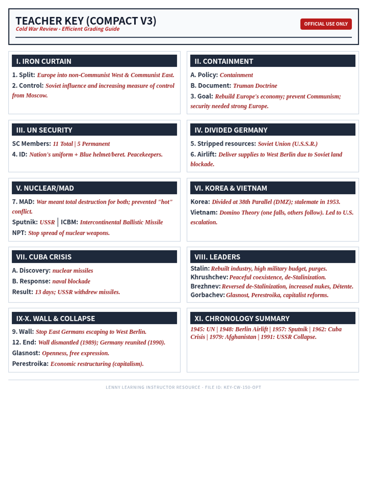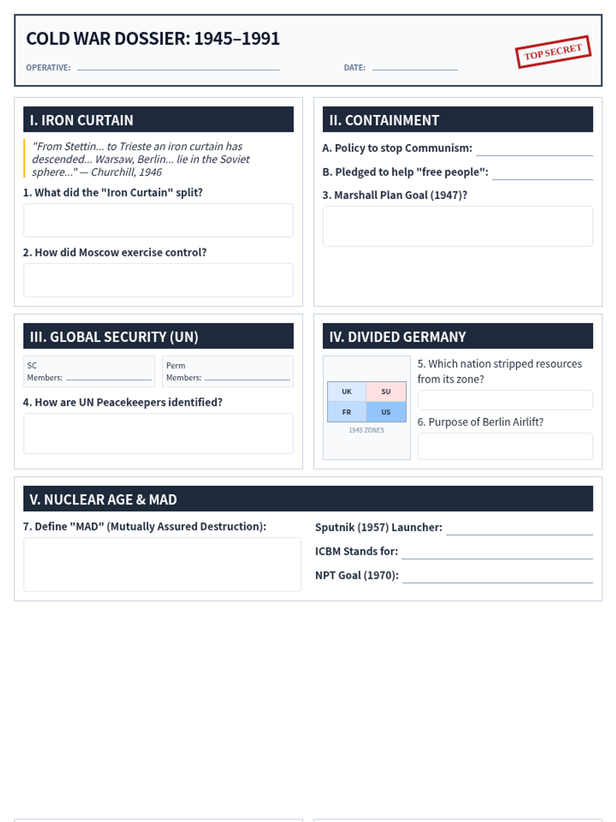 A comprehensive review of the Cold War era (1945–1991), focusing on key leaders, proxy wars, nuclear tension, and the eventual collapse of the Soviet Union. Includes a detailed student dossier assignment and teacher answer key.