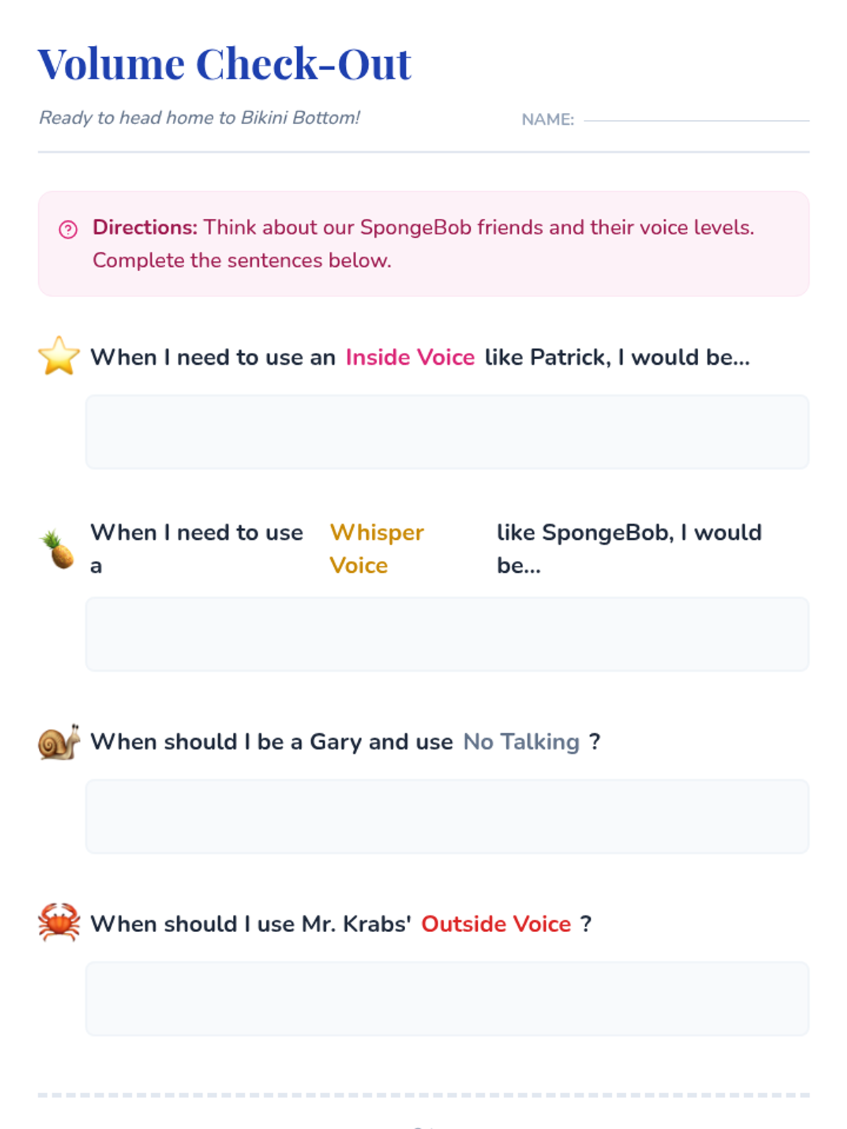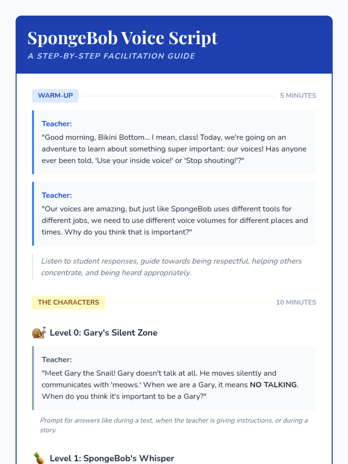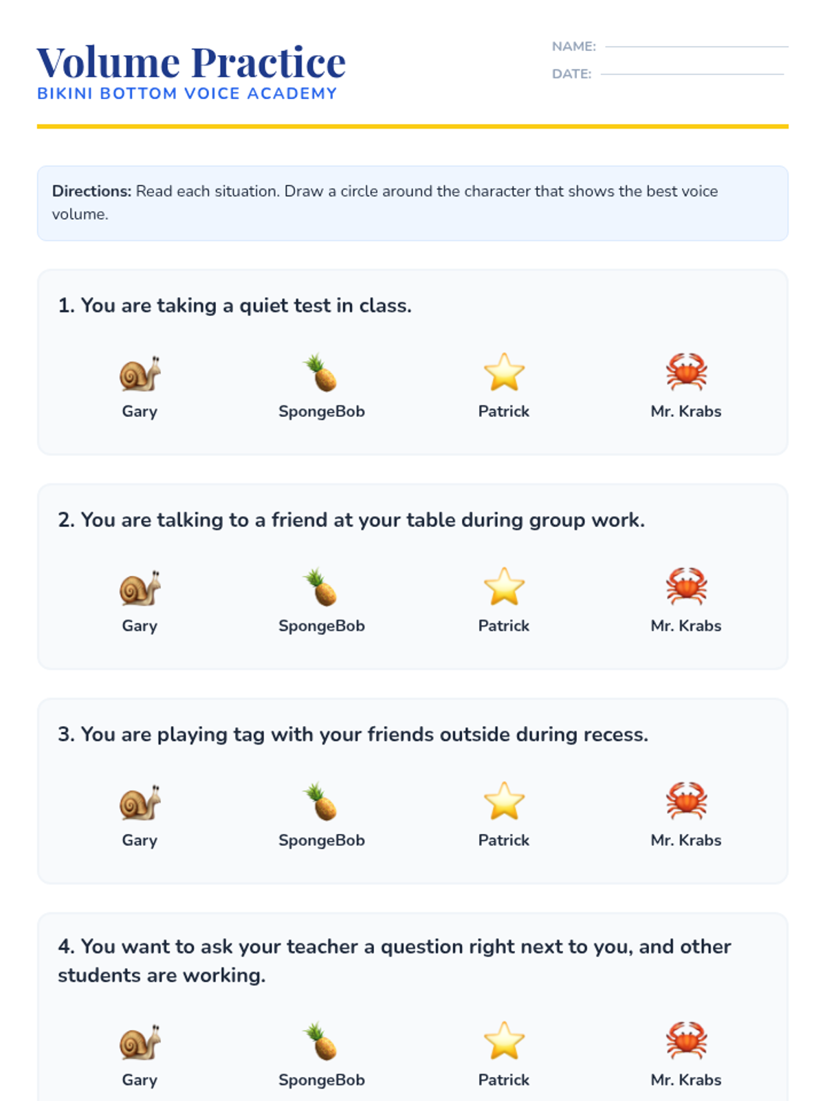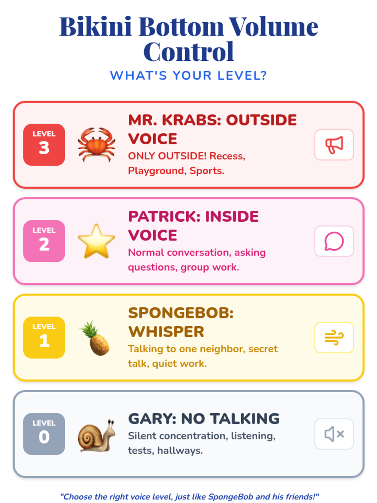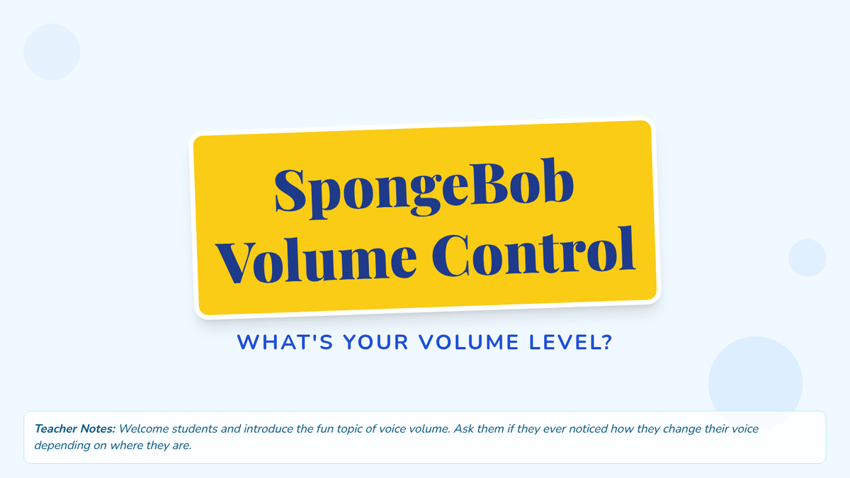 A fun, interactive lesson using beloved SpongeBob characters to help 1st-grade students understand and practice appropriate voice volume in various classroom settings.