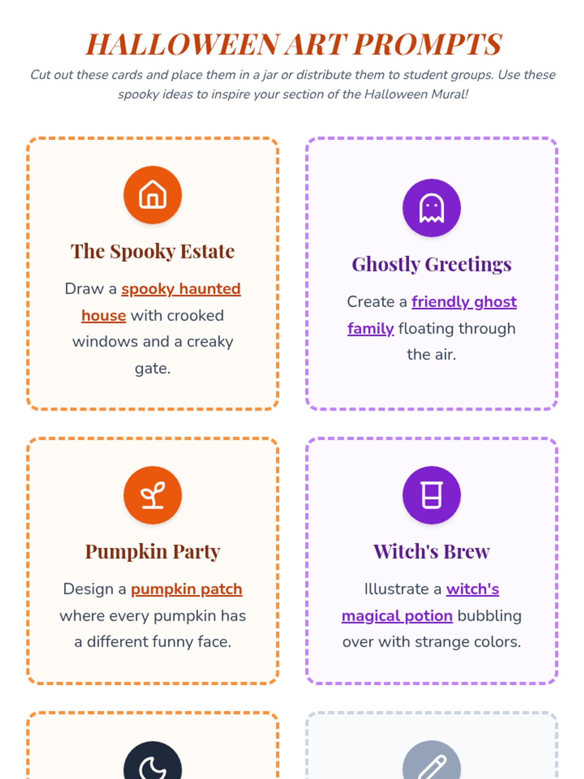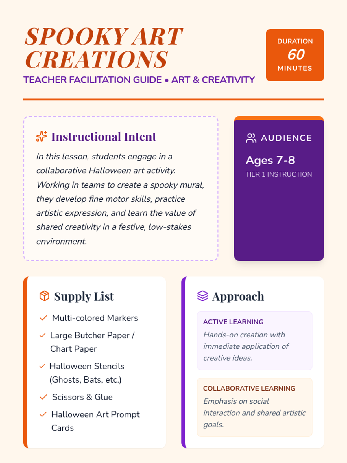 A festive and collaborative art lesson where students create a Halloween mural using markers, stencils, and creative prompts. Focuses on teamwork and fine motor skills for 7-8 year olds.