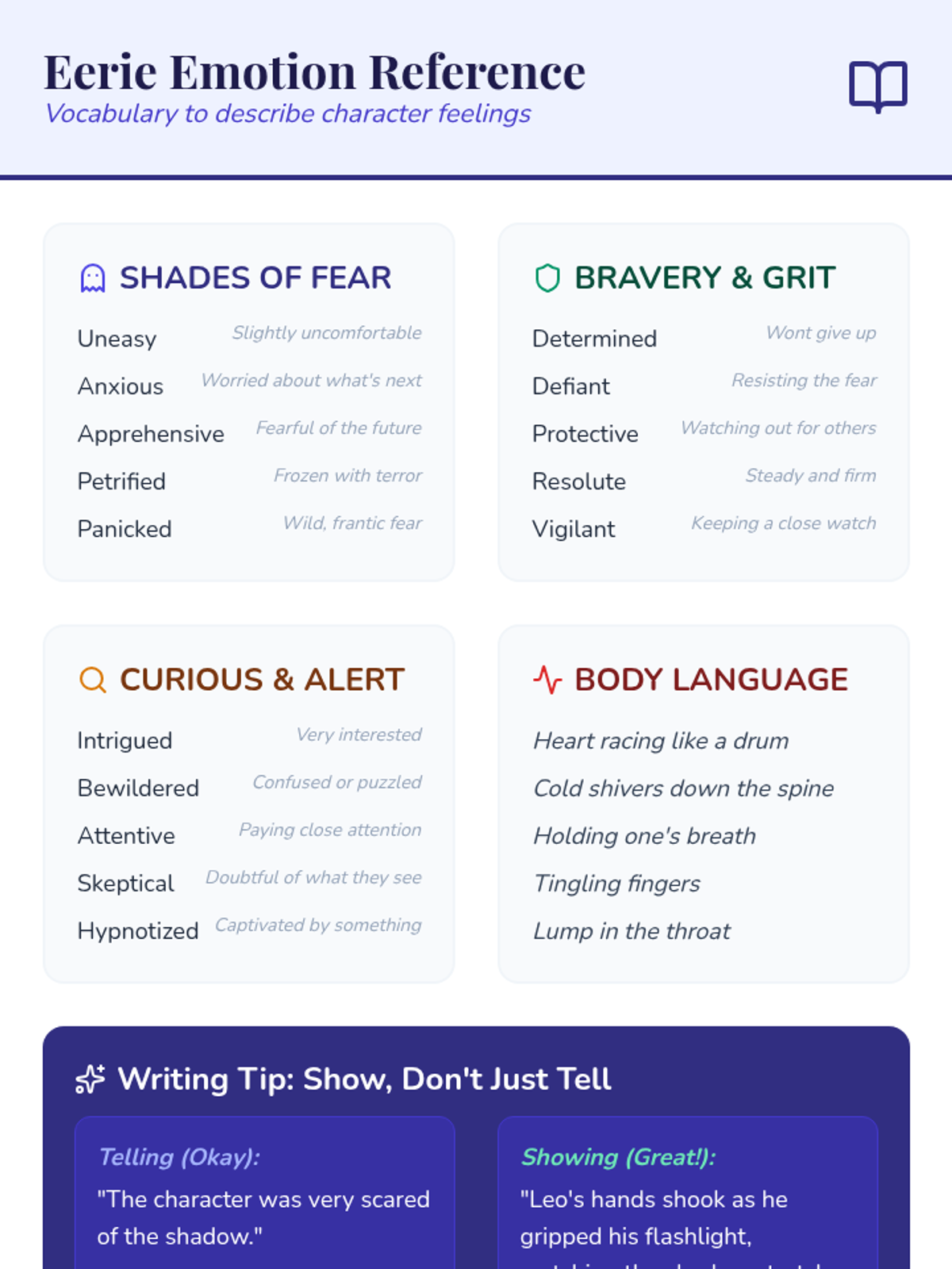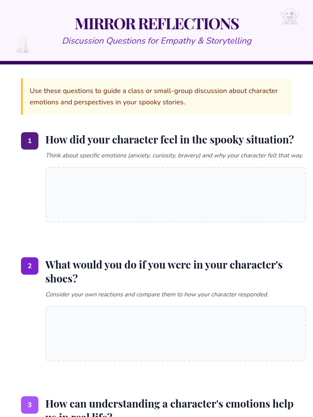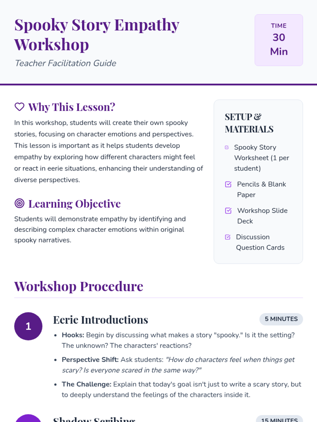 A 30-minute creative writing workshop for grades 3-5 that uses spooky scenarios to help students explore character emotions and develop empathy. Students brainstorm, write, and share eerie tales while reflecting on diverse perspectives.