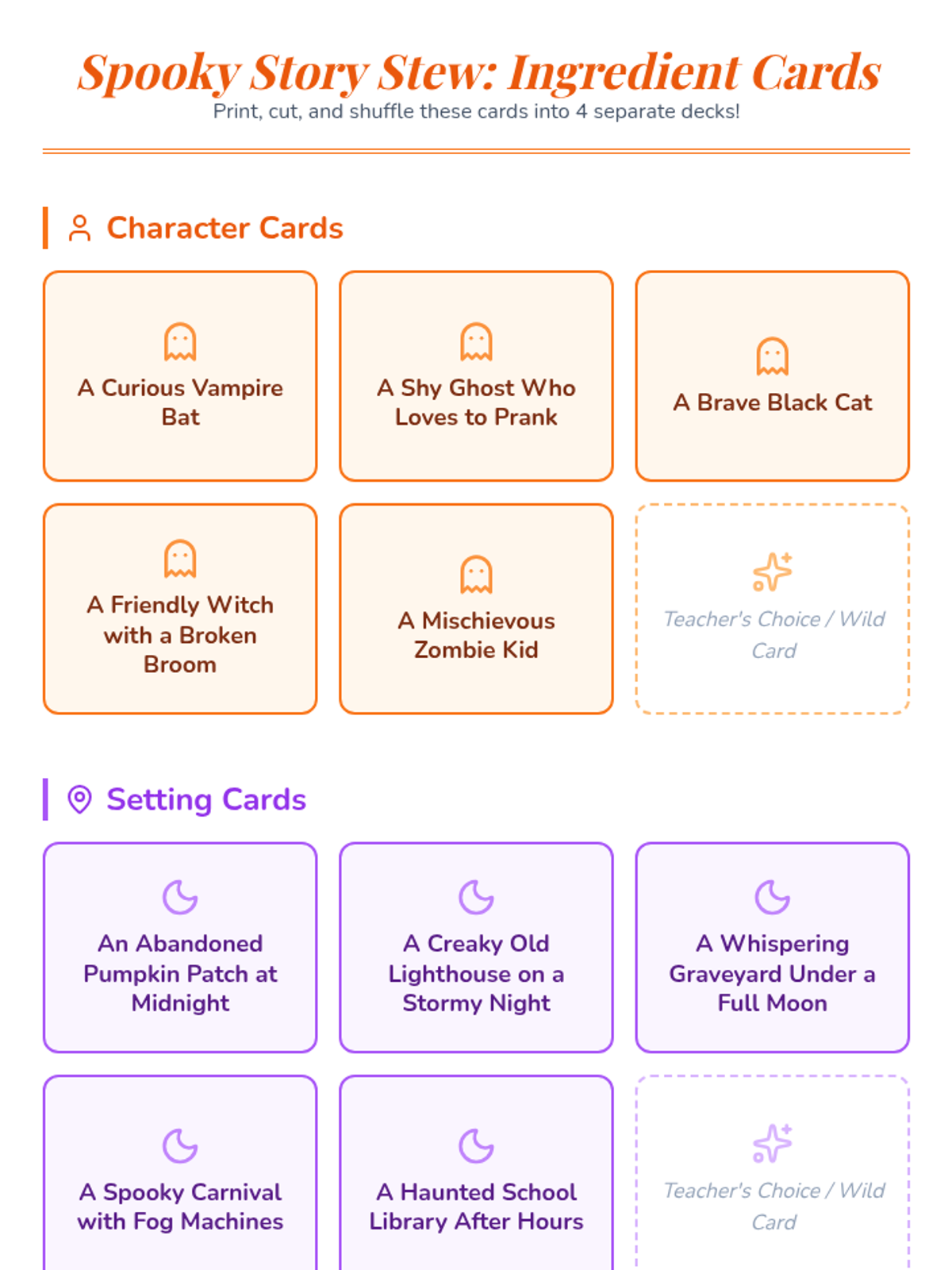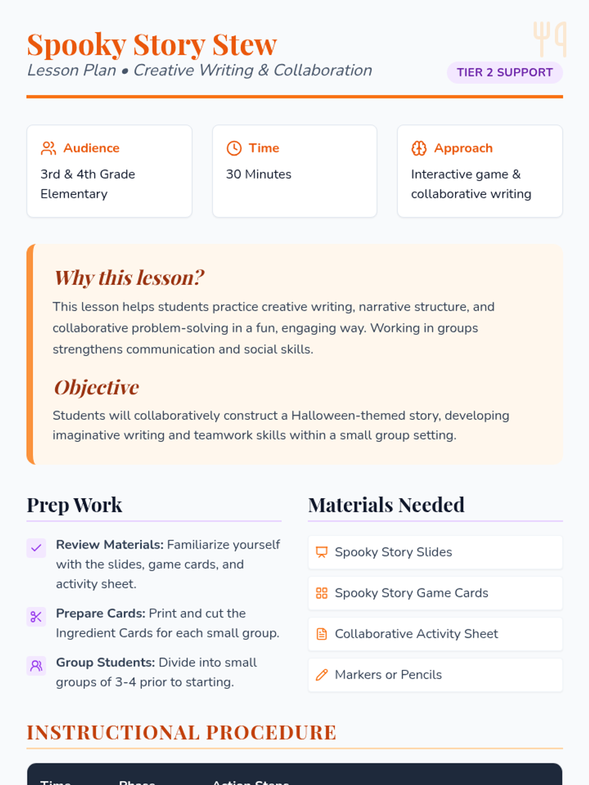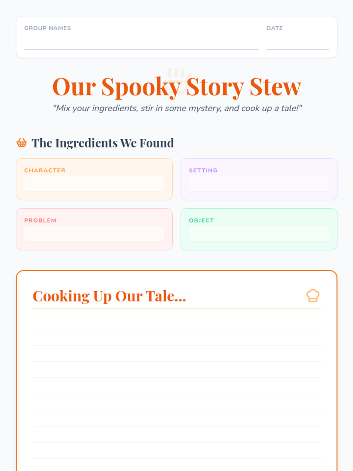 A 30-minute creative writing lesson for 3rd and 4th graders where they collaboratively 'cook up' Halloween stories using random ingredient cards.