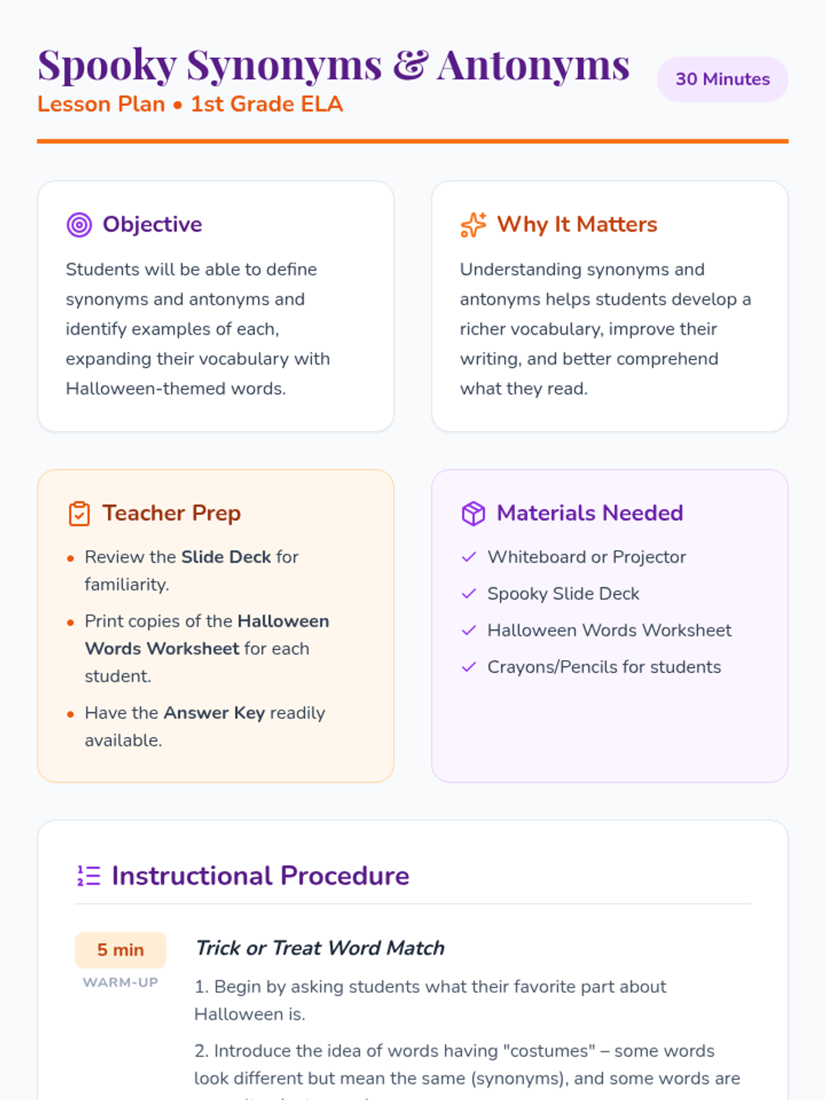 This bewitching 30-minute lesson introduces 1st-grade students to synonyms and antonyms using fun Halloween examples to expand vocabulary and reading comprehension.