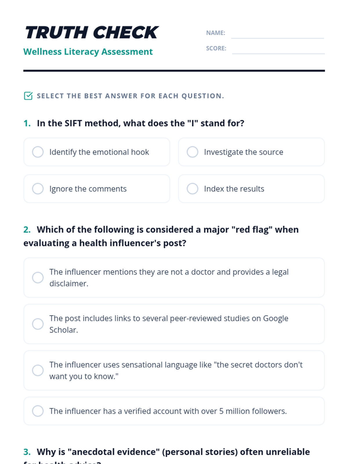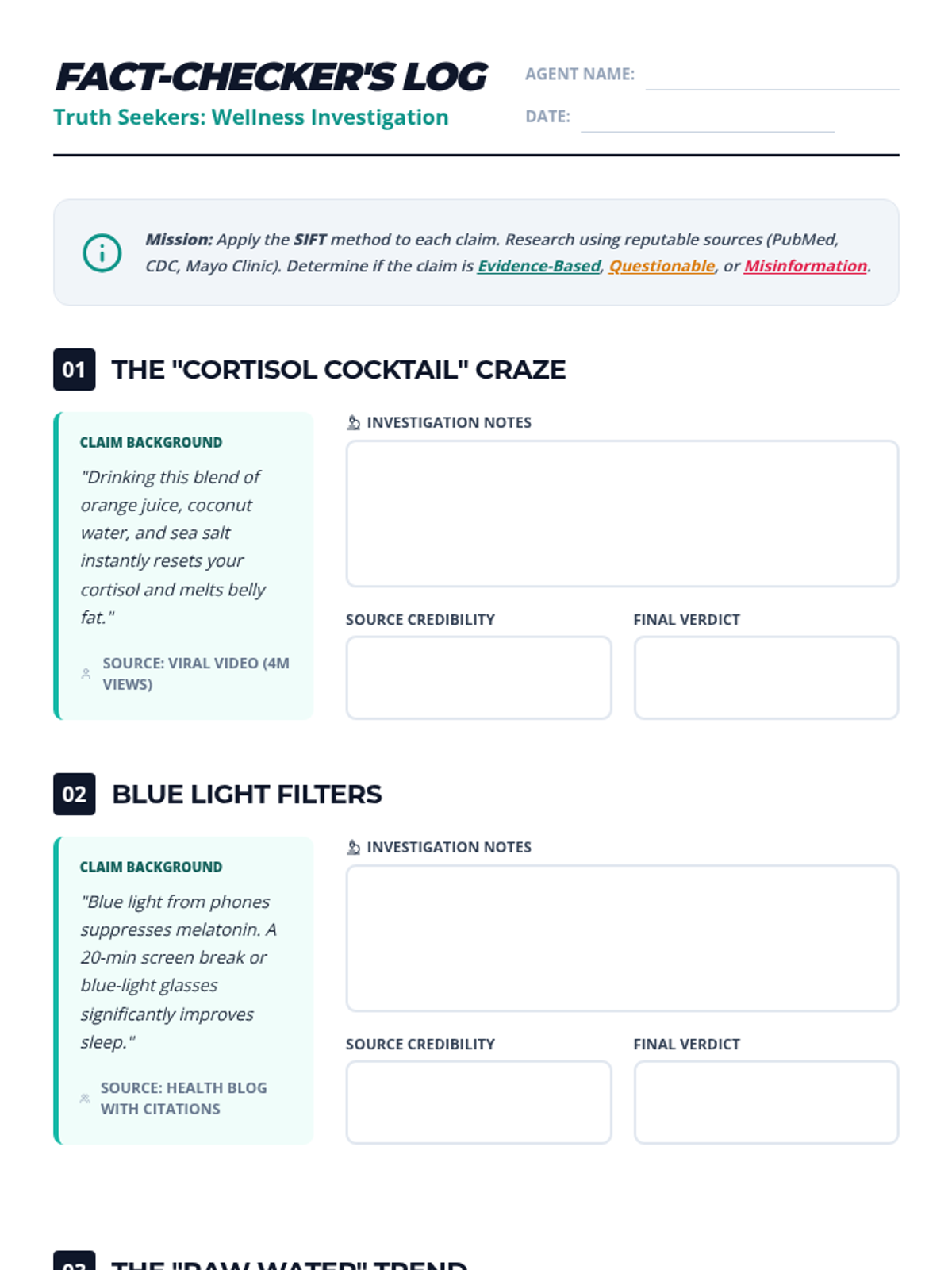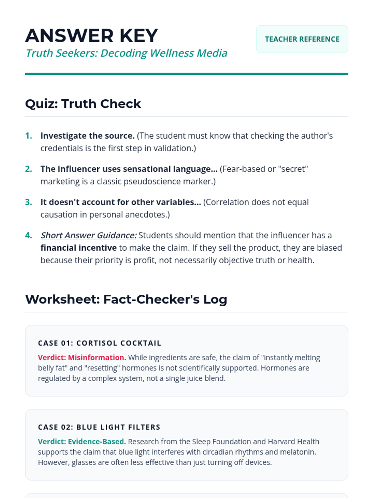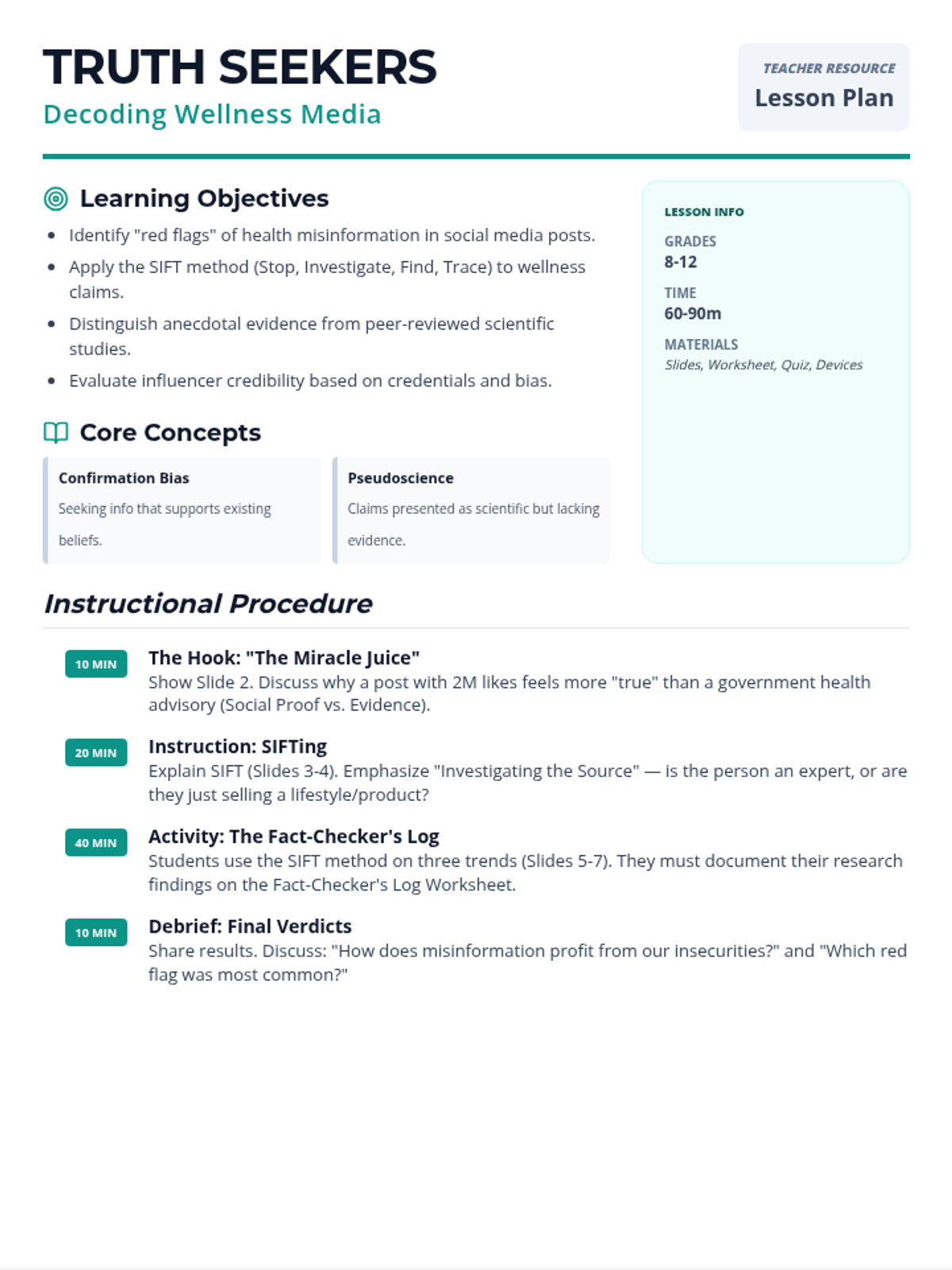 A high school media literacy lesson focused on evaluating health and wellness claims on social media. Students learn to apply the SIFT method to distinguish between scientific evidence and viral misinformation.