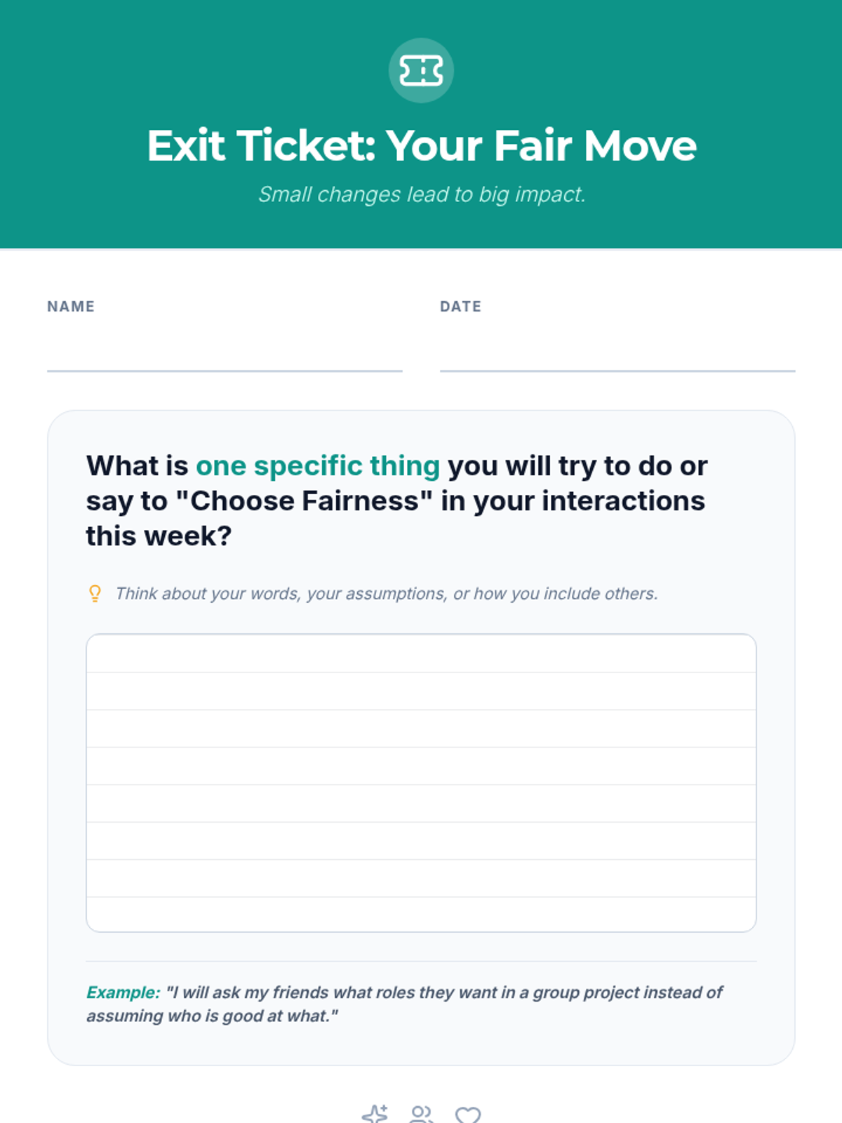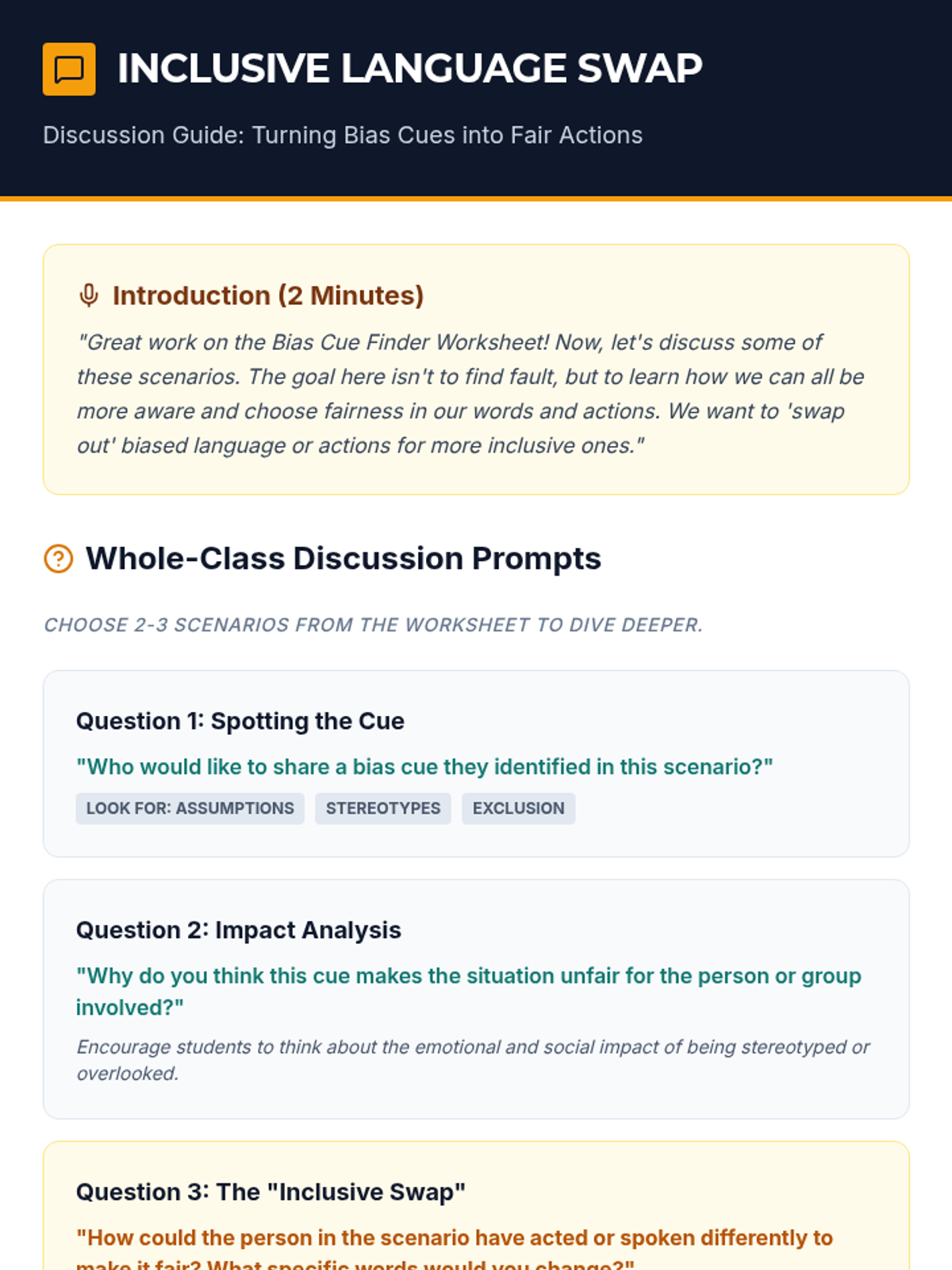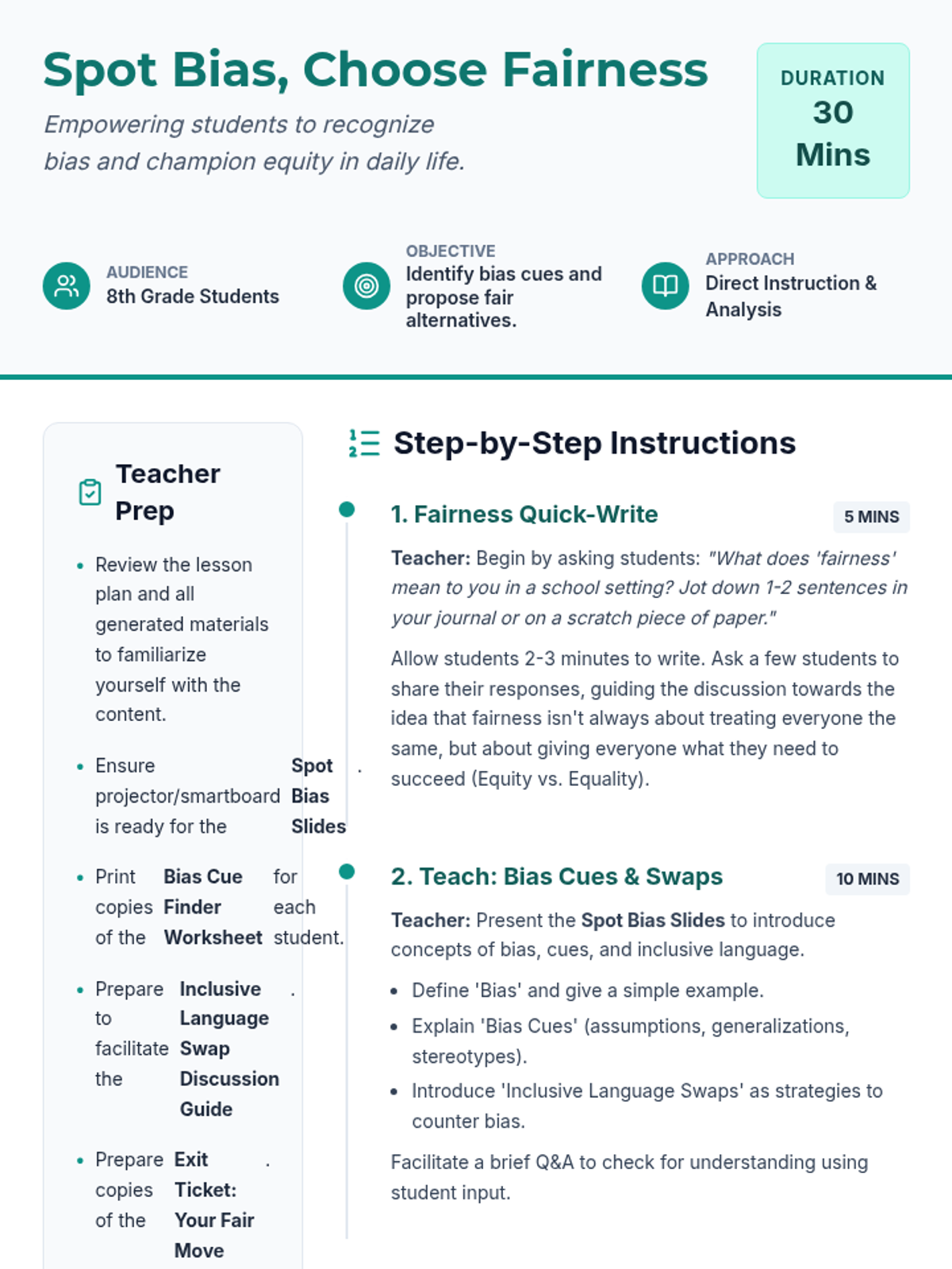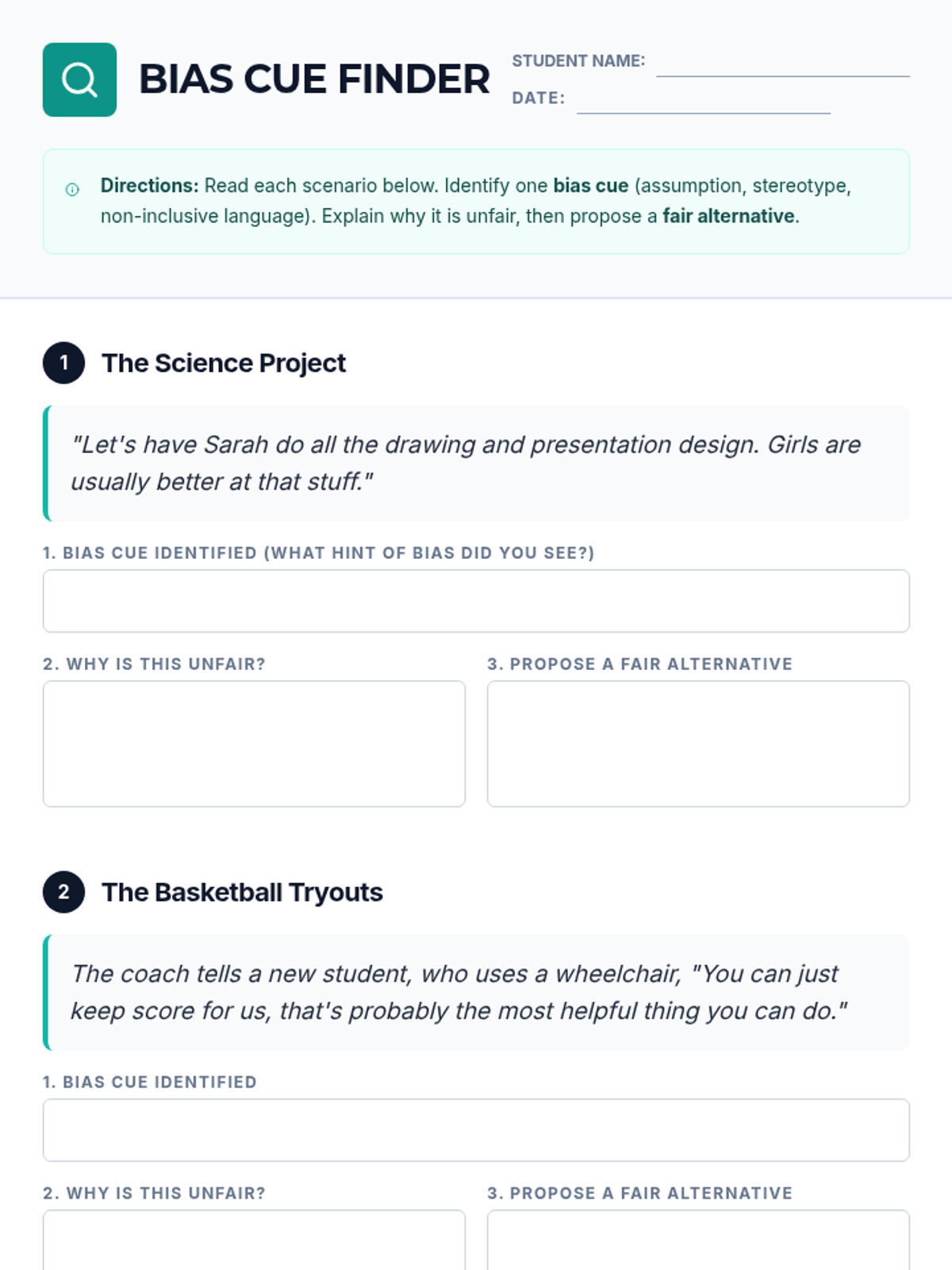 This lesson helps 8th-grade students identify bias cues in everyday scenarios and propose fair, inclusive alternative actions. By understanding bias, students will be better equipped to promote equity and fairness in their interactions.