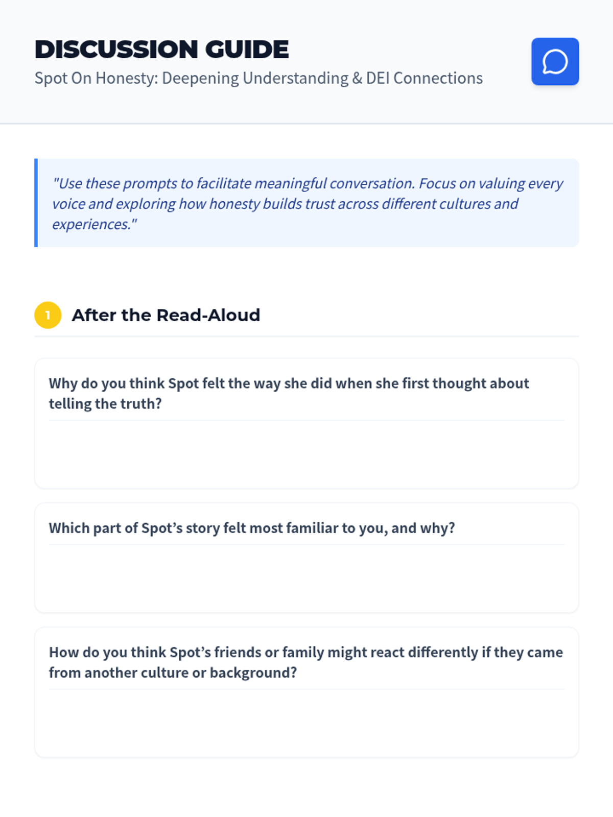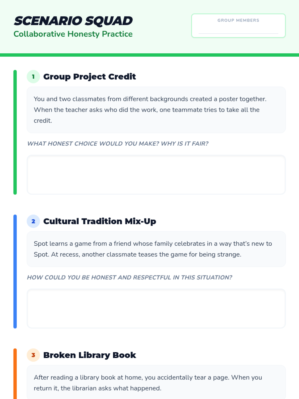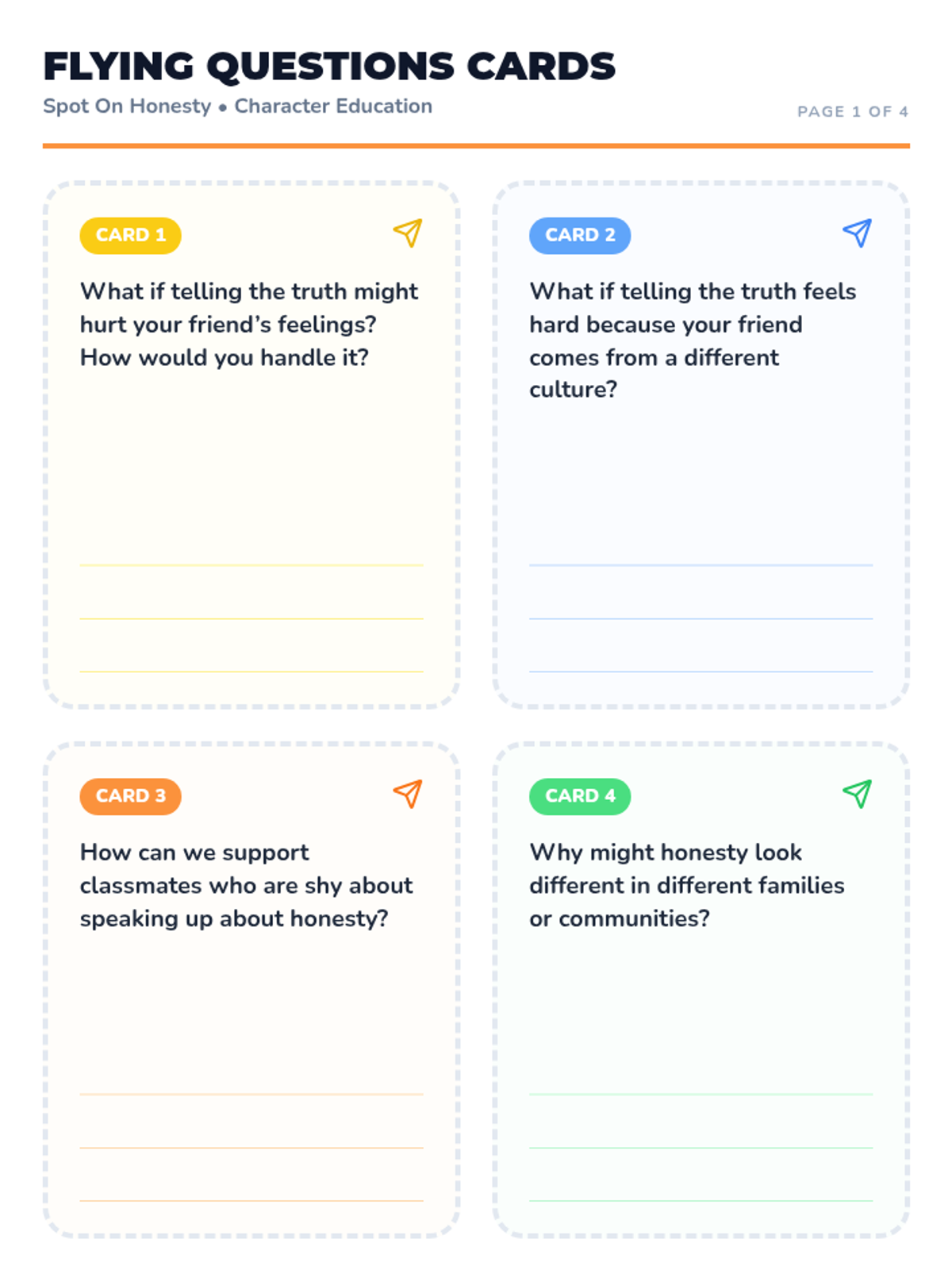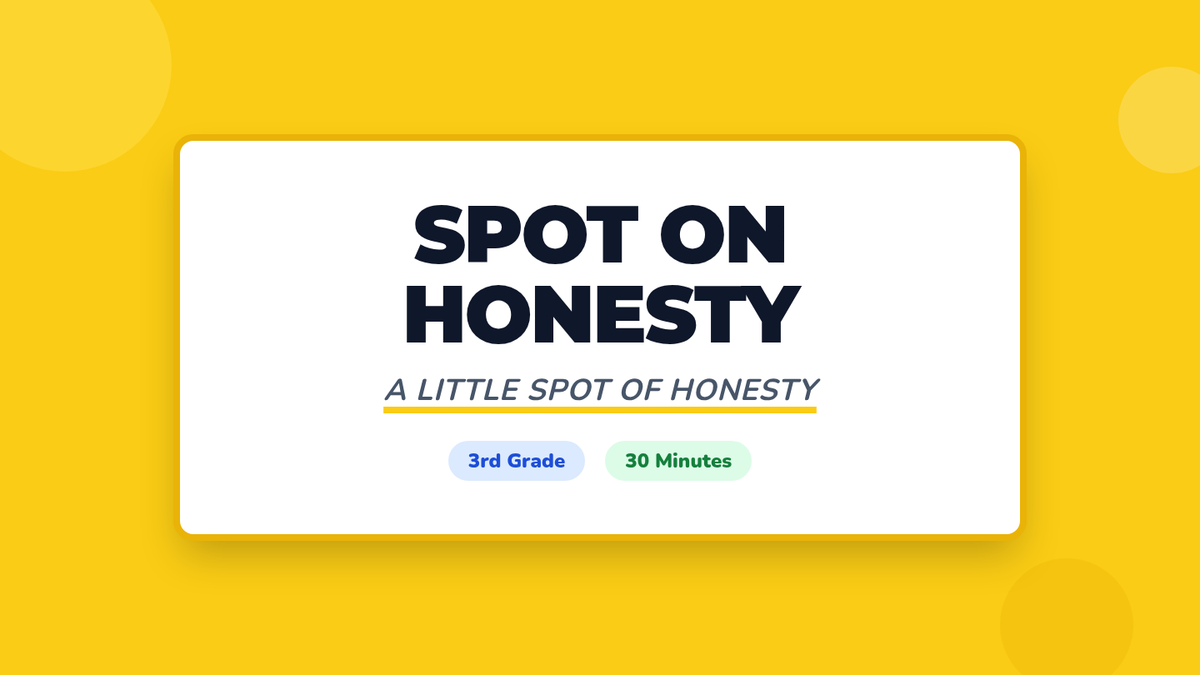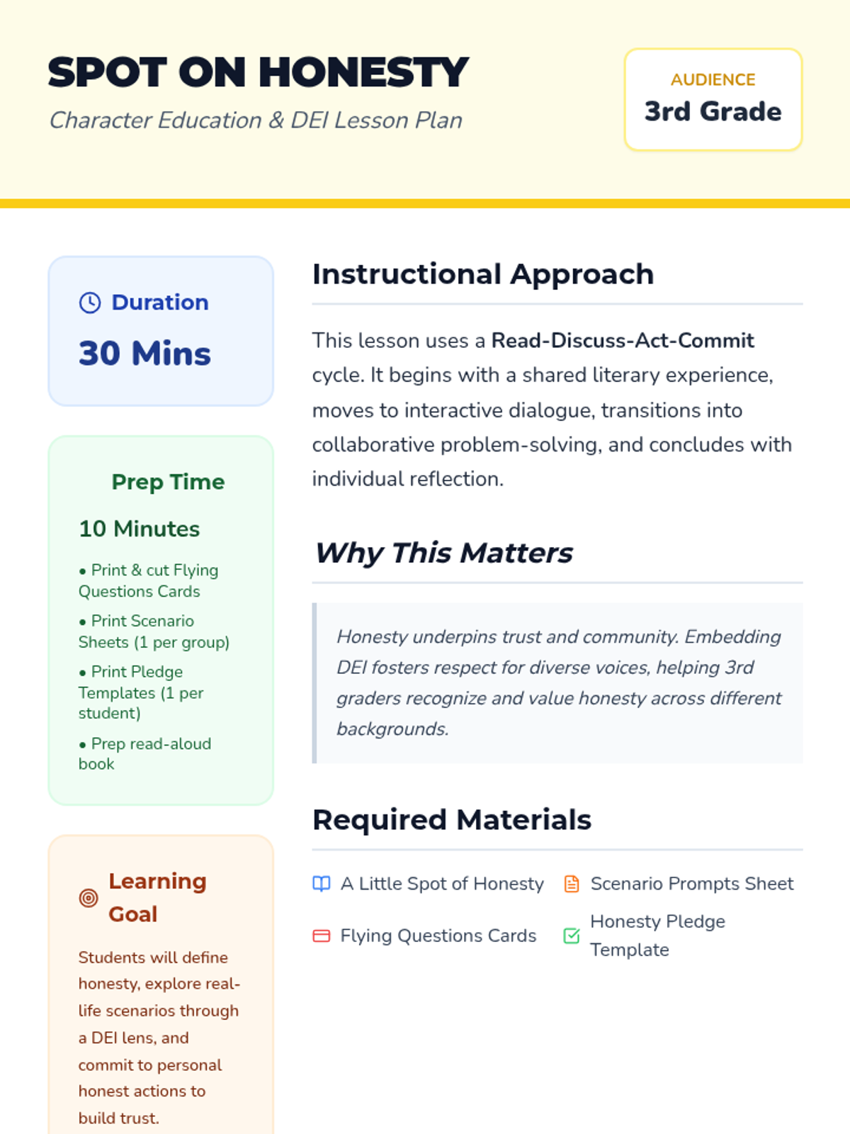 A 30-minute character education lesson for 3rd graders that explores honesty using A Little Spot of Honesty. Students engage in flying questions and scenario-based role-play to understand how honesty builds trust across diverse communities.