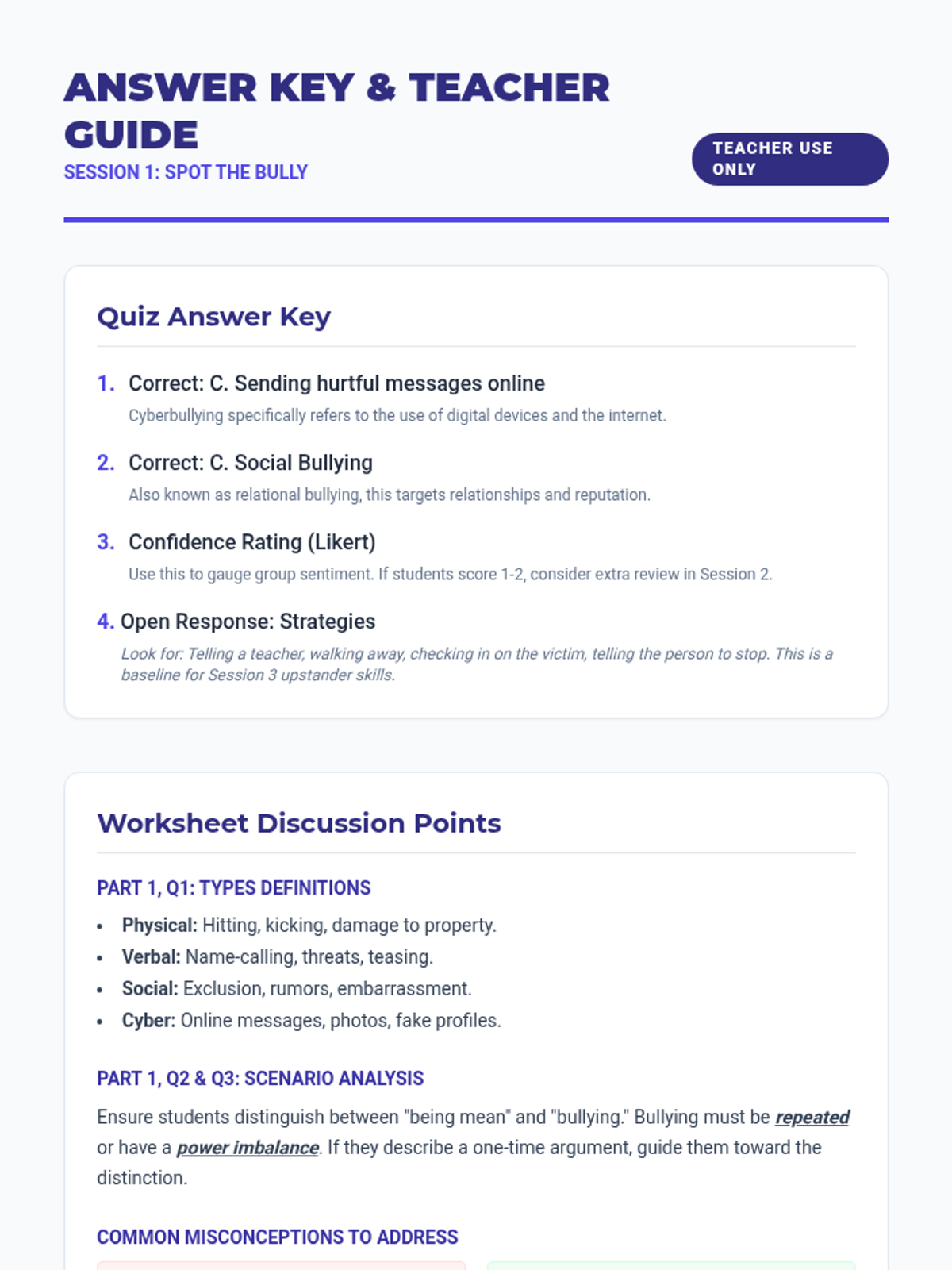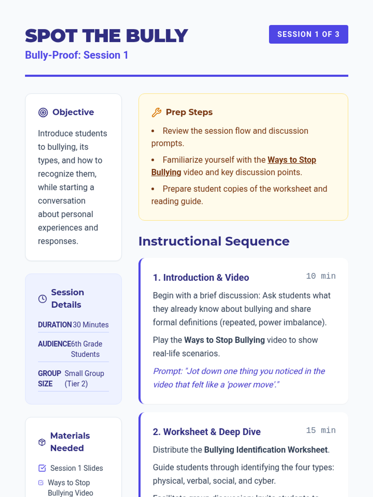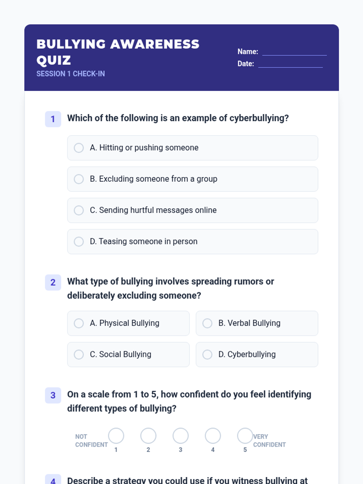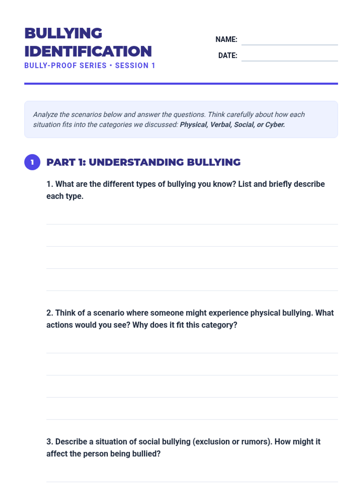 Students will learn to identify the four main types of bullying (physical, verbal, social, and cyber) through real-life scenarios and group discussion.