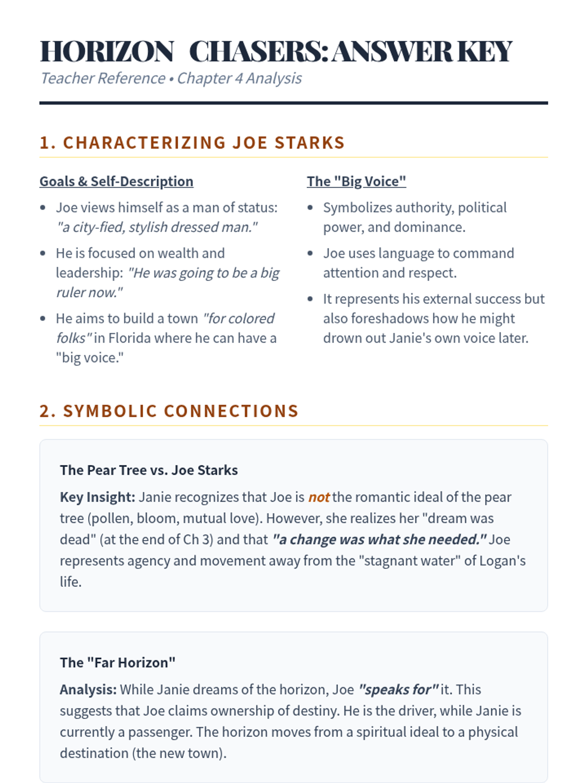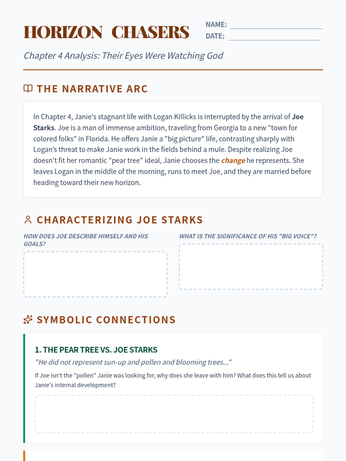 This lesson explores Chapter 4 of Zora Neale Hurston's 'Their Eyes Were Watching God', focusing on Joe Starks's introduction and the evolving symbolism of the horizon and the pear tree.
