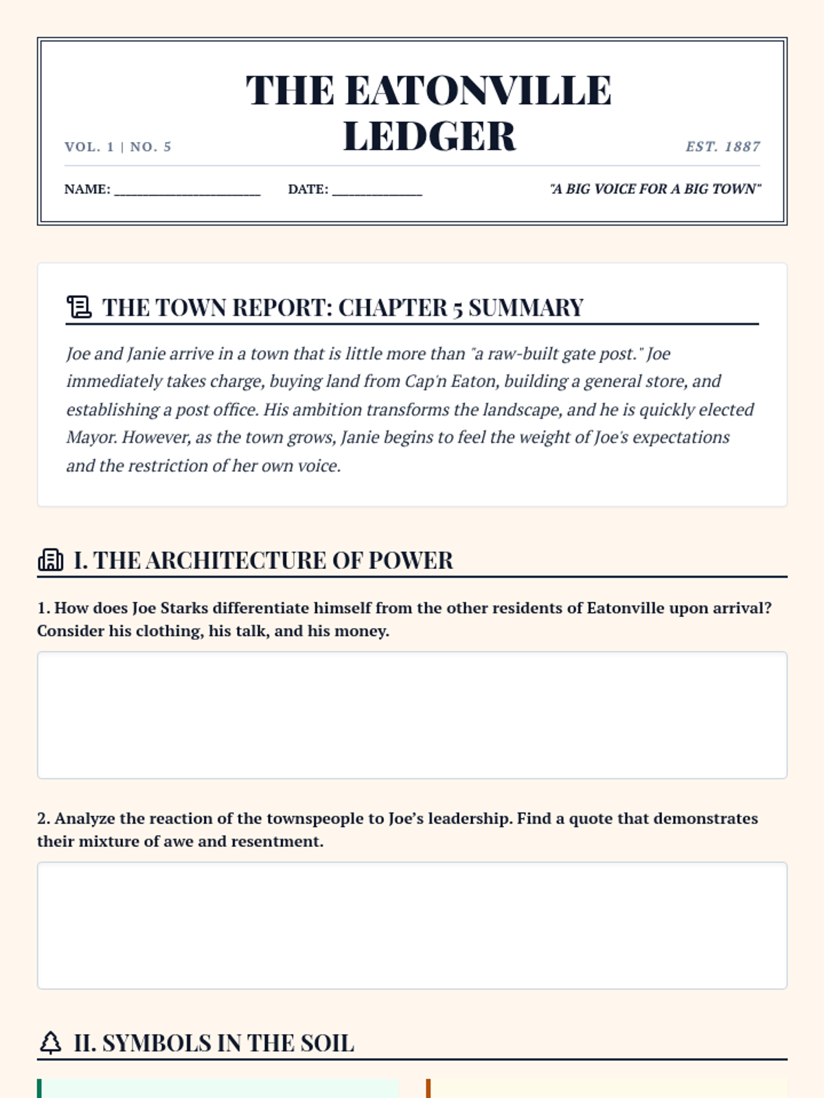 A deep dive into Chapter 5 of 'Their Eyes Were Watching God', focusing on Joe Starks' rise to power in Eatonville and the shifting symbolism of Janie's pear tree vision as her marriage begins to stifle her spirit.