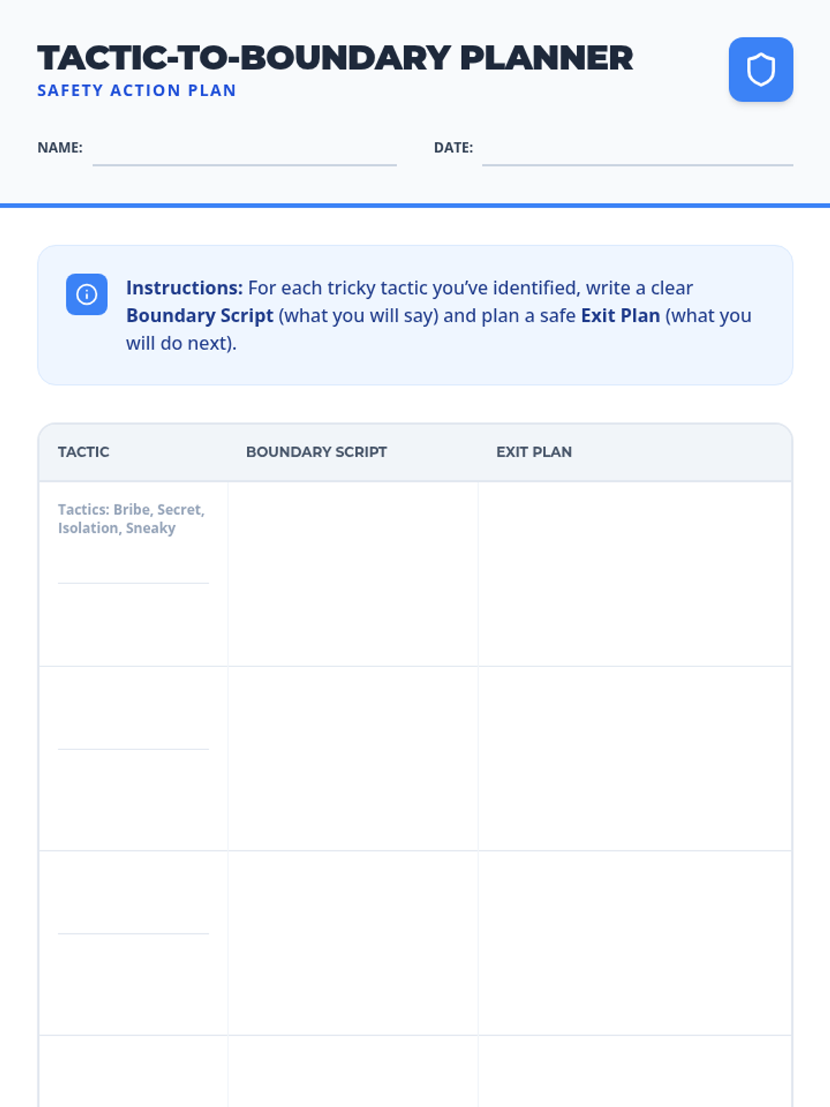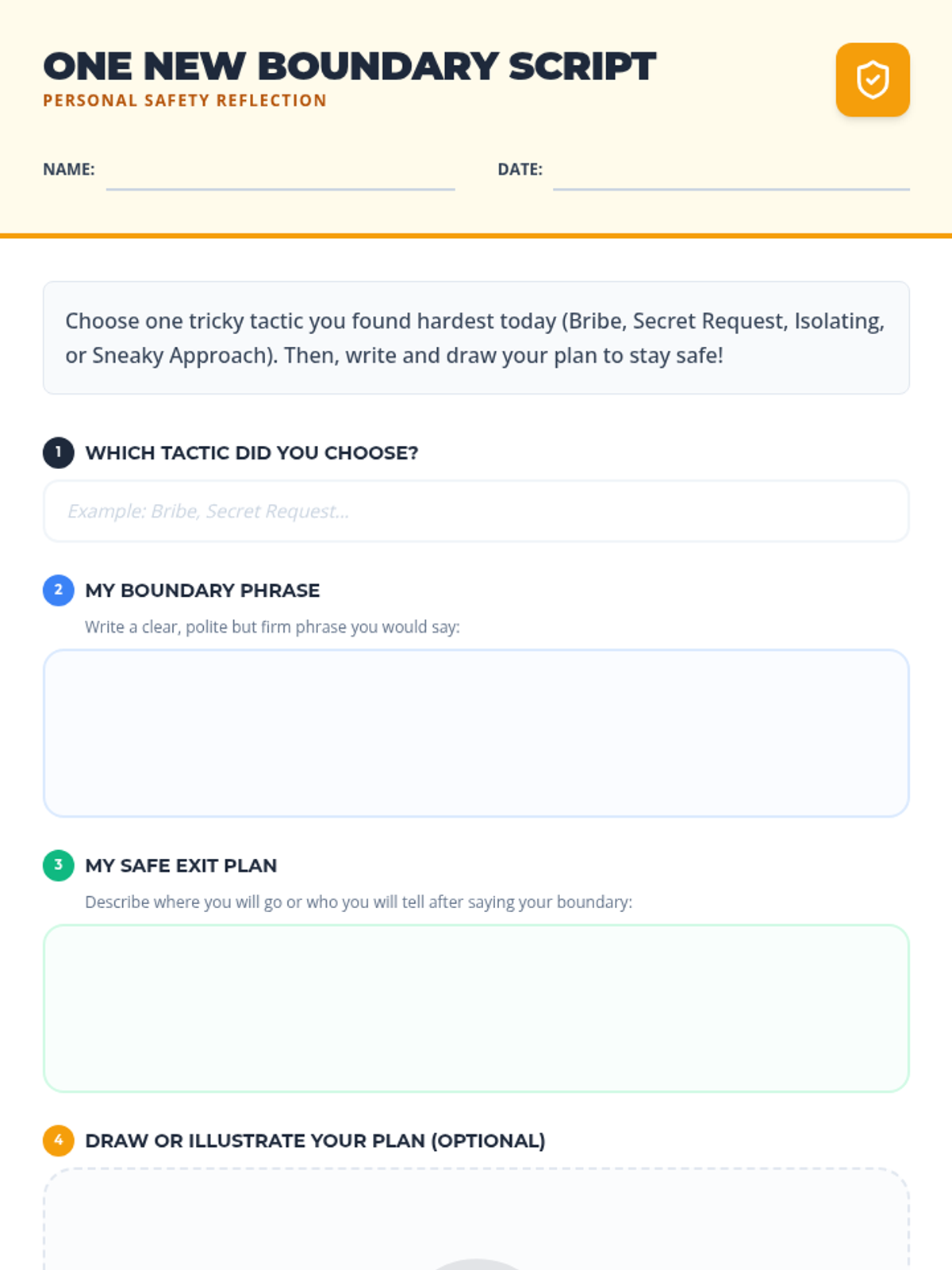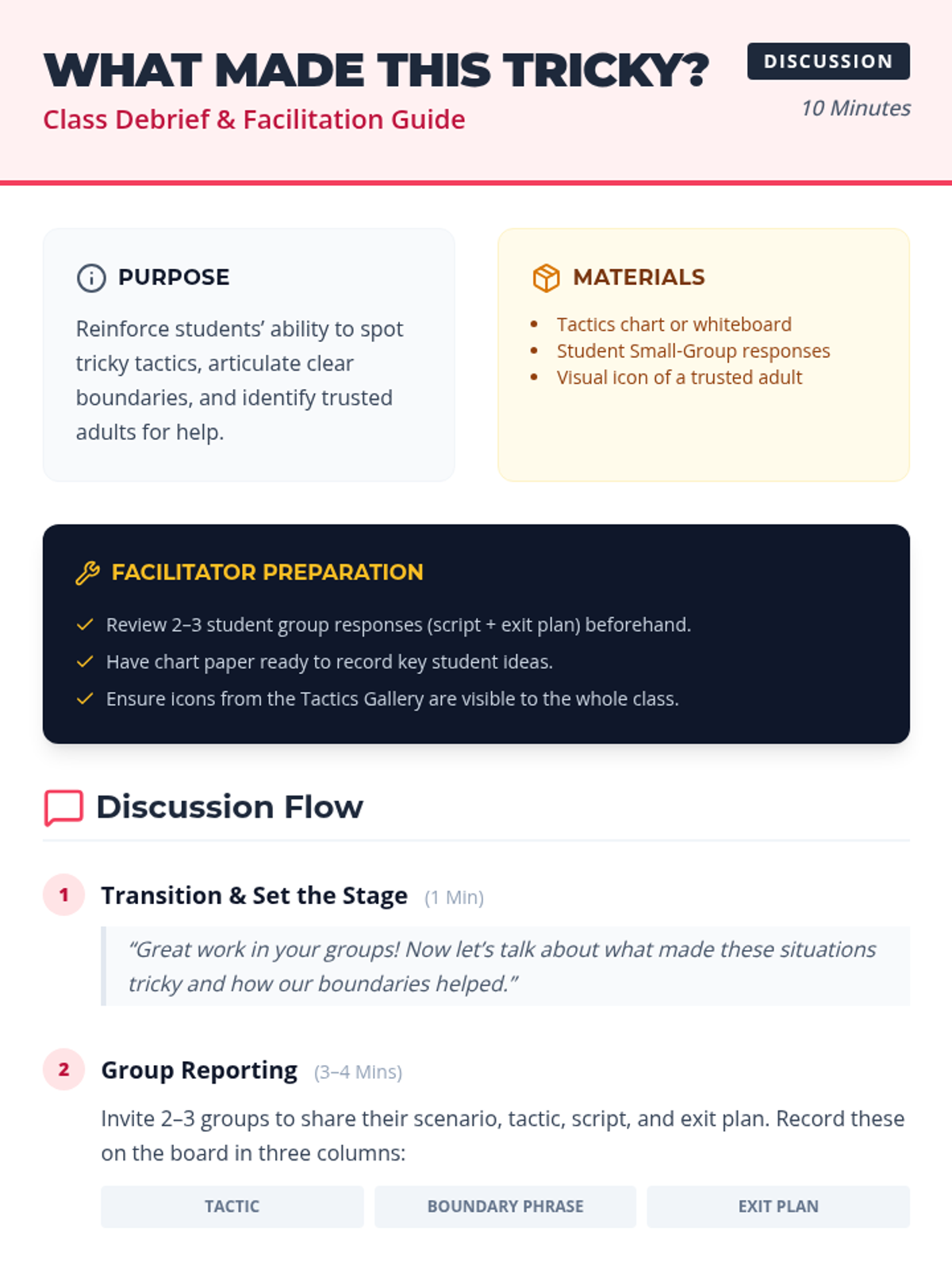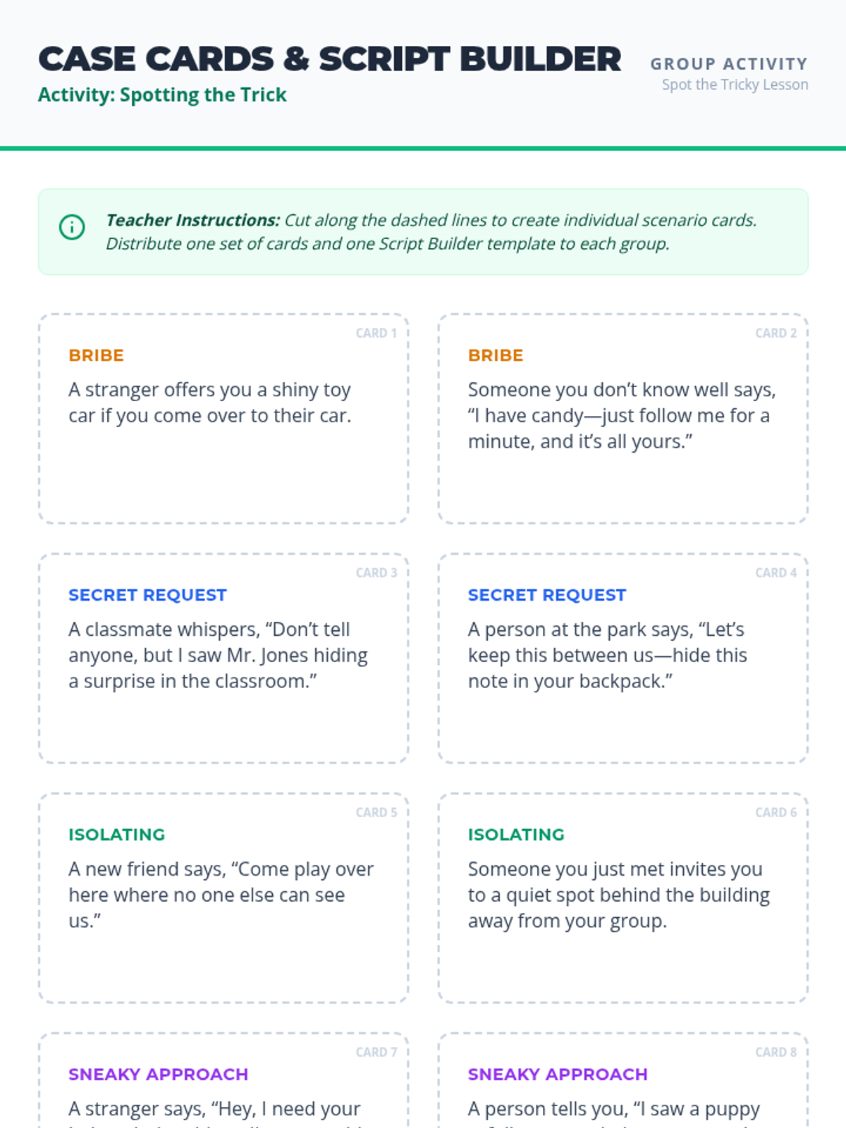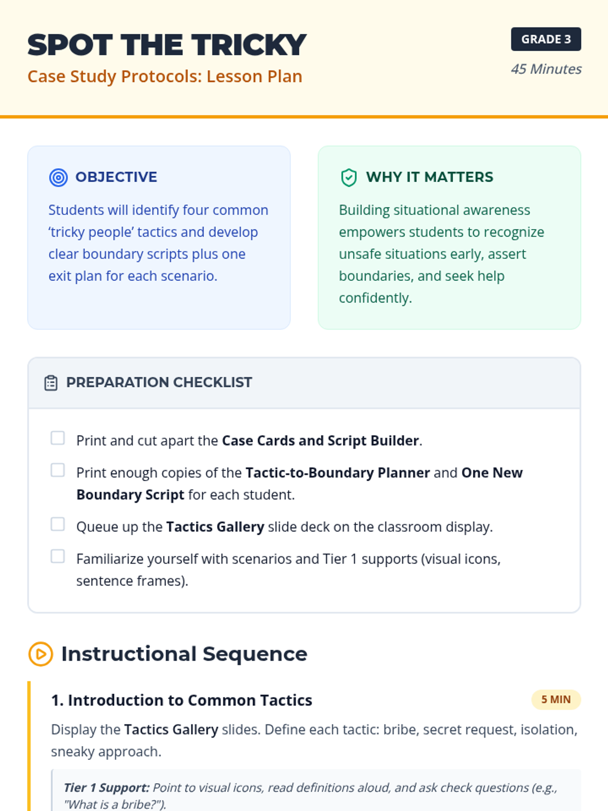 A 45-minute safety lesson for third graders focused on identifying 'tricky people' tactics like bribes, secrets, and isolation. Students develop boundary scripts and exit plans to build situational awareness and confidence.
