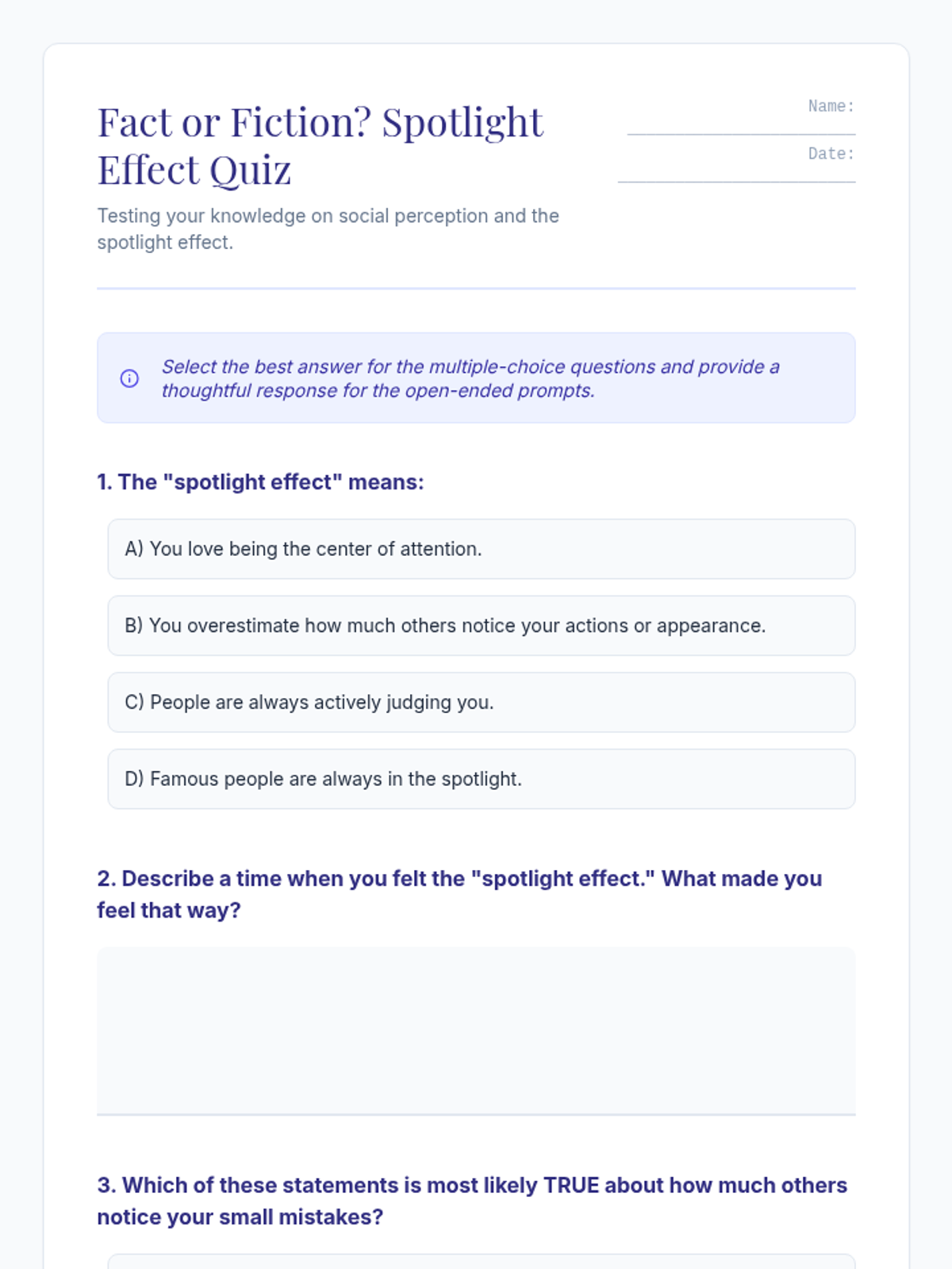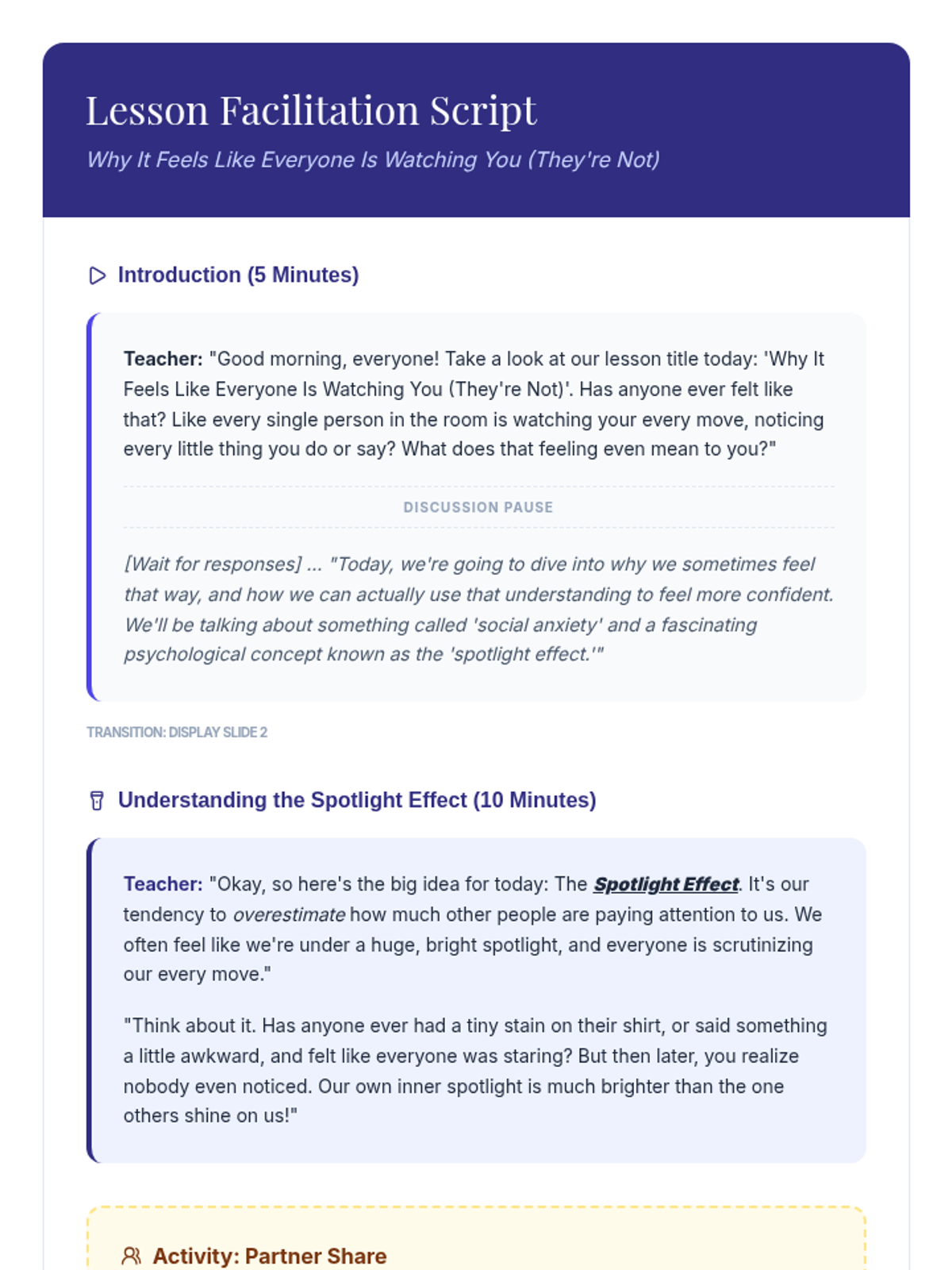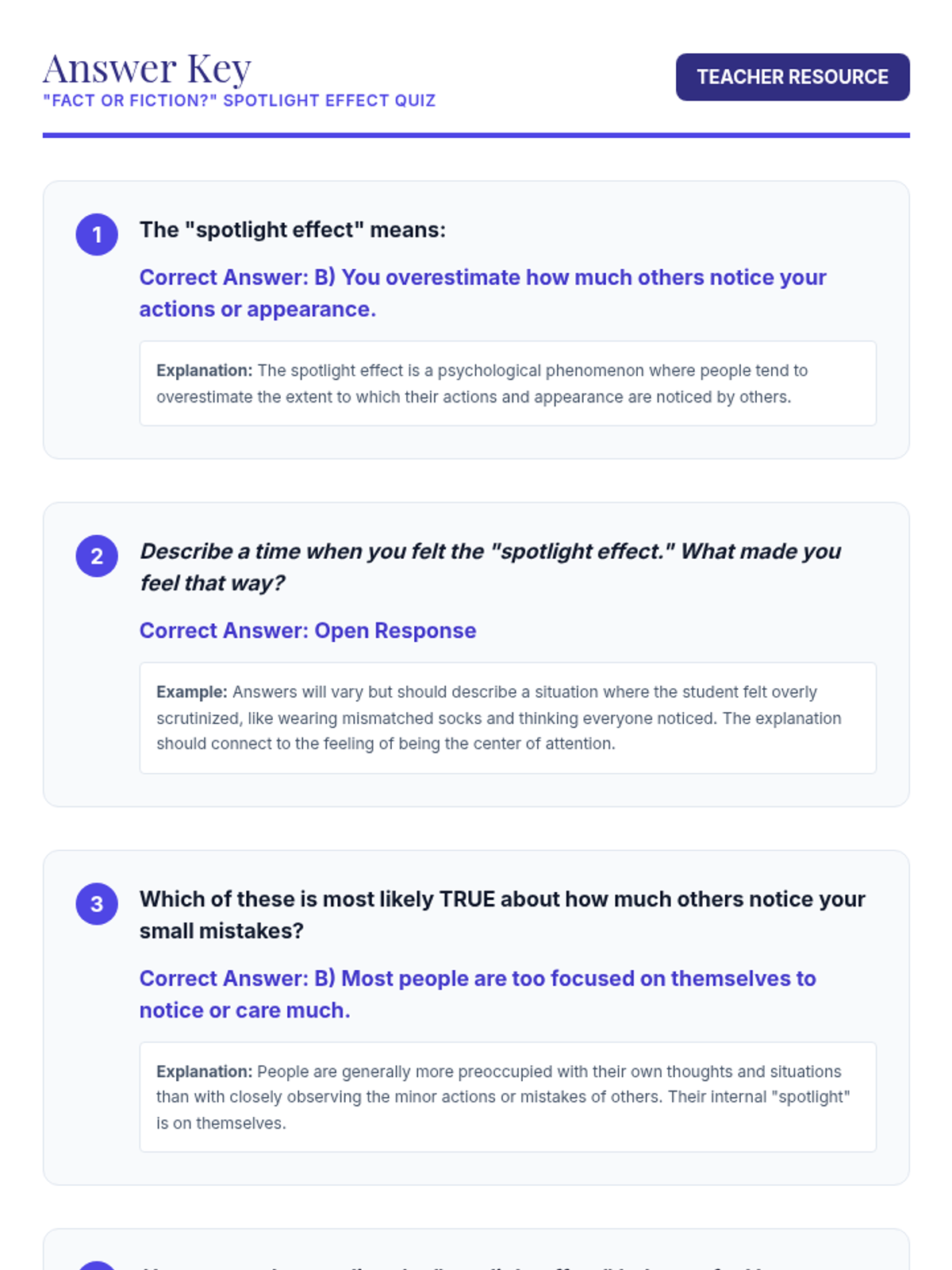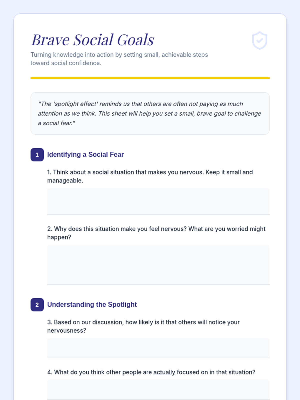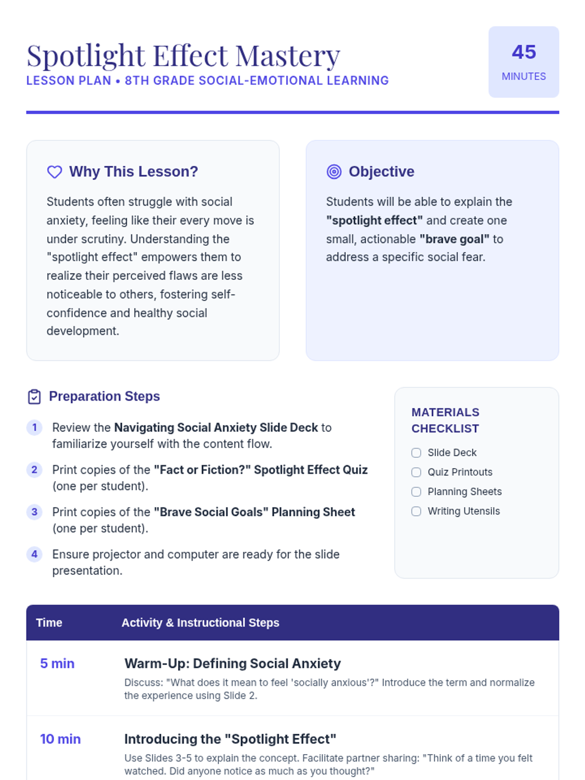 This lesson helps 8th-grade students understand the 'spotlight effect'—the tendency to overestimate how much others notice our flaws—and provides actionable strategies to set 'brave goals' to overcome social anxiety.