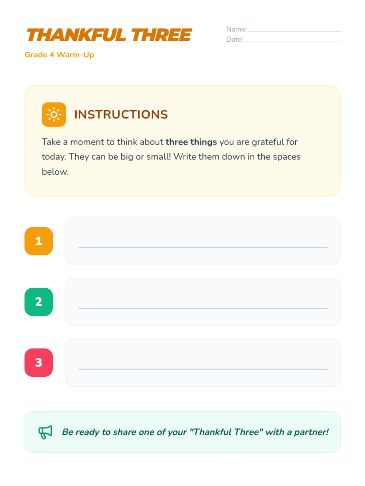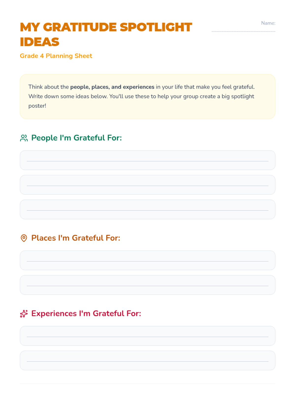 Students will be able to identify and express gratitude for people and experiences in their lives through a collaborative poster activity.
