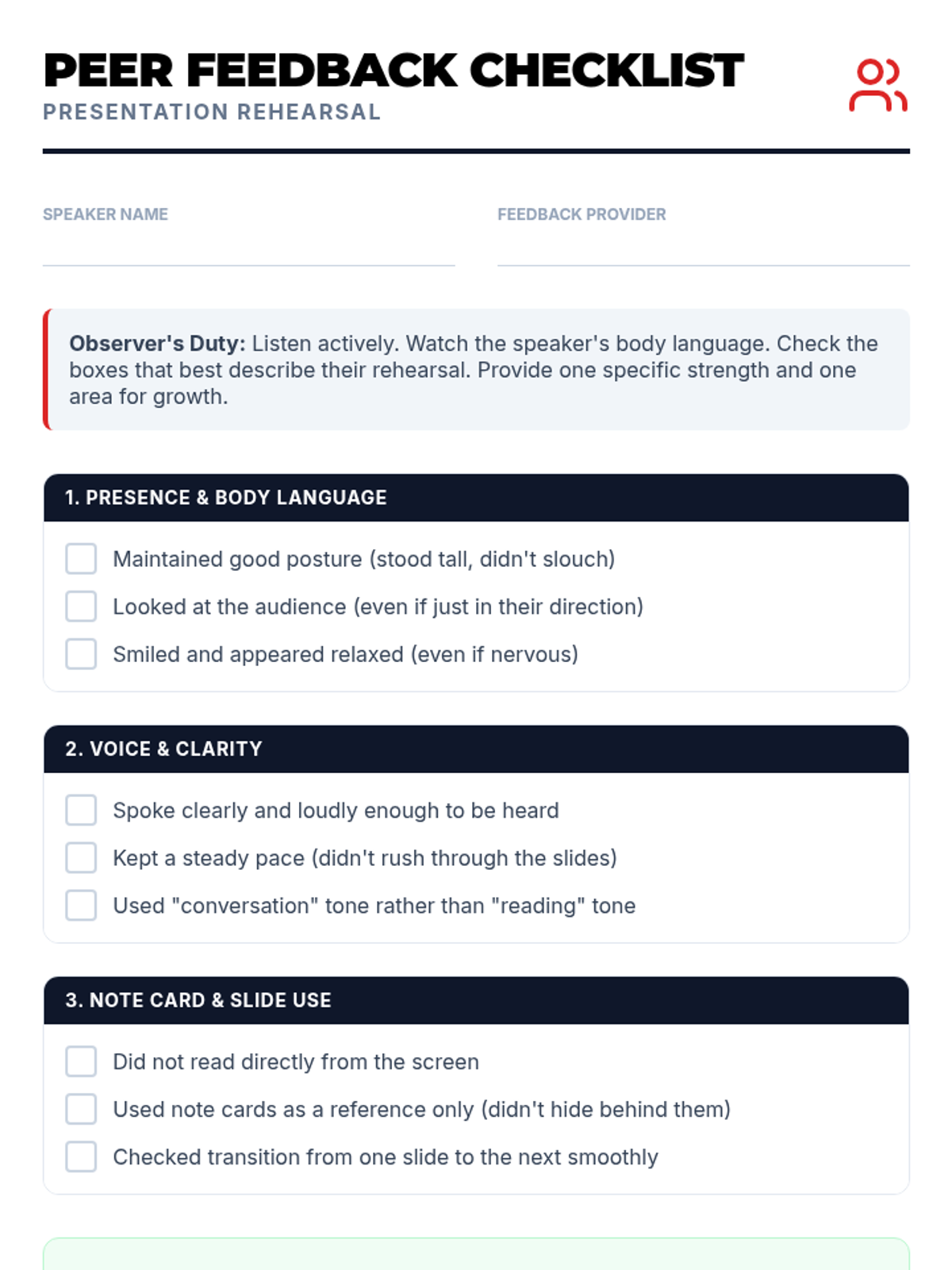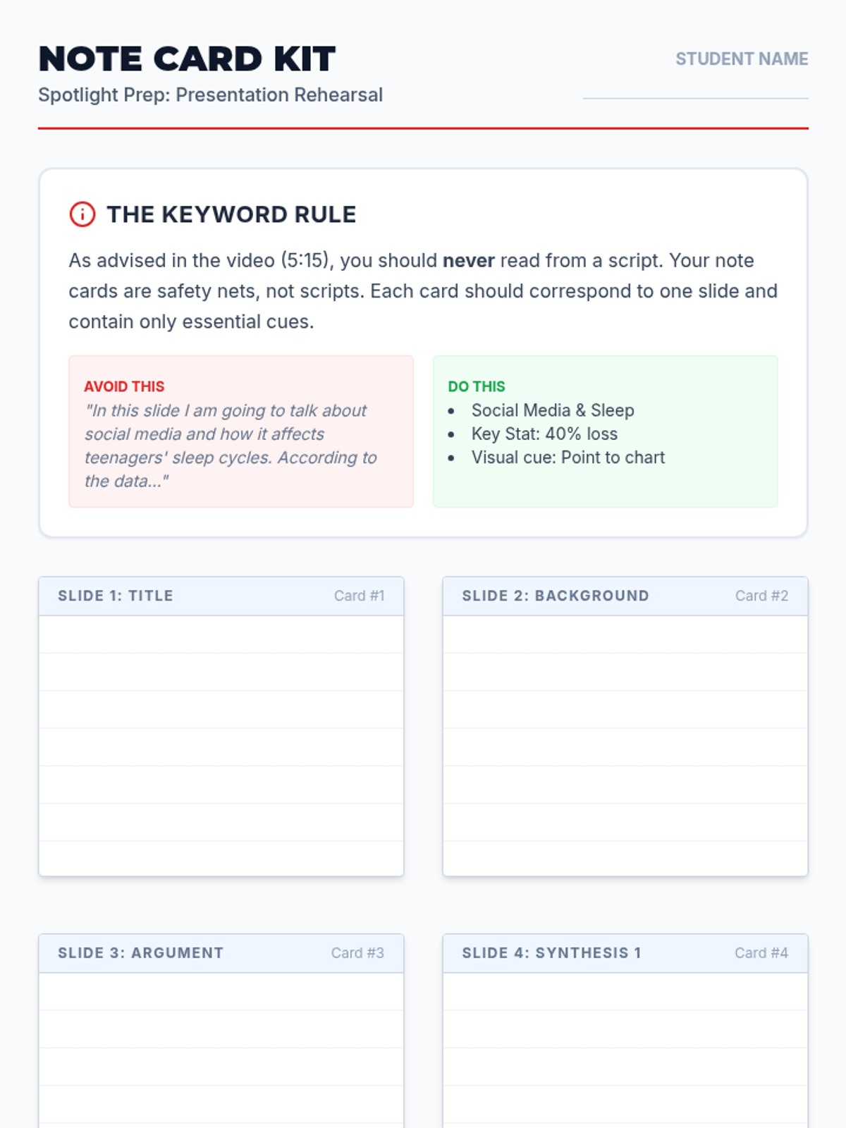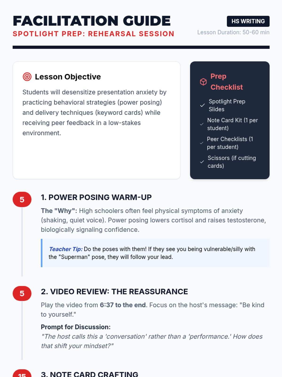 A comprehensive dress rehearsal lesson for high schoolers to finalize their research presentations. It features a warm-up activity, note card strategy development, and peer feedback sessions to build confidence and refine delivery.