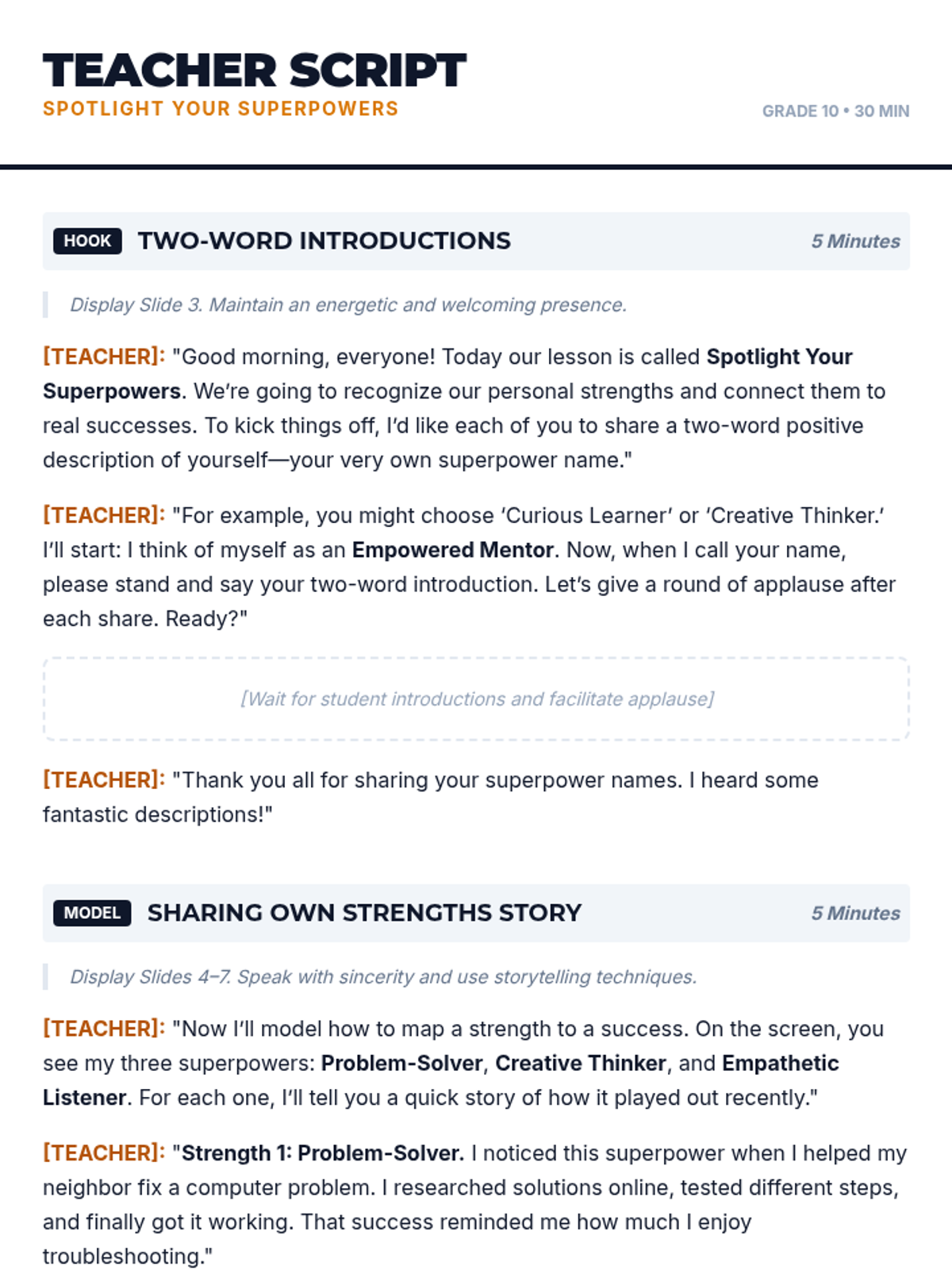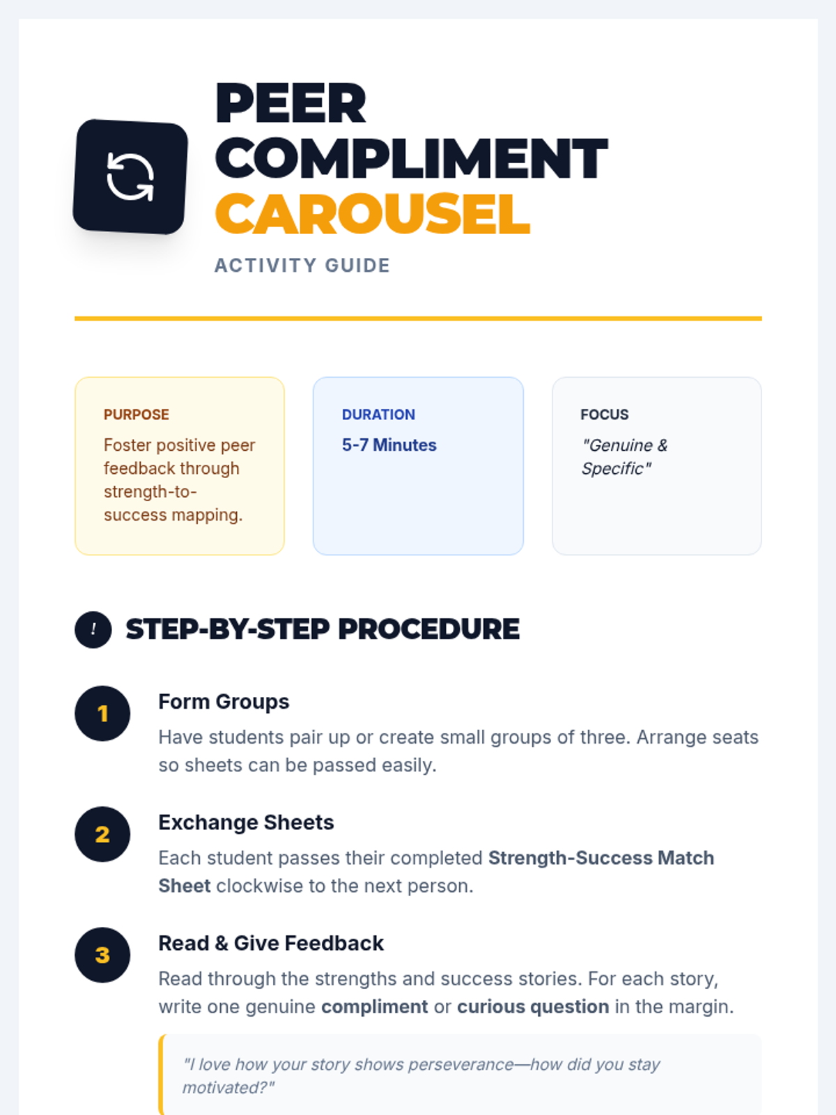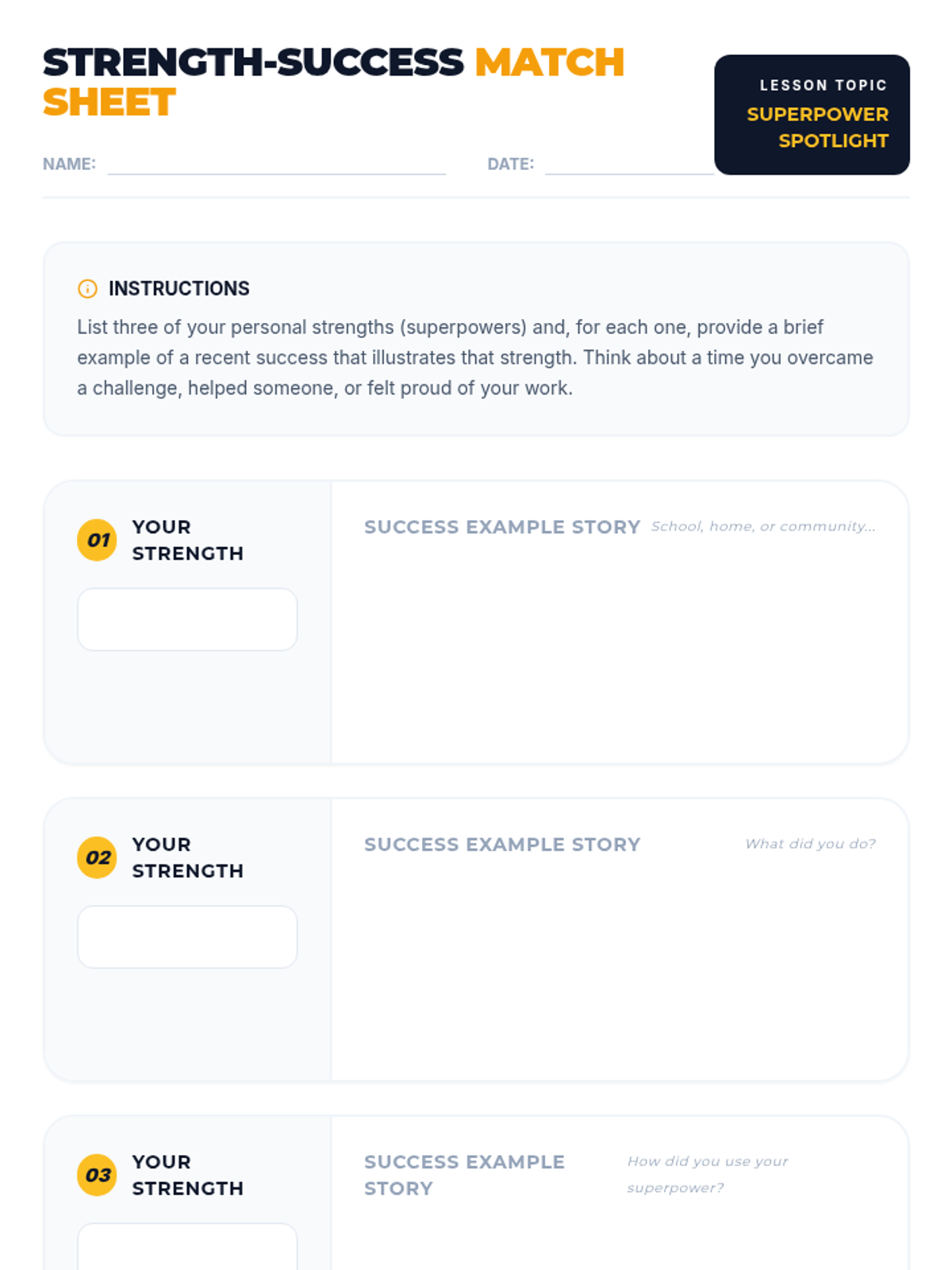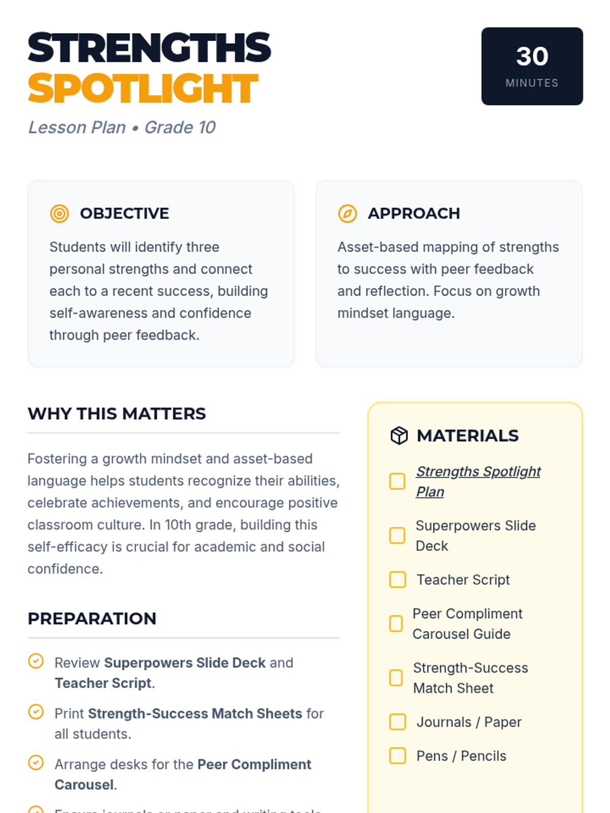 A 30-minute 10th-grade lesson where students identify personal strengths, connect them to real successes, and receive peer feedback to build self-awareness and confidence.