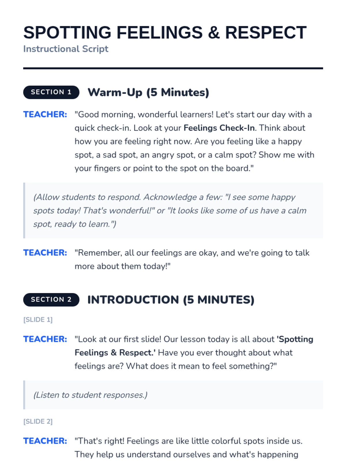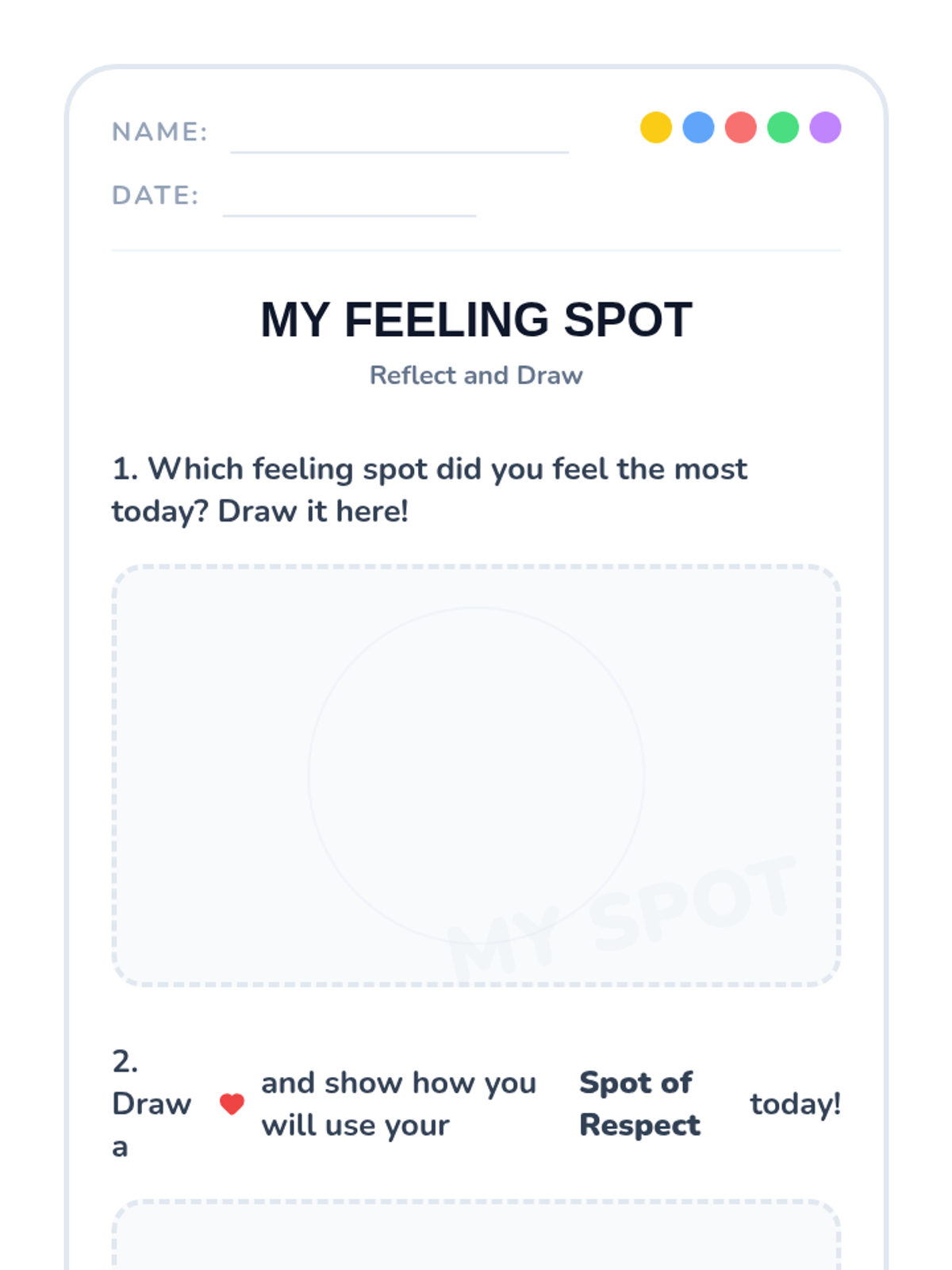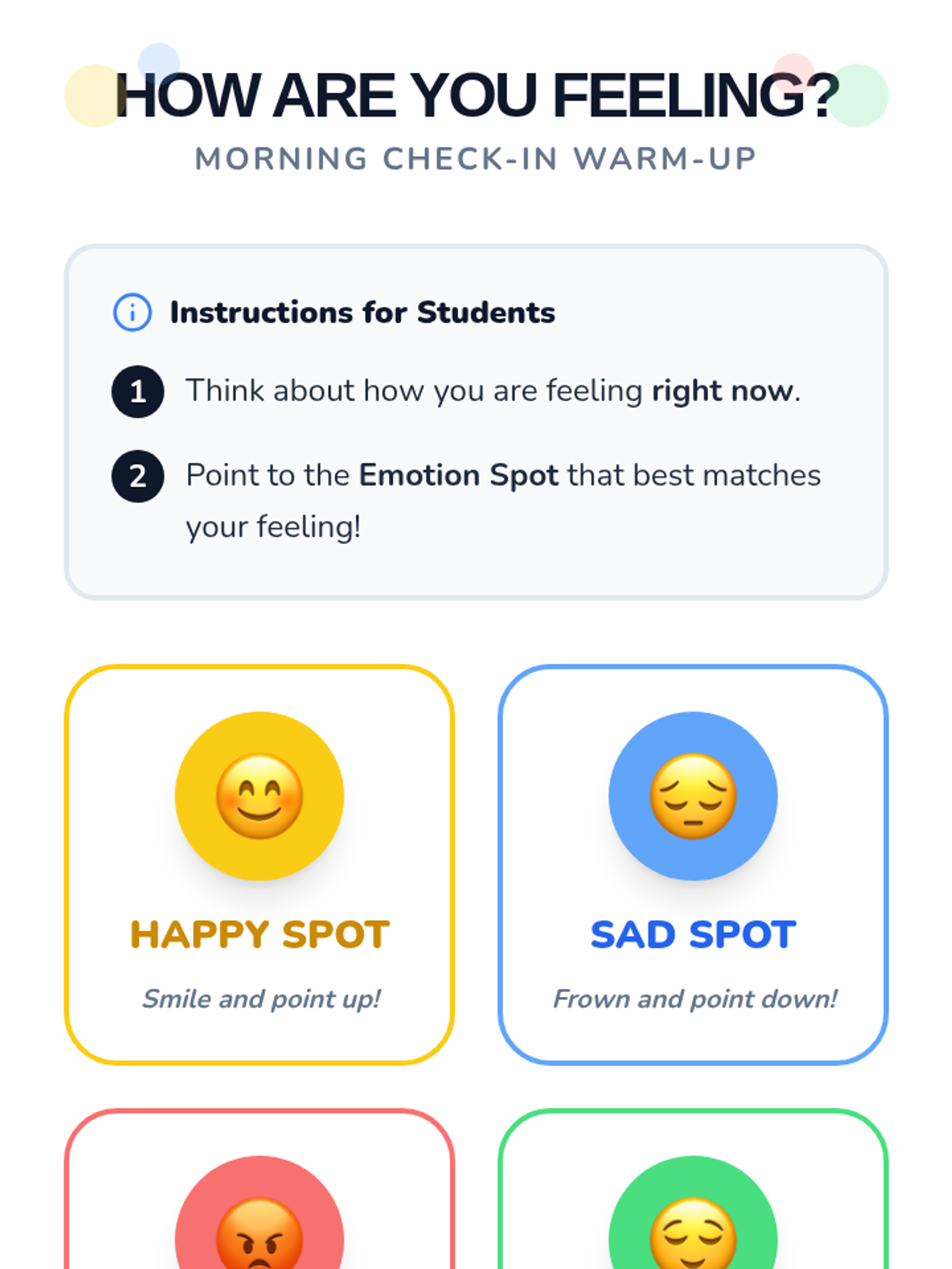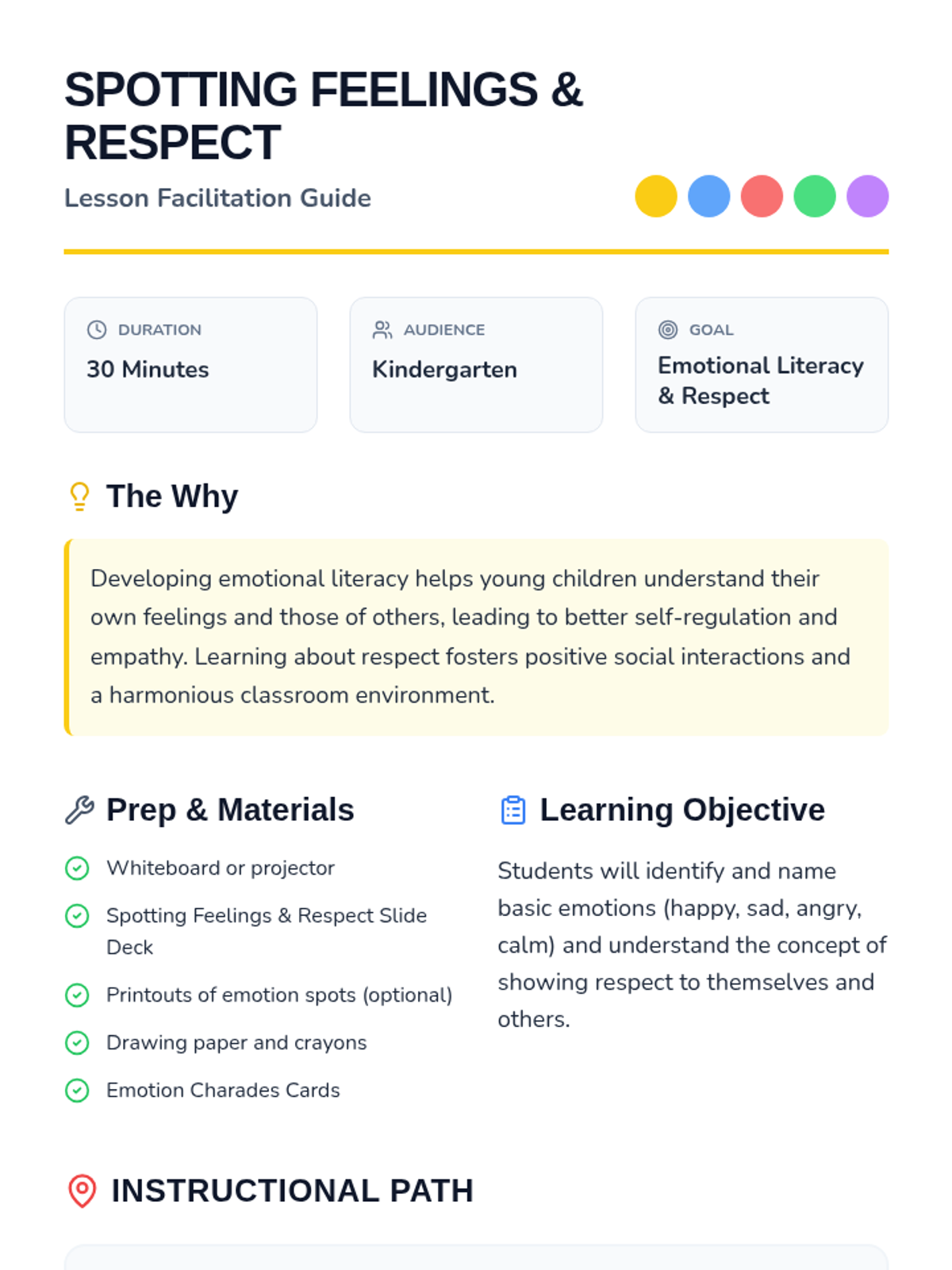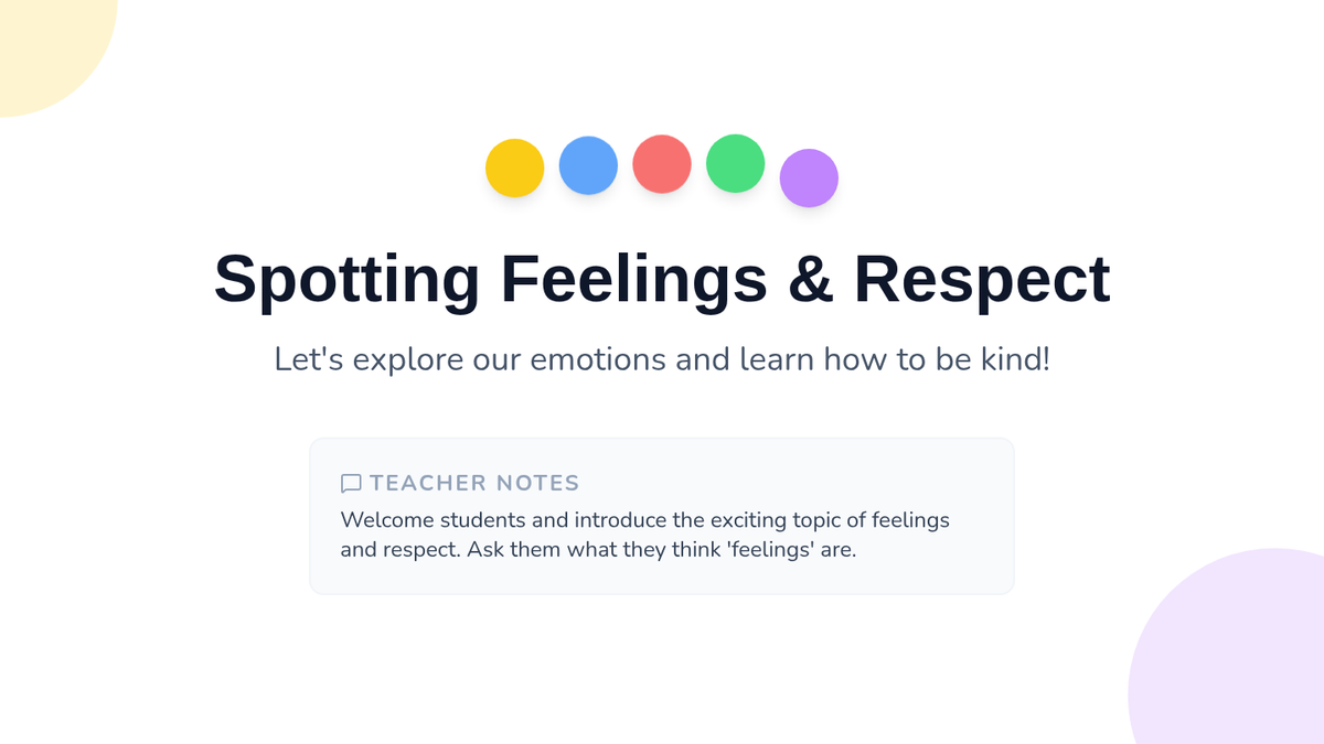 This interactive 30-minute lesson introduces kindergarten students to emotional literacy using 'emotion spots' and the concept of respect. Students will learn to identify happy, sad, angry, and calm feelings and practice kind behaviors through discussion and play.