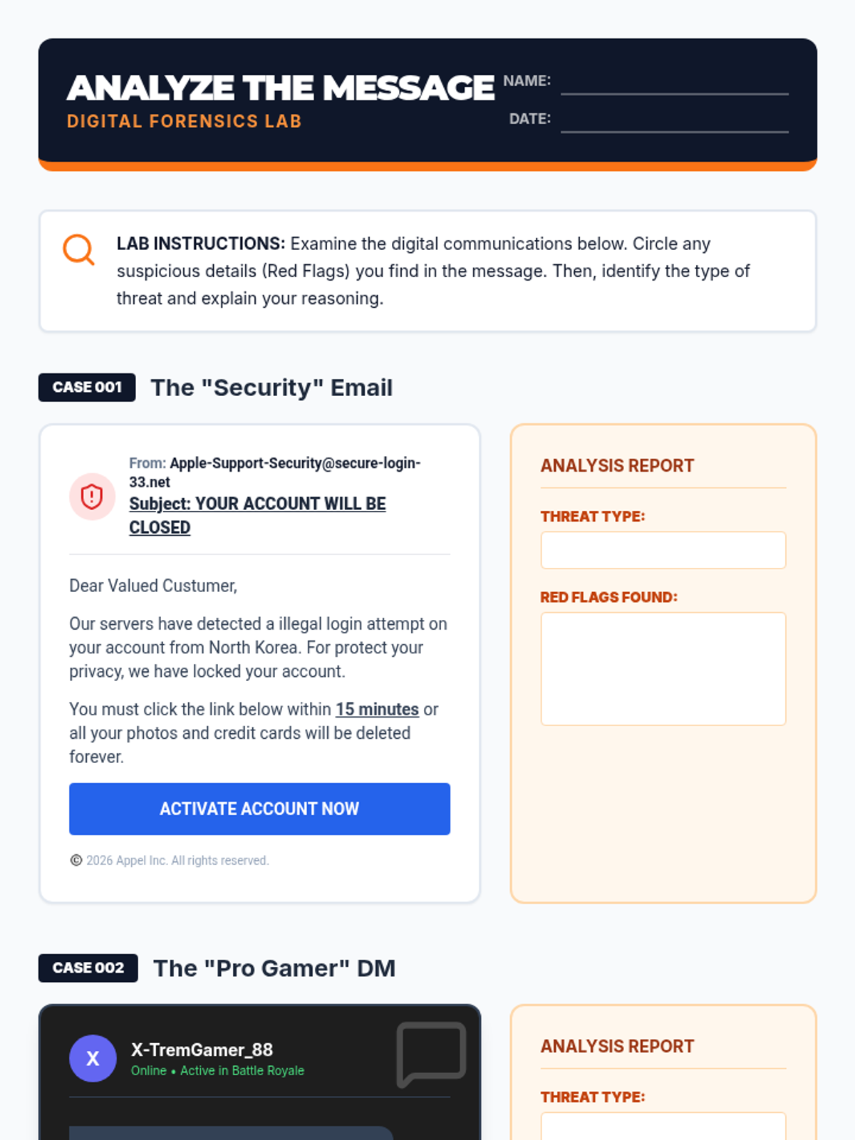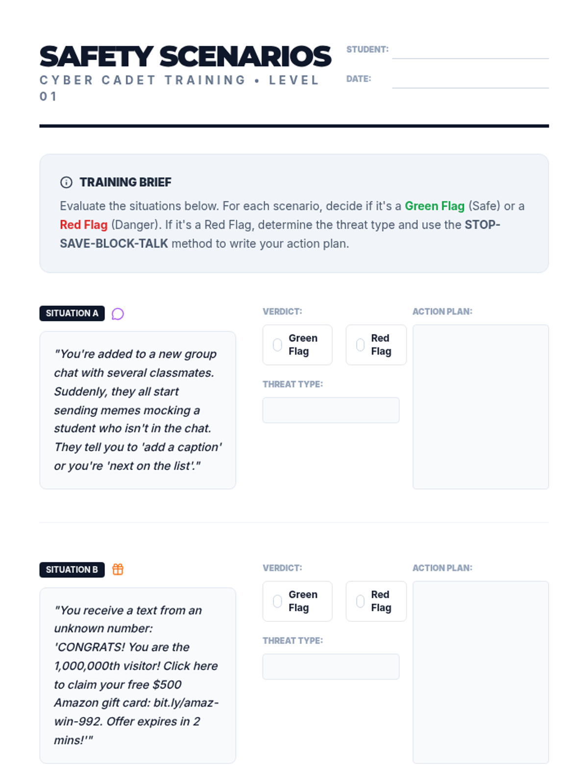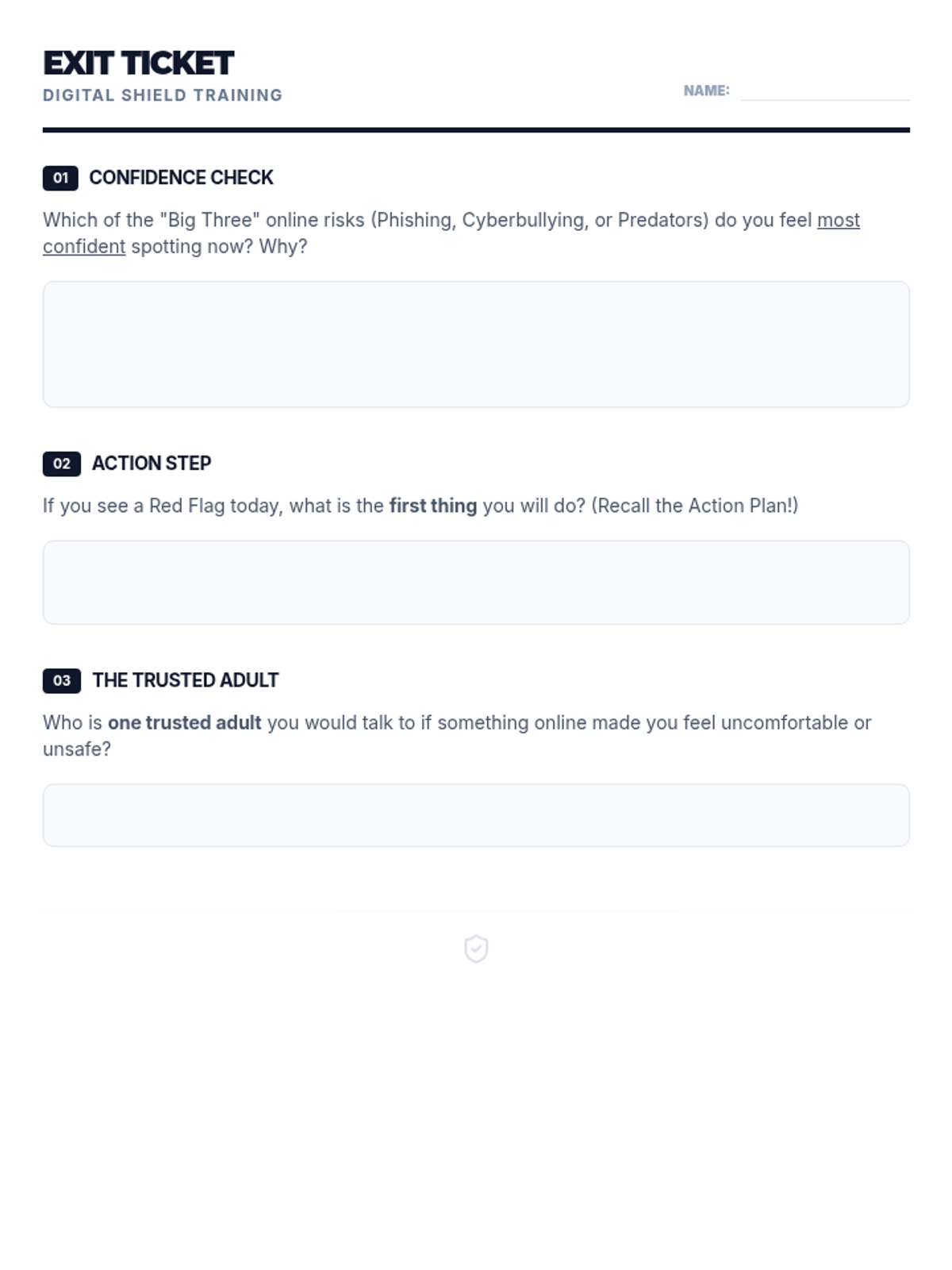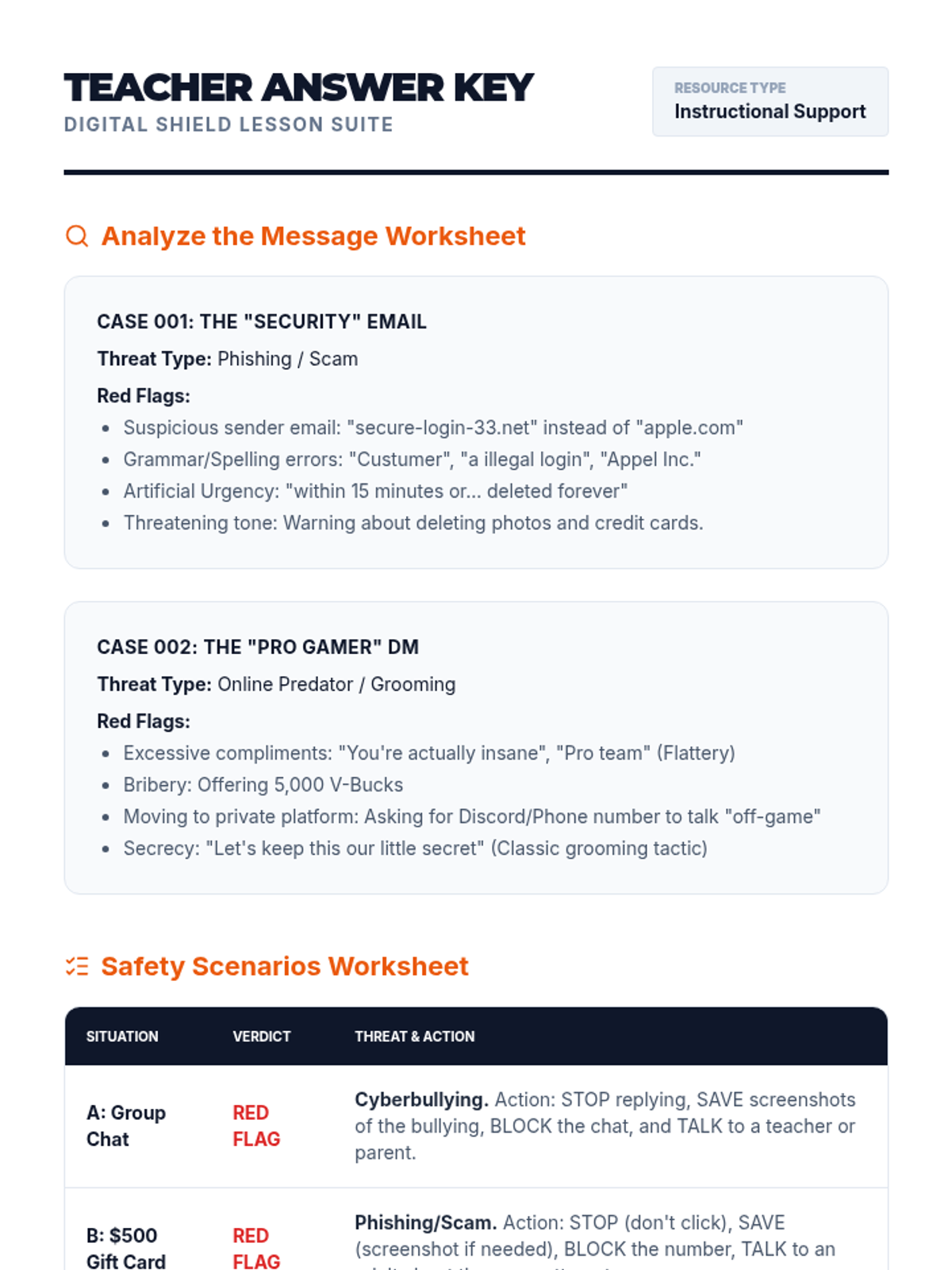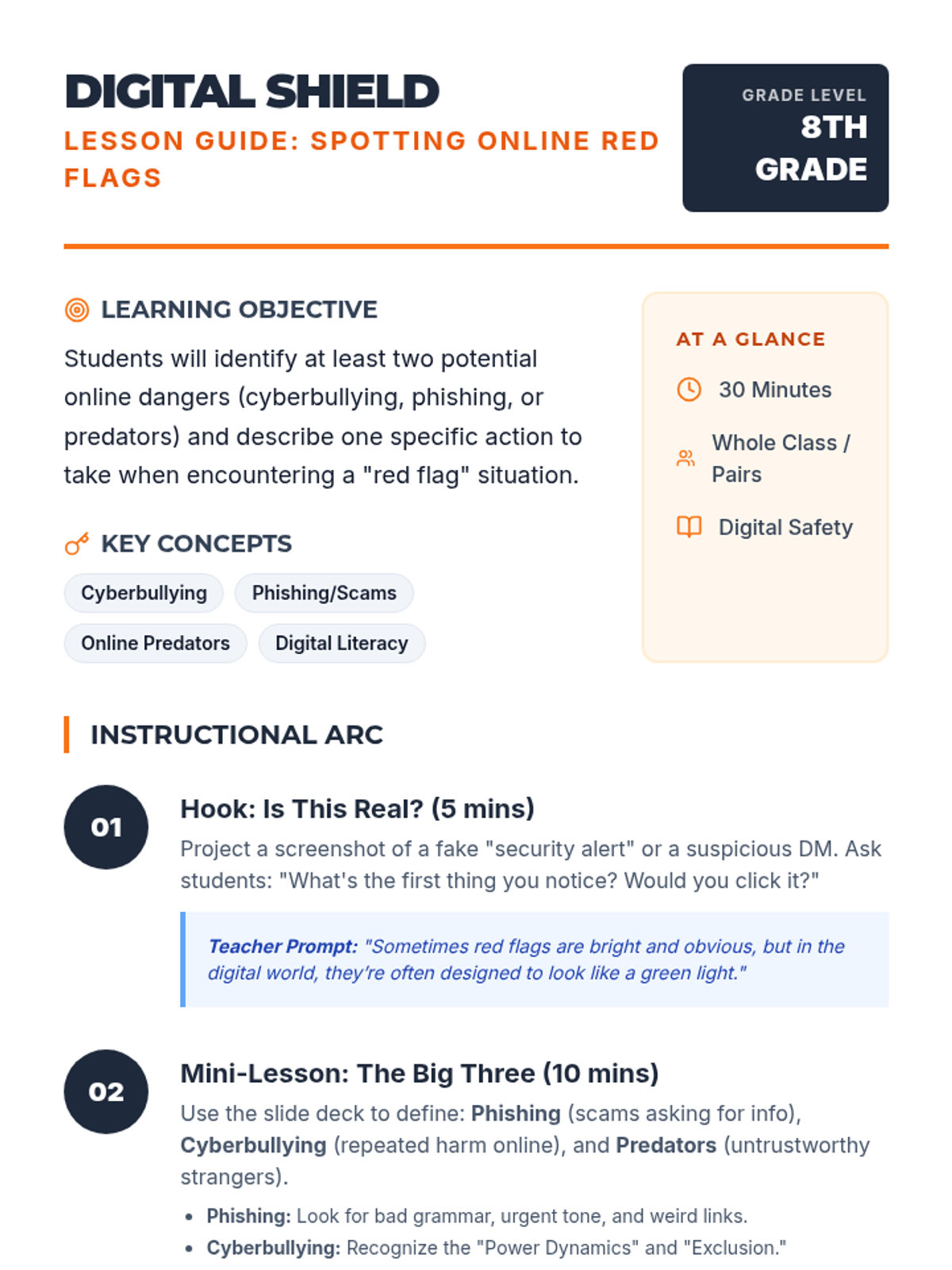 A 30-minute introductory lesson on digital safety for 8th graders, focusing on identifying cyberbullying, phishing, and predators while developing clear action plans for online risks.