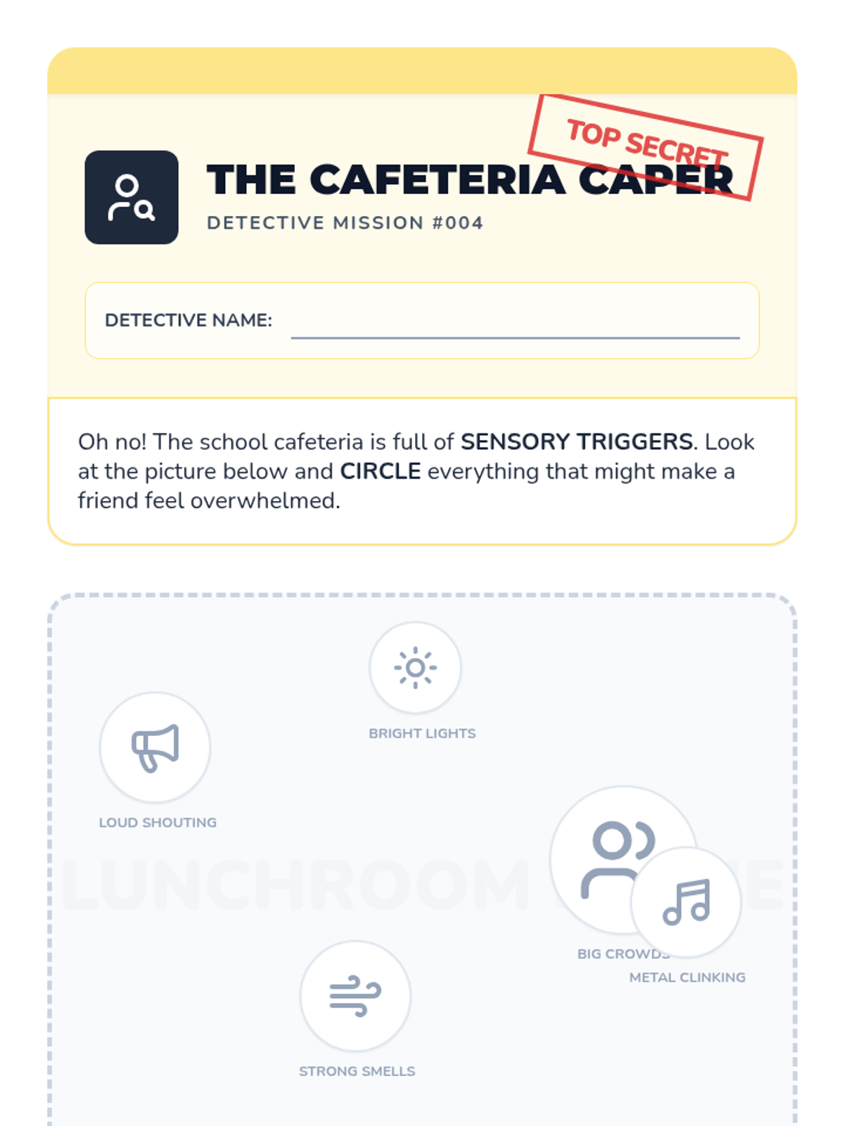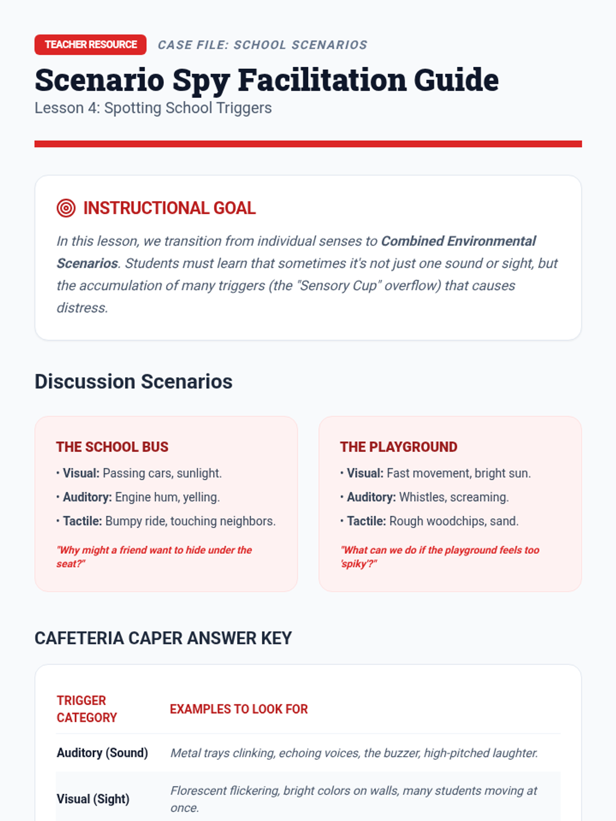 Students analyze school scenarios to spot combined sensory triggers in settings like the cafeteria or school bus.