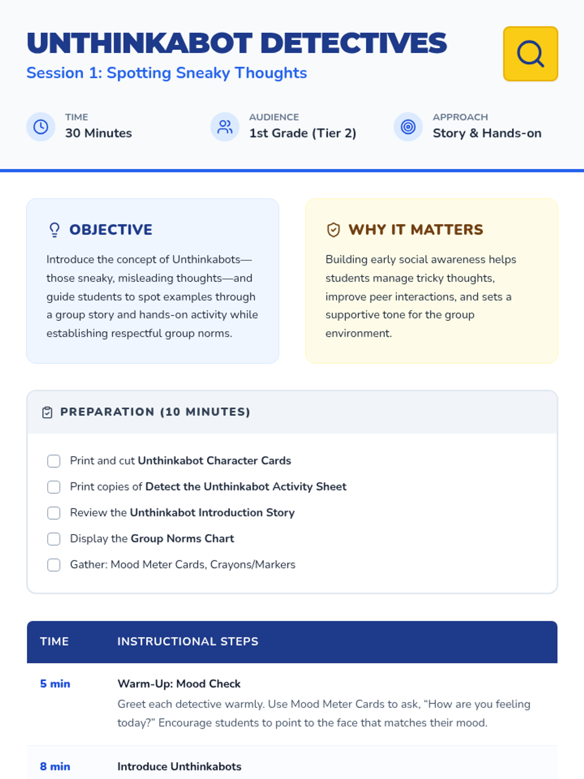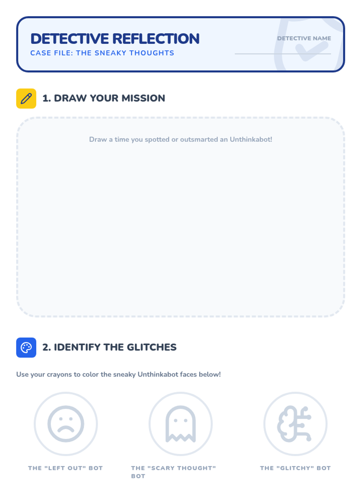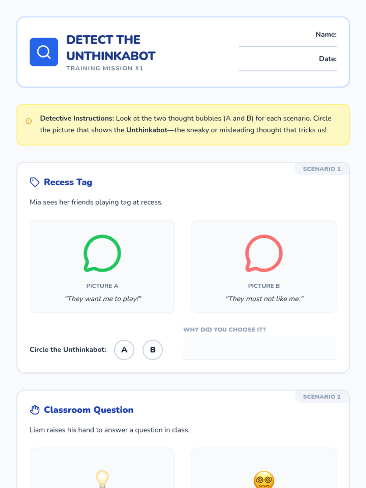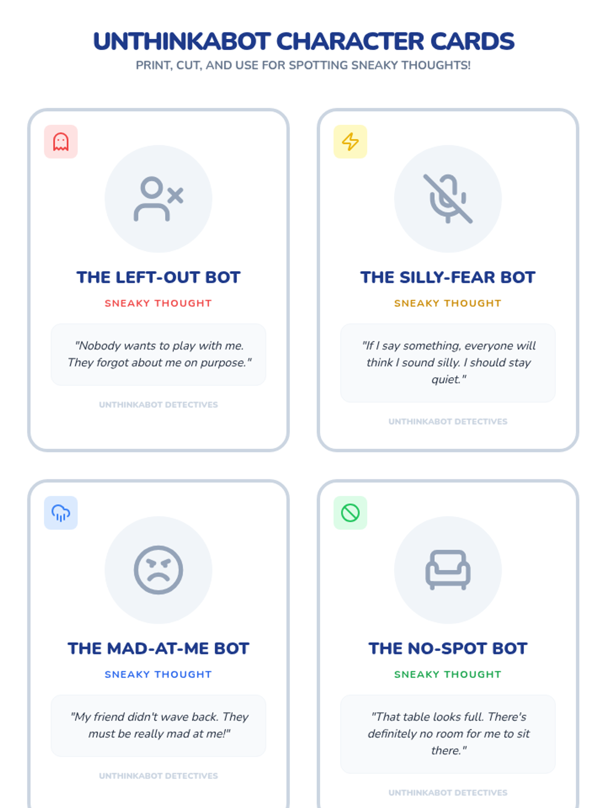The introductory session where students meet Alex, learn what an Unthinkabot is, and practice spotting sneaky thoughts in social scenarios.