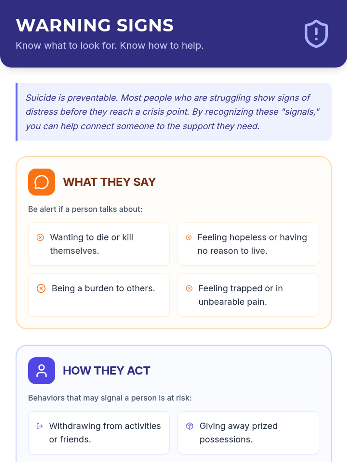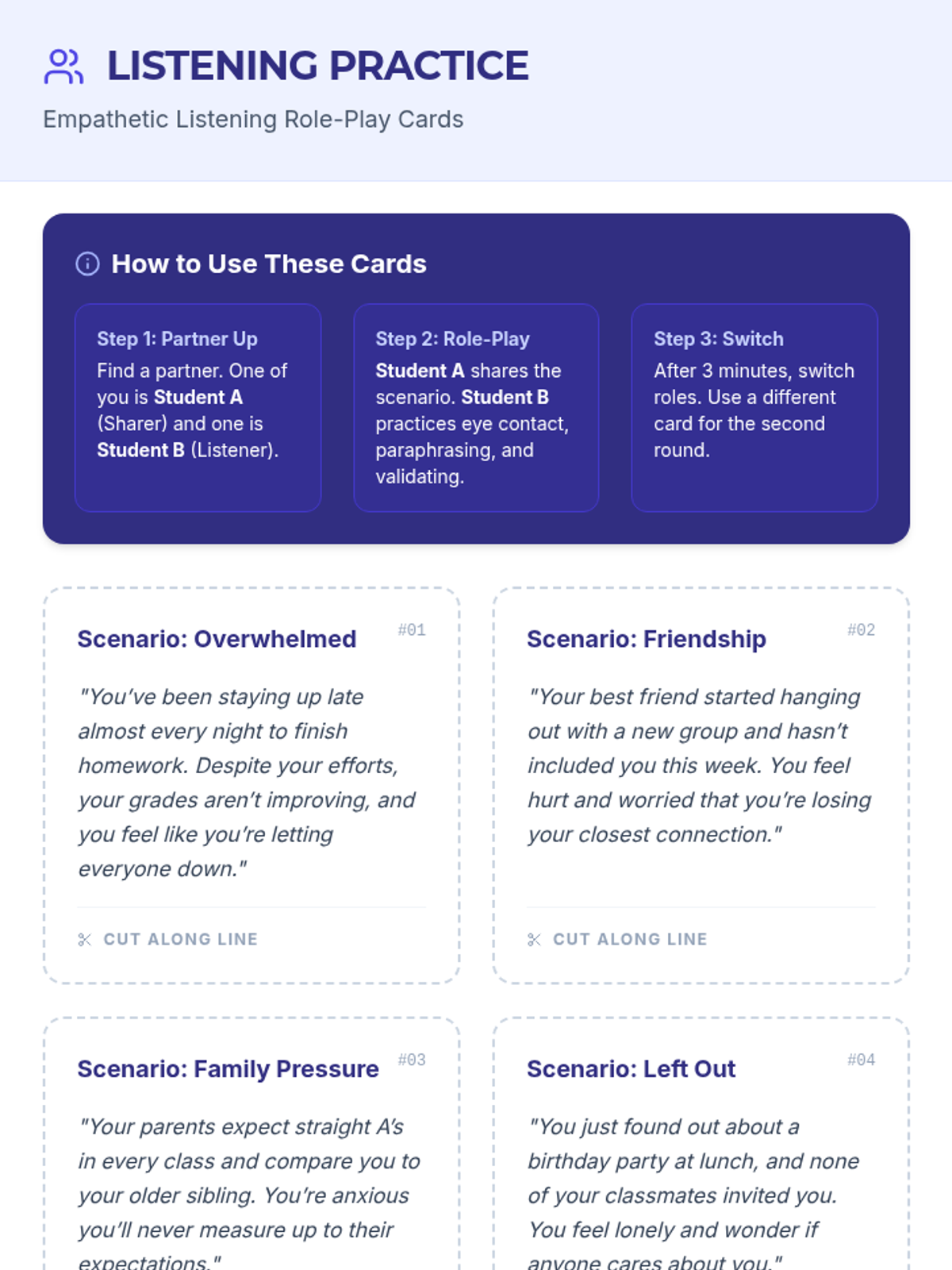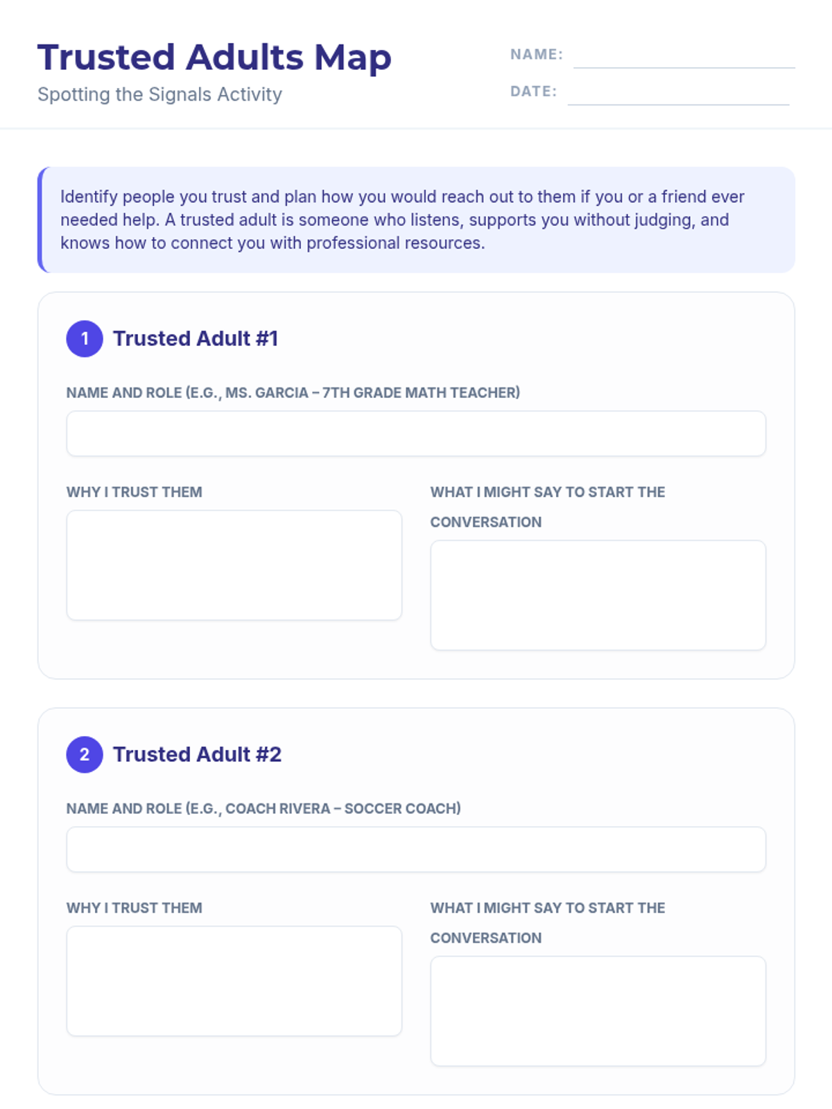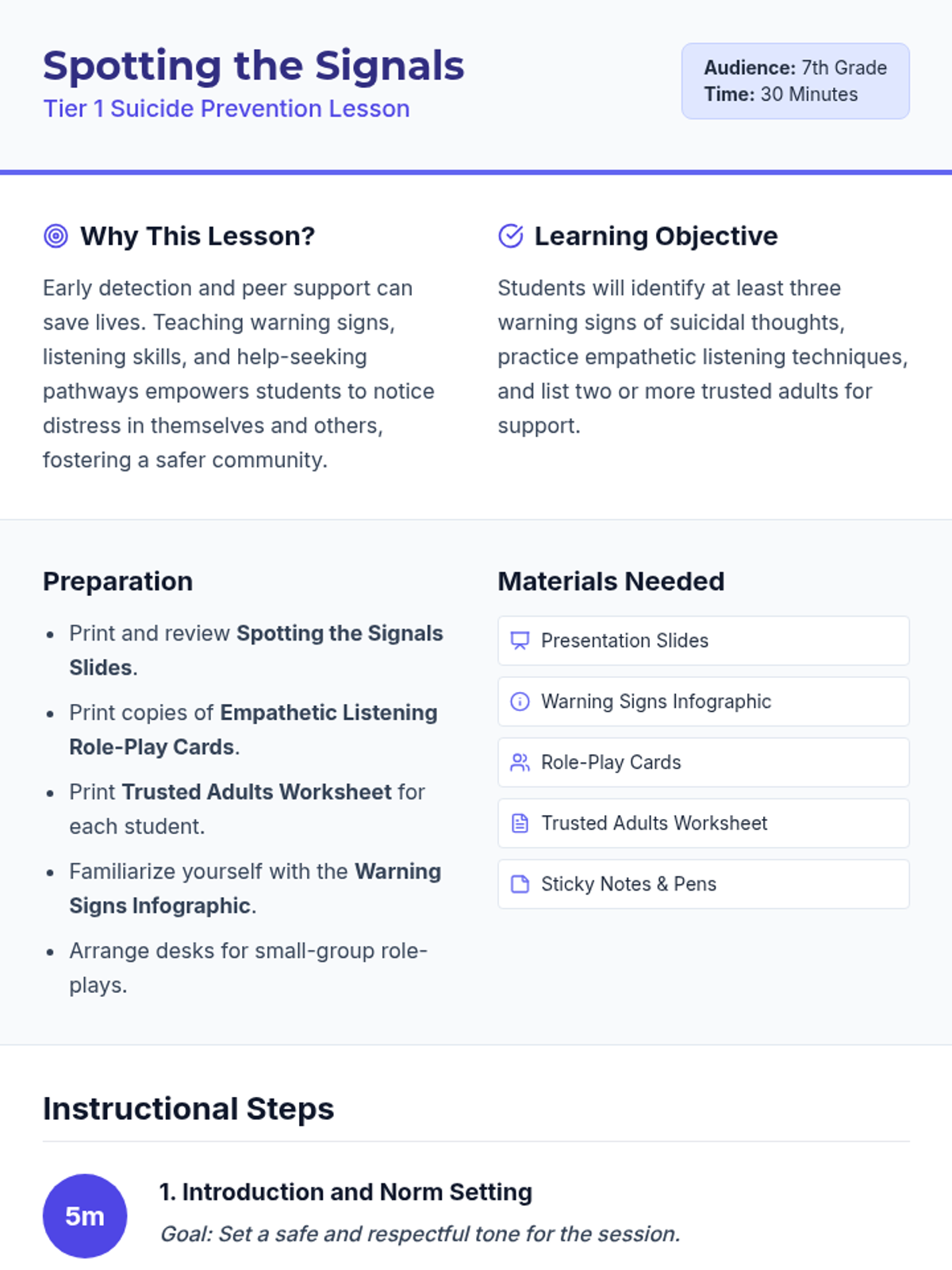 A 30-minute Tier 1 suicide prevention lesson for 7th graders focused on recognizing warning signs, practicing empathetic listening, and identifying trusted adults.