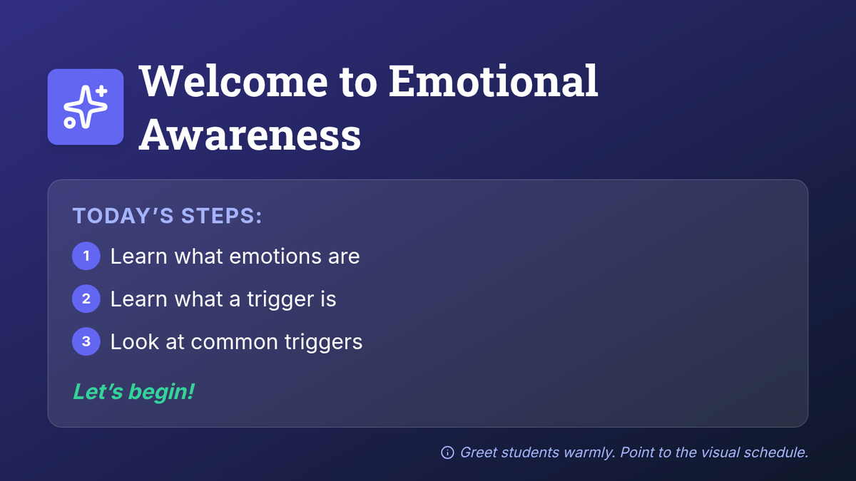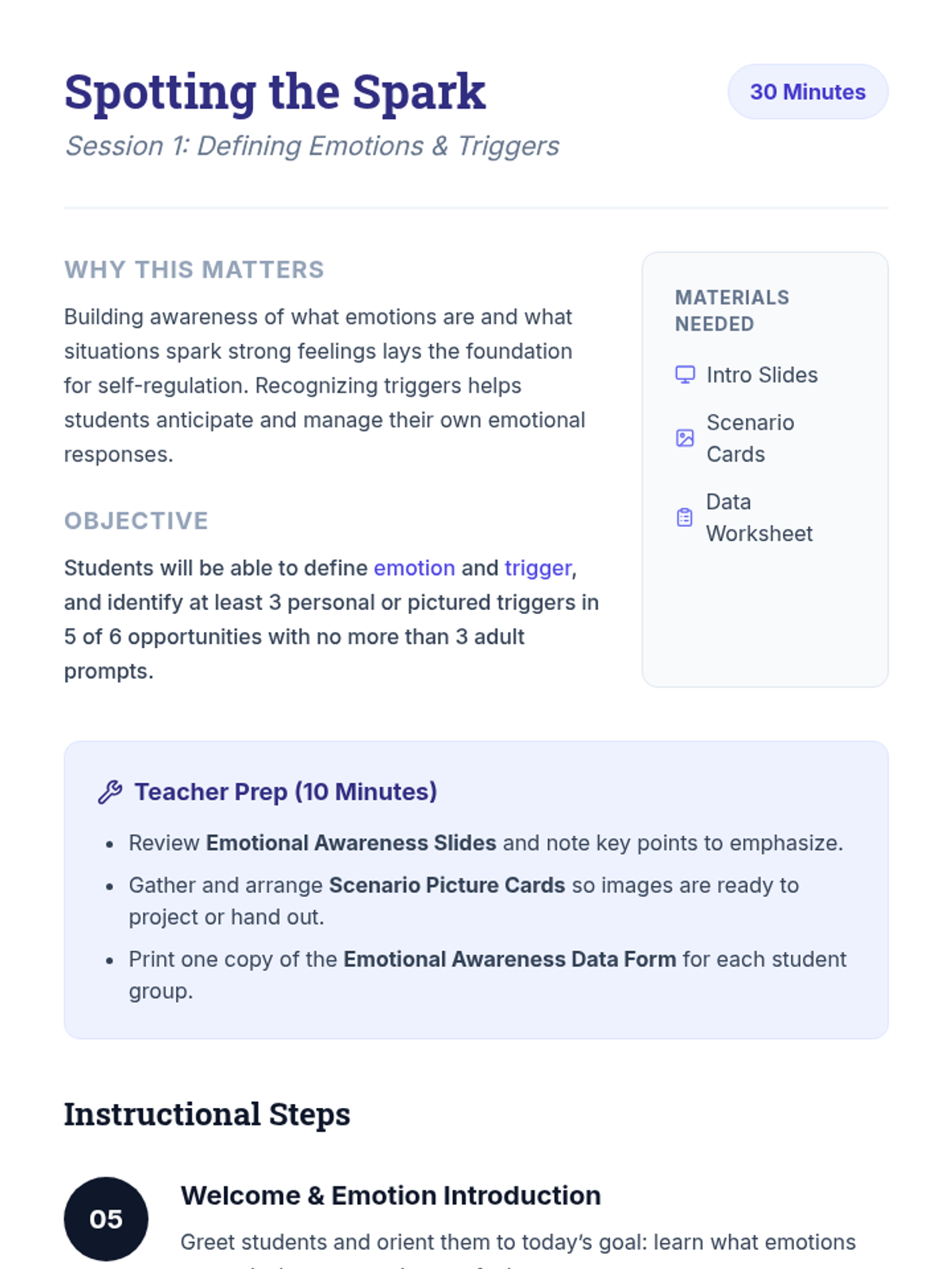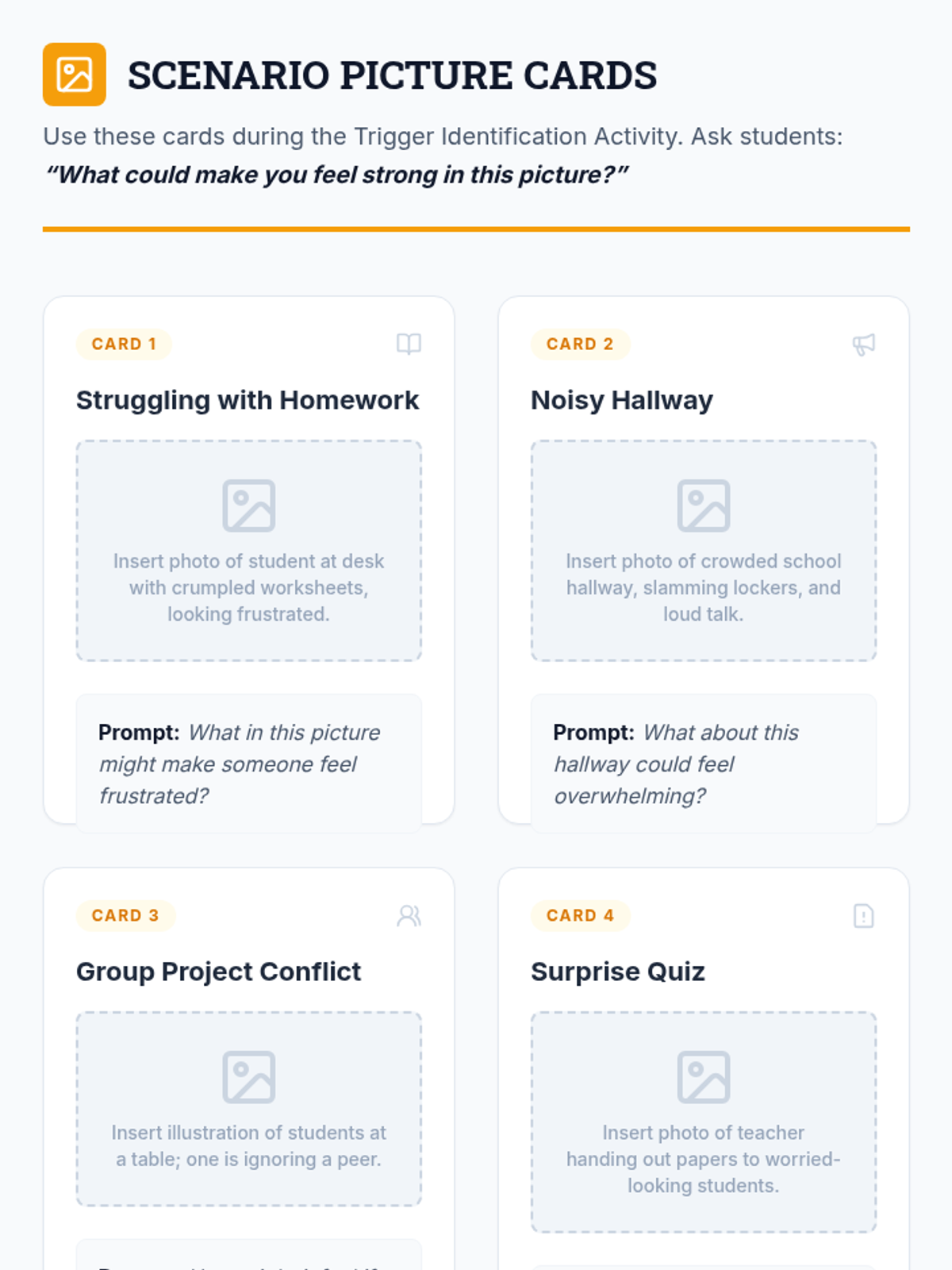 Introduces the concepts of emotions and triggers, helping students identify personal and situational sparks for strong feelings using visual scenario cards.