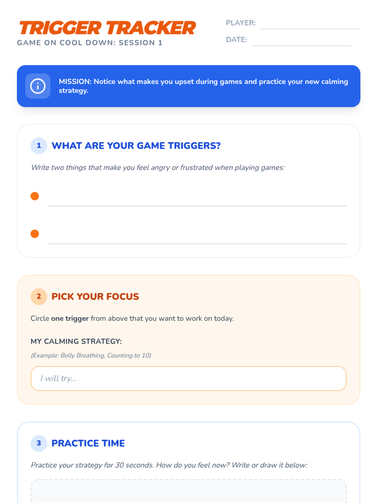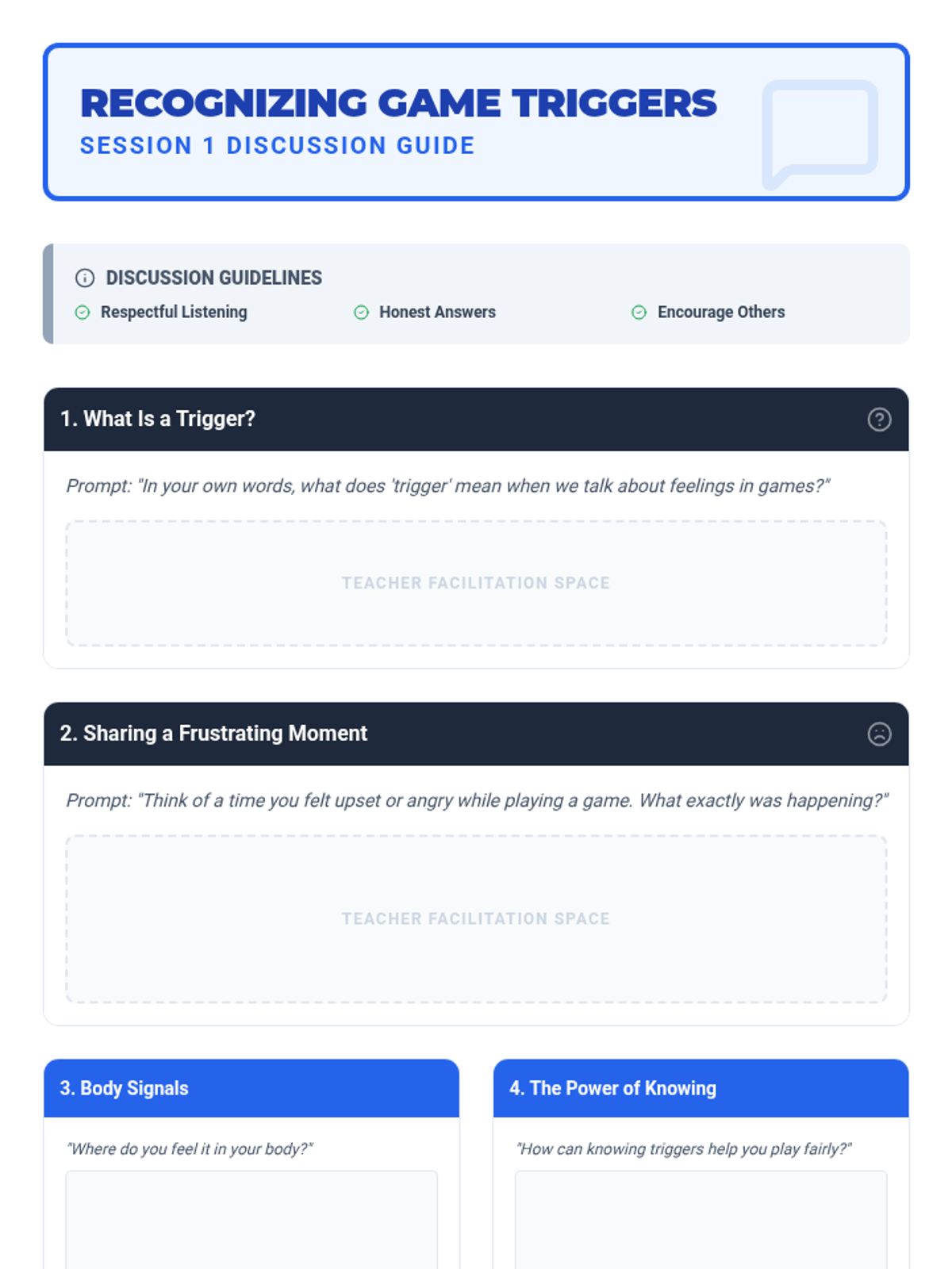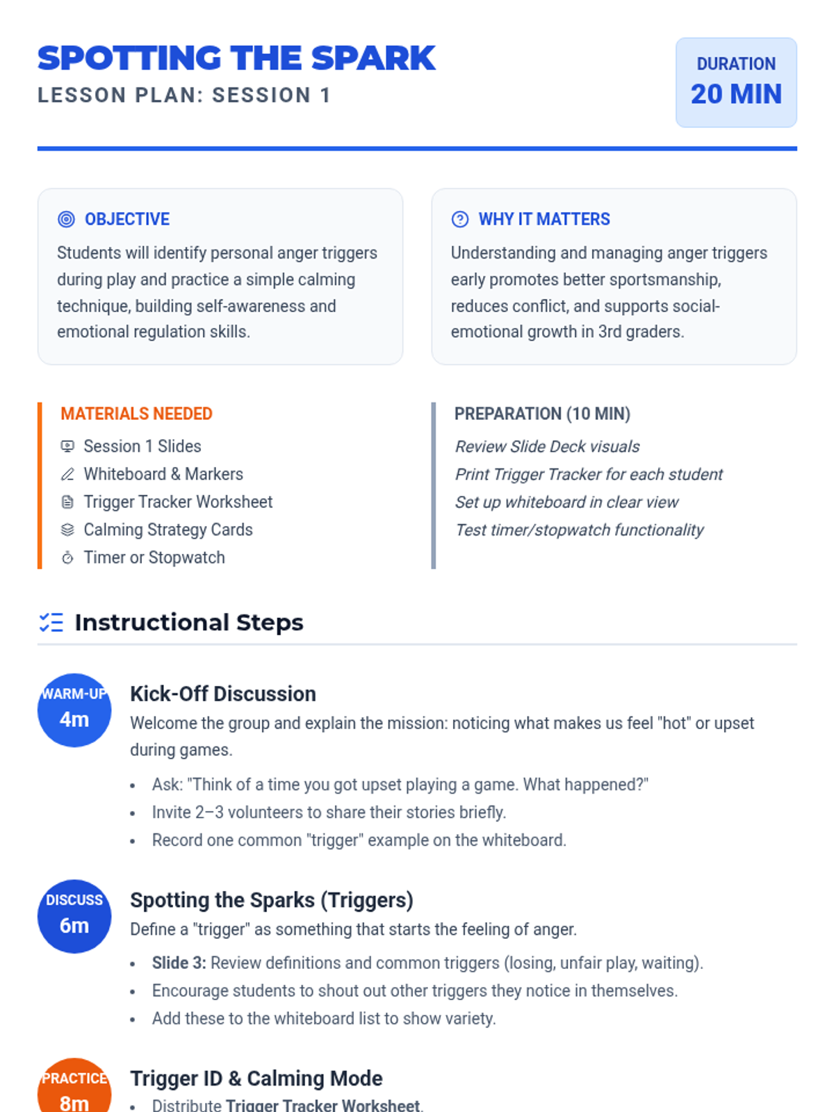 In this first session, students learn to identify their personal anger triggers during games and practice the 'Belly Breathing' calming technique.