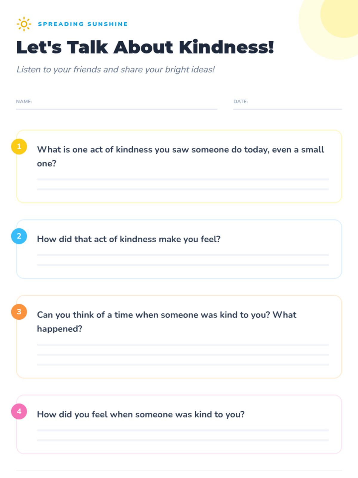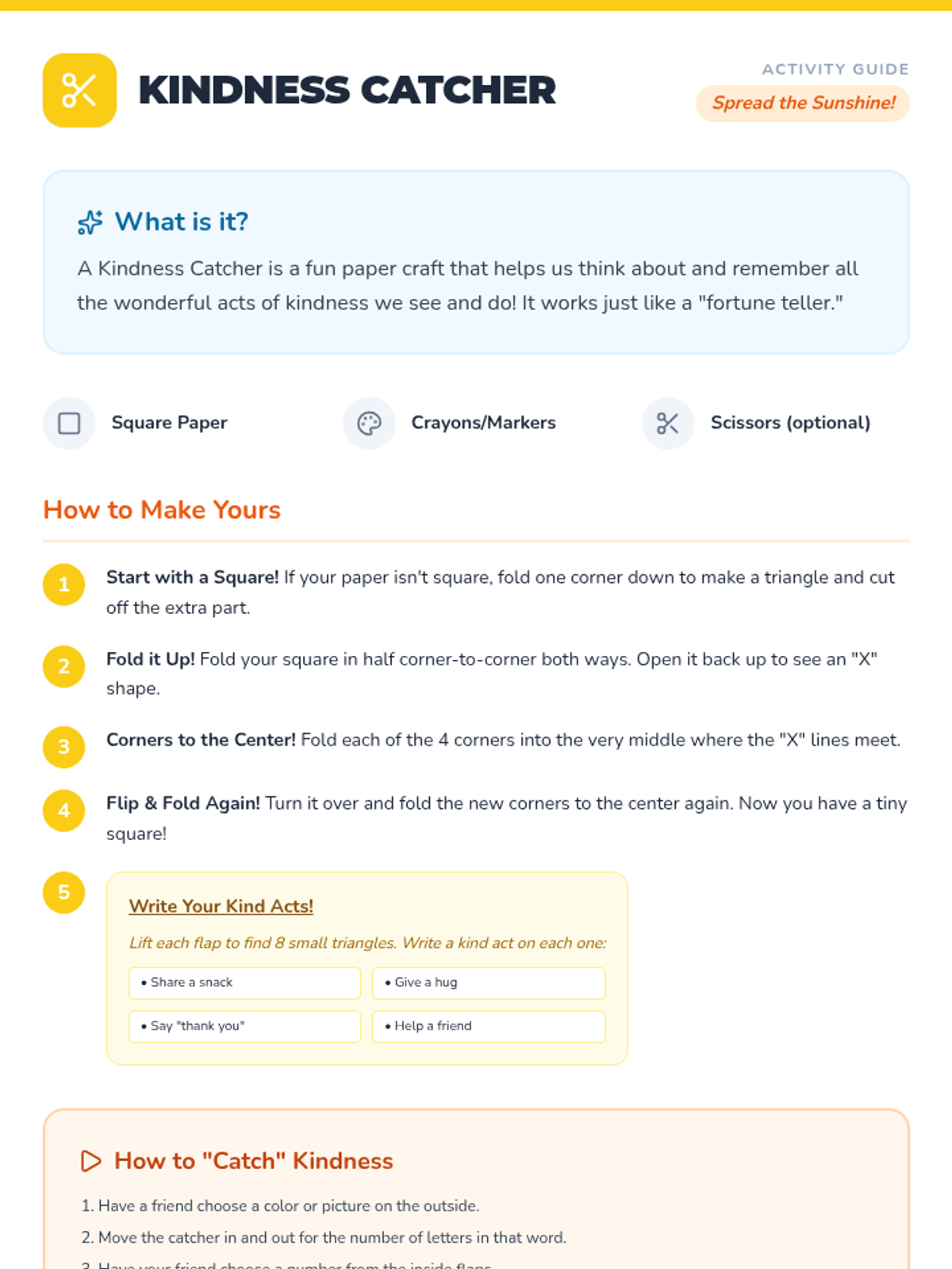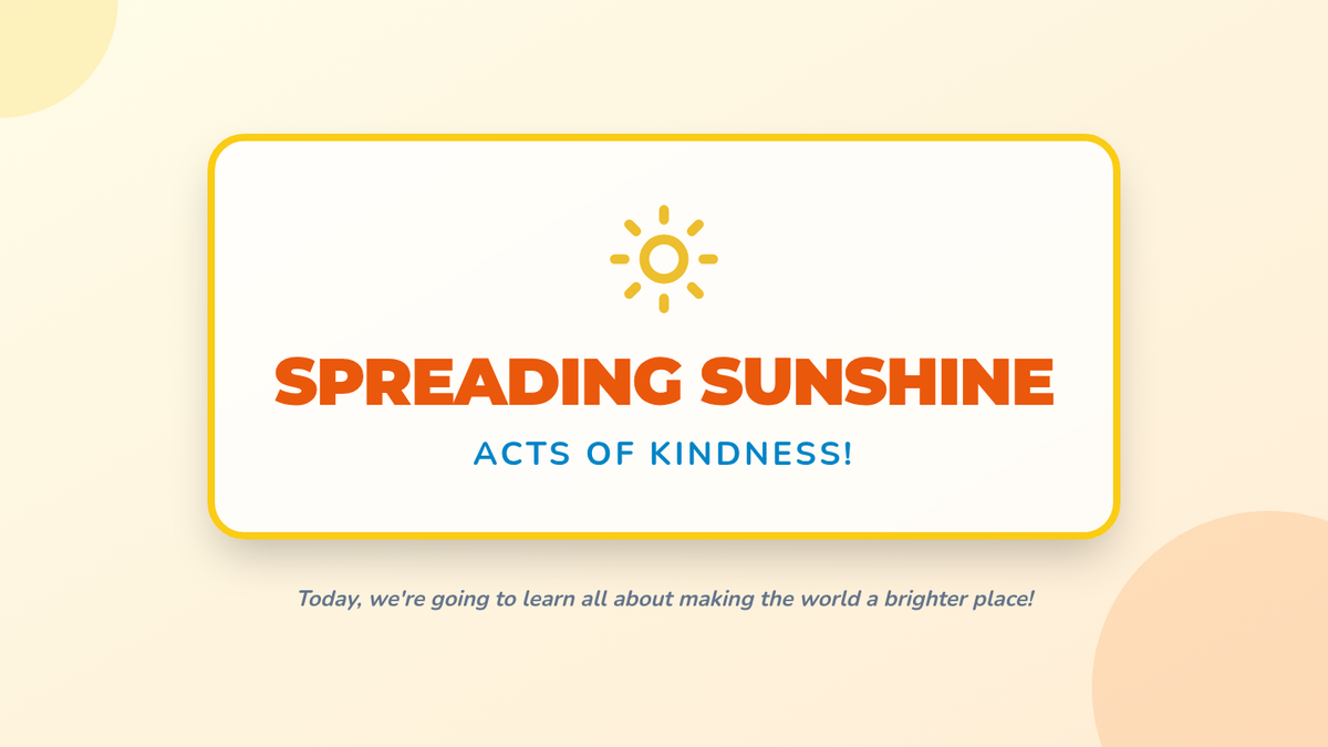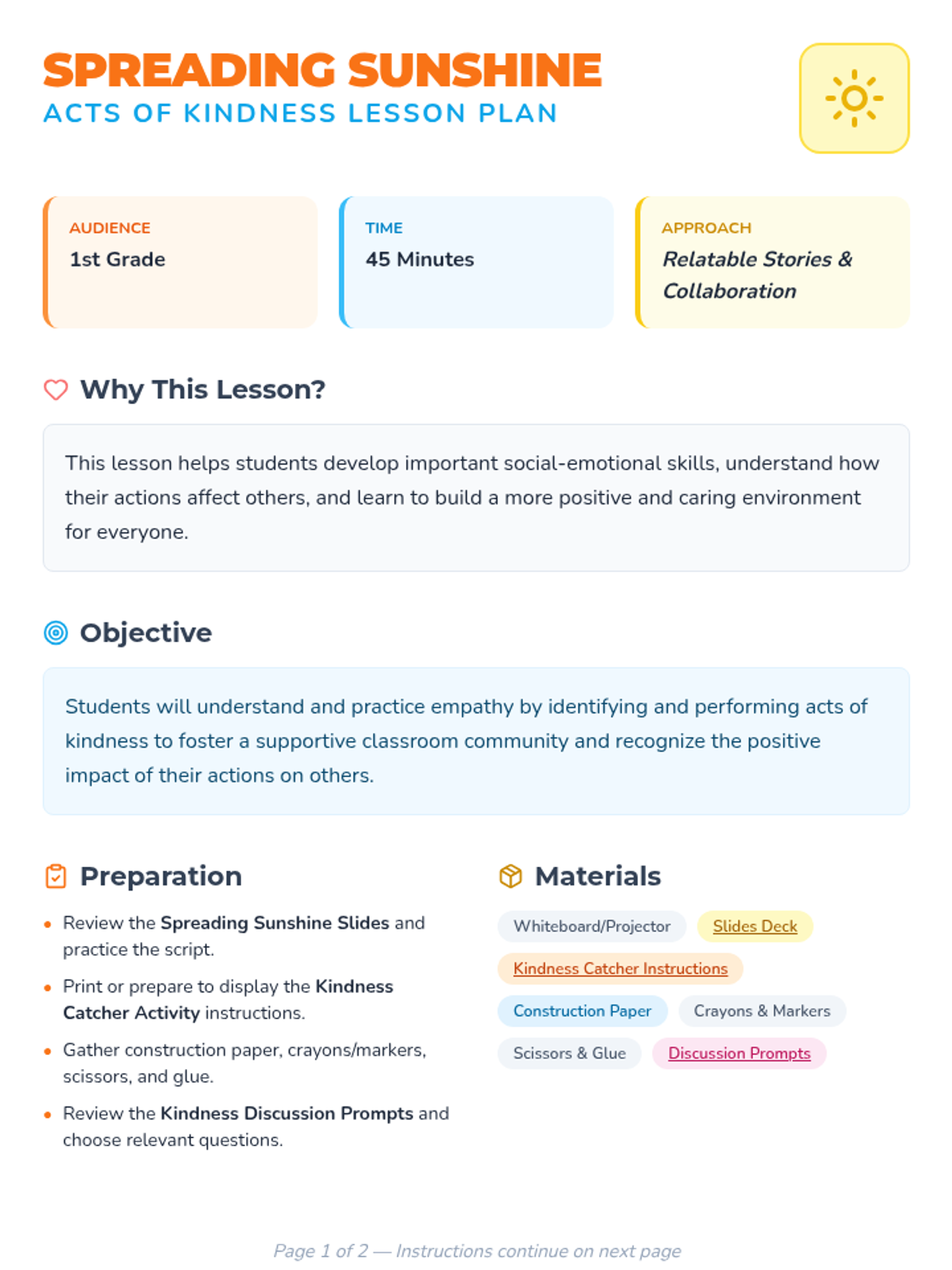 A heartfelt 1st-grade lesson focused on building empathy and community through small acts of kindness. Students will listen to stories, participate in discussions, and create a 'Kindness Catcher' craft to practice spreading sunshine.