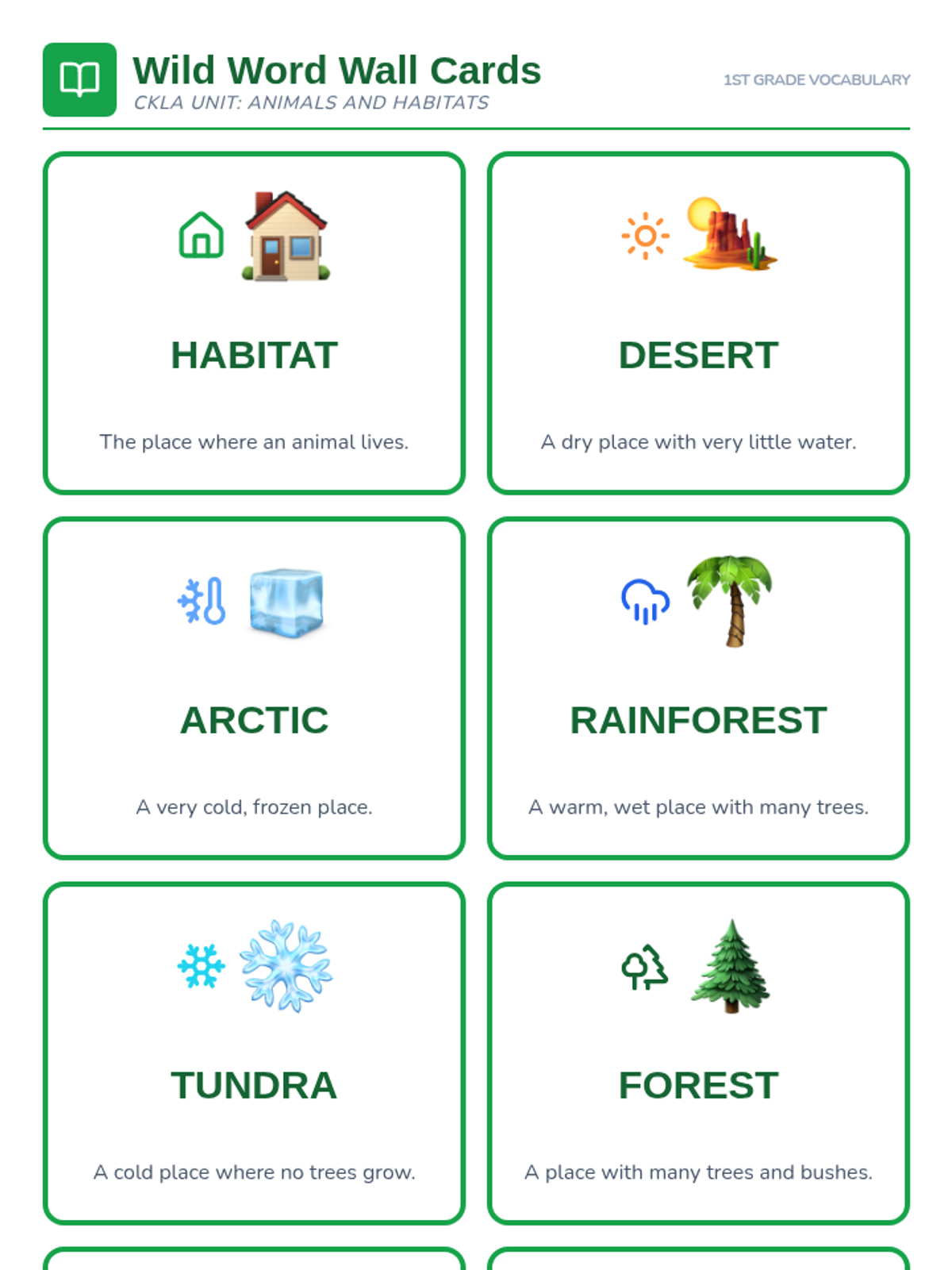 An interactive vocabulary lesson for 1st graders focusing on animal and habitat terms through movement-based games and visual word wall exploration. Students engage with CKLA Unit vocabulary through physical play and visual aids.