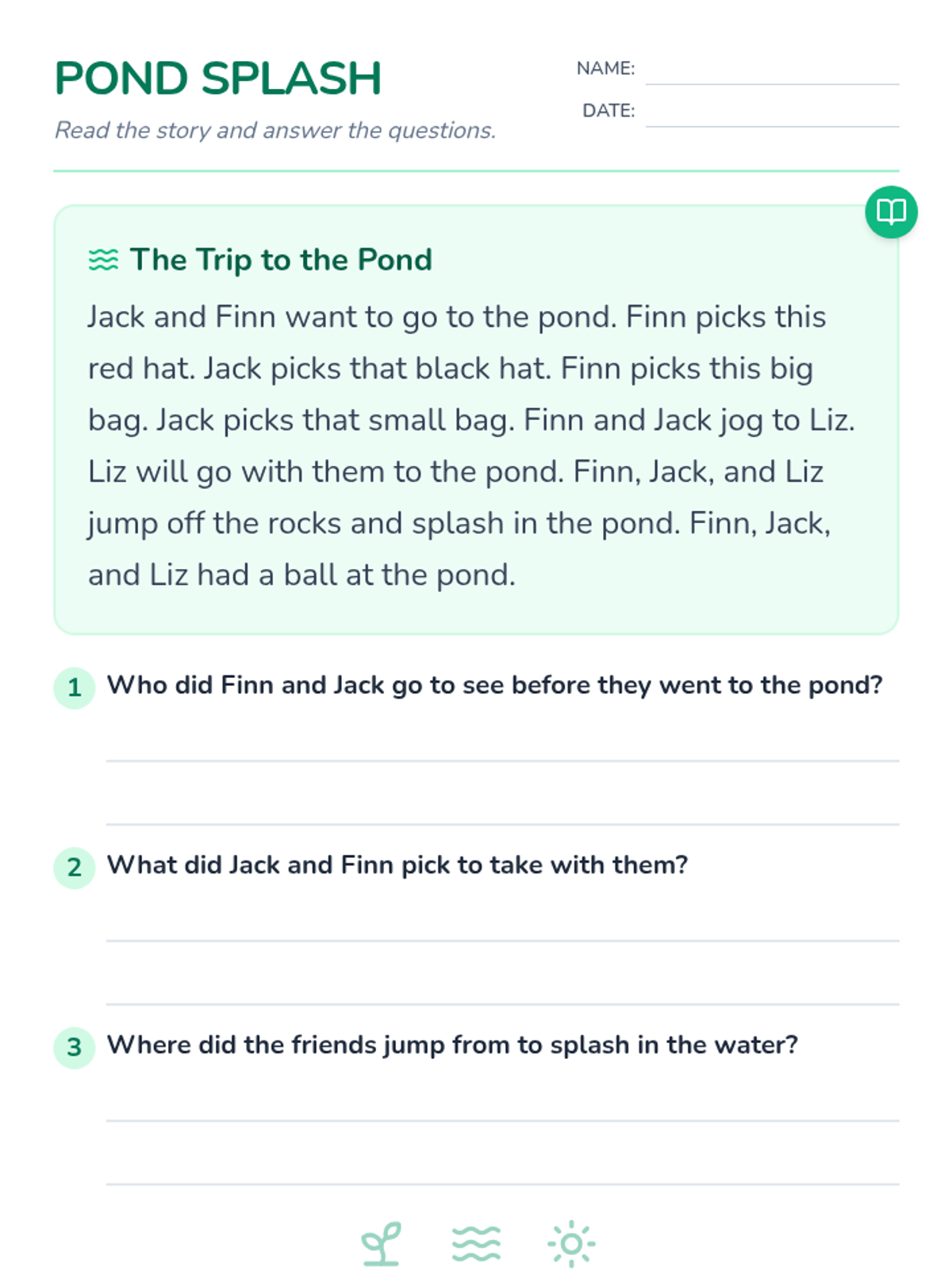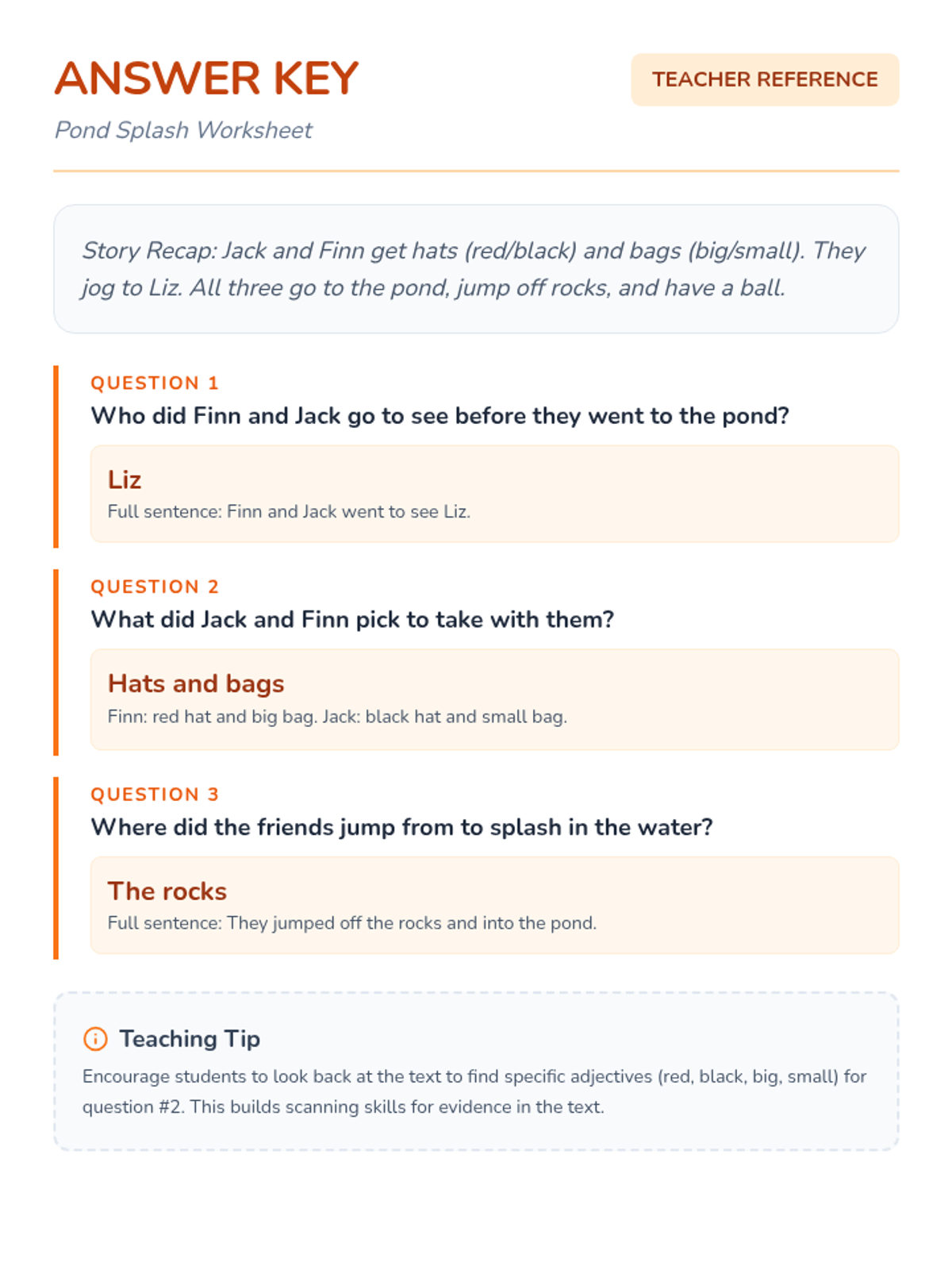 A reading comprehension lesson centered on a short story about friends visiting a pond, focusing on identifying key details using 'Wh' questions.