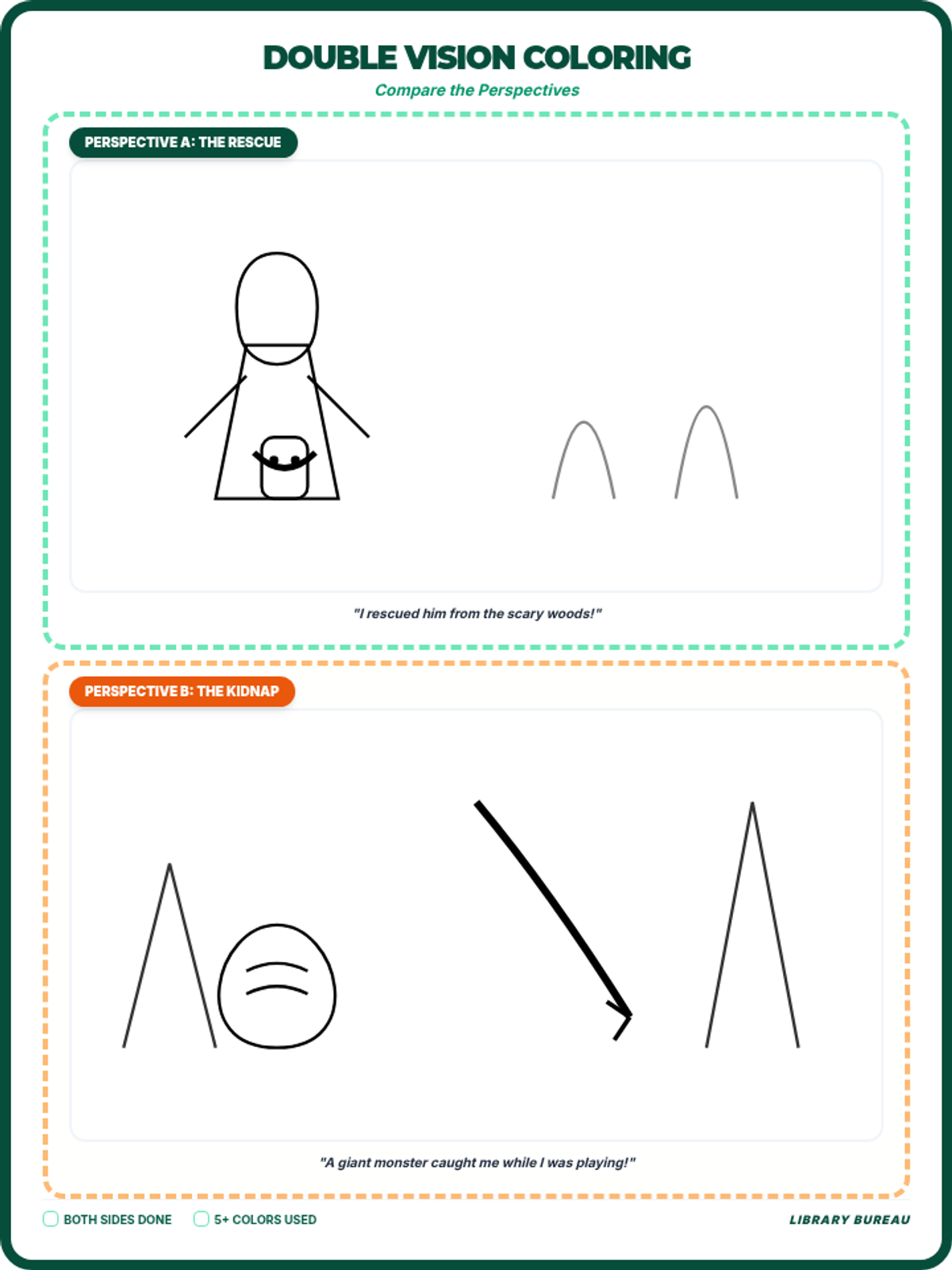 A library lesson for 3rd and 4th graders exploring contrasting perspectives through the book 'A Tale of Two Beasts' by Fiona Roberton. Students will analyze how the same events are described differently by the two main characters (the girl and the beast) to understand the importance of considering multiple viewpoints.