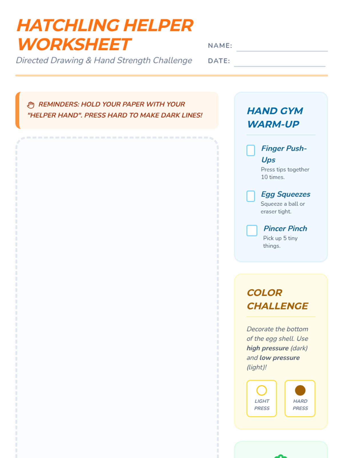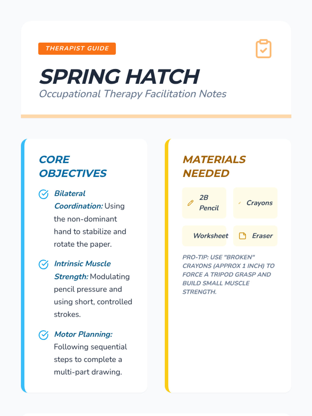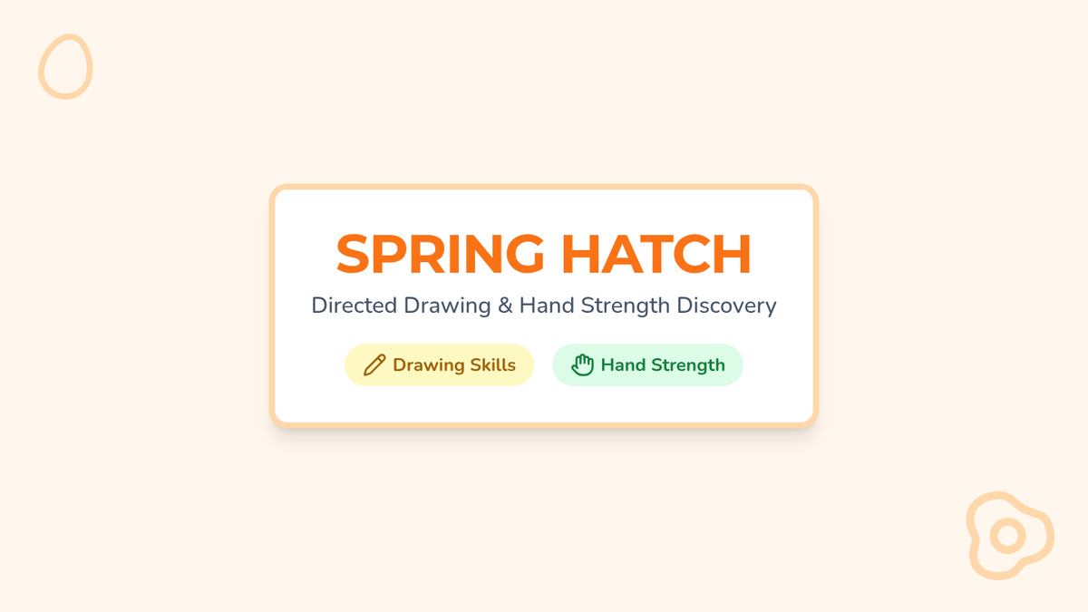 An Easter-themed occupational therapy lesson focused on hand strengthening and bilateral coordination through directed drawing of a hatching chick. Students practice tripod grasp, paper stabilization, and controlled line drawing.