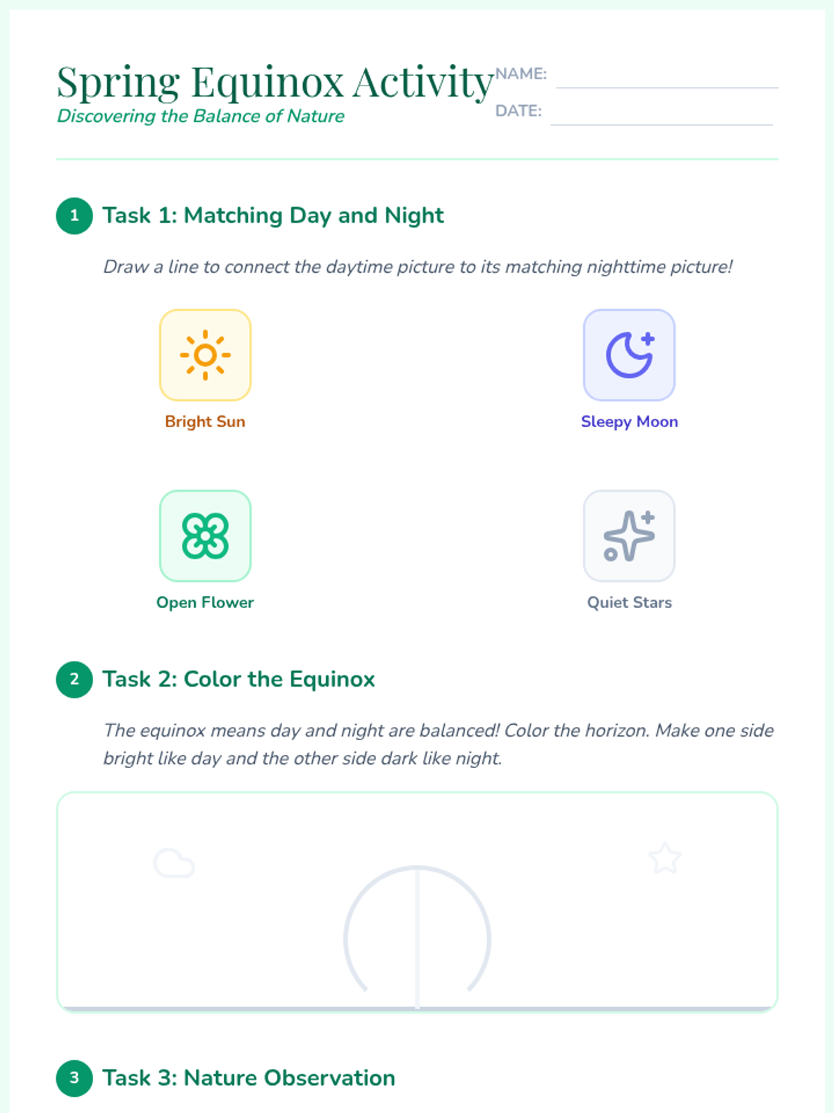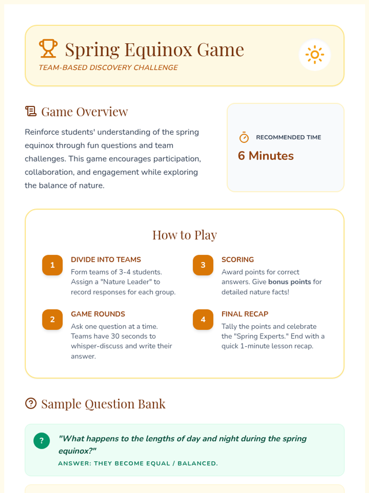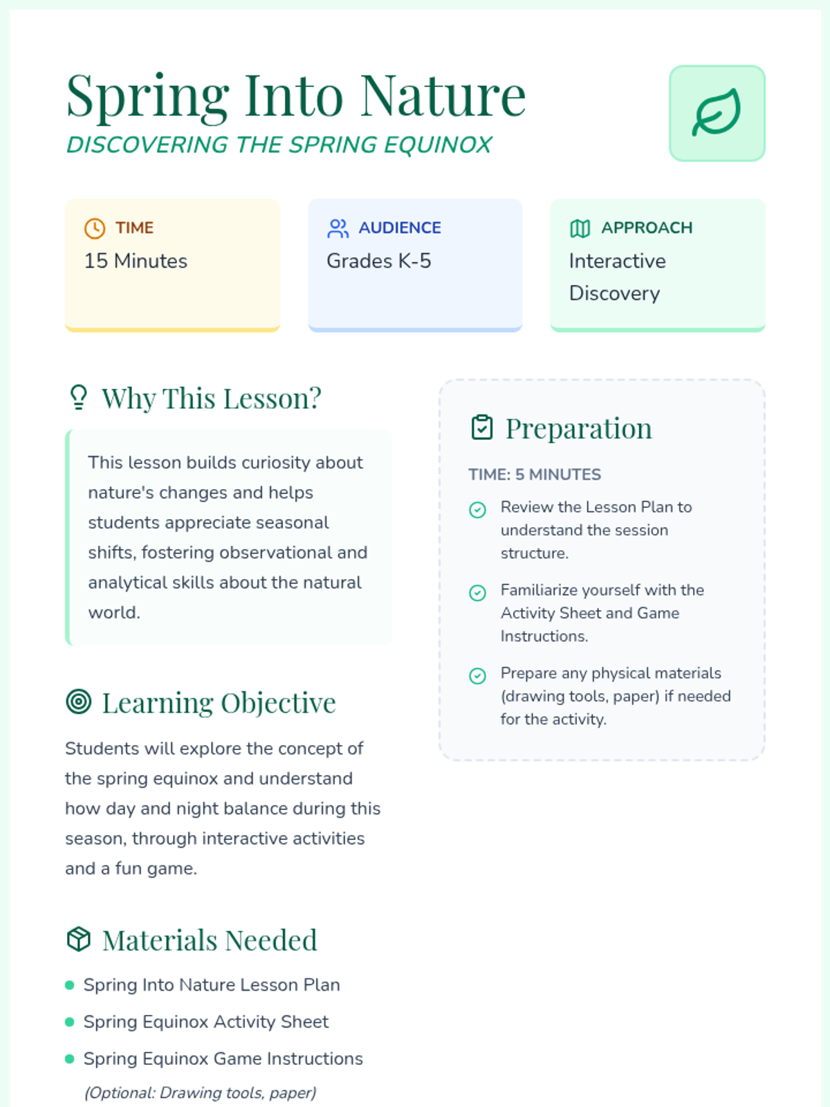 An interactive 15-minute lesson for Grades K-5 exploring the science and beauty of the spring equinox, featuring guided discussions, a matching activity, and a team-based game.