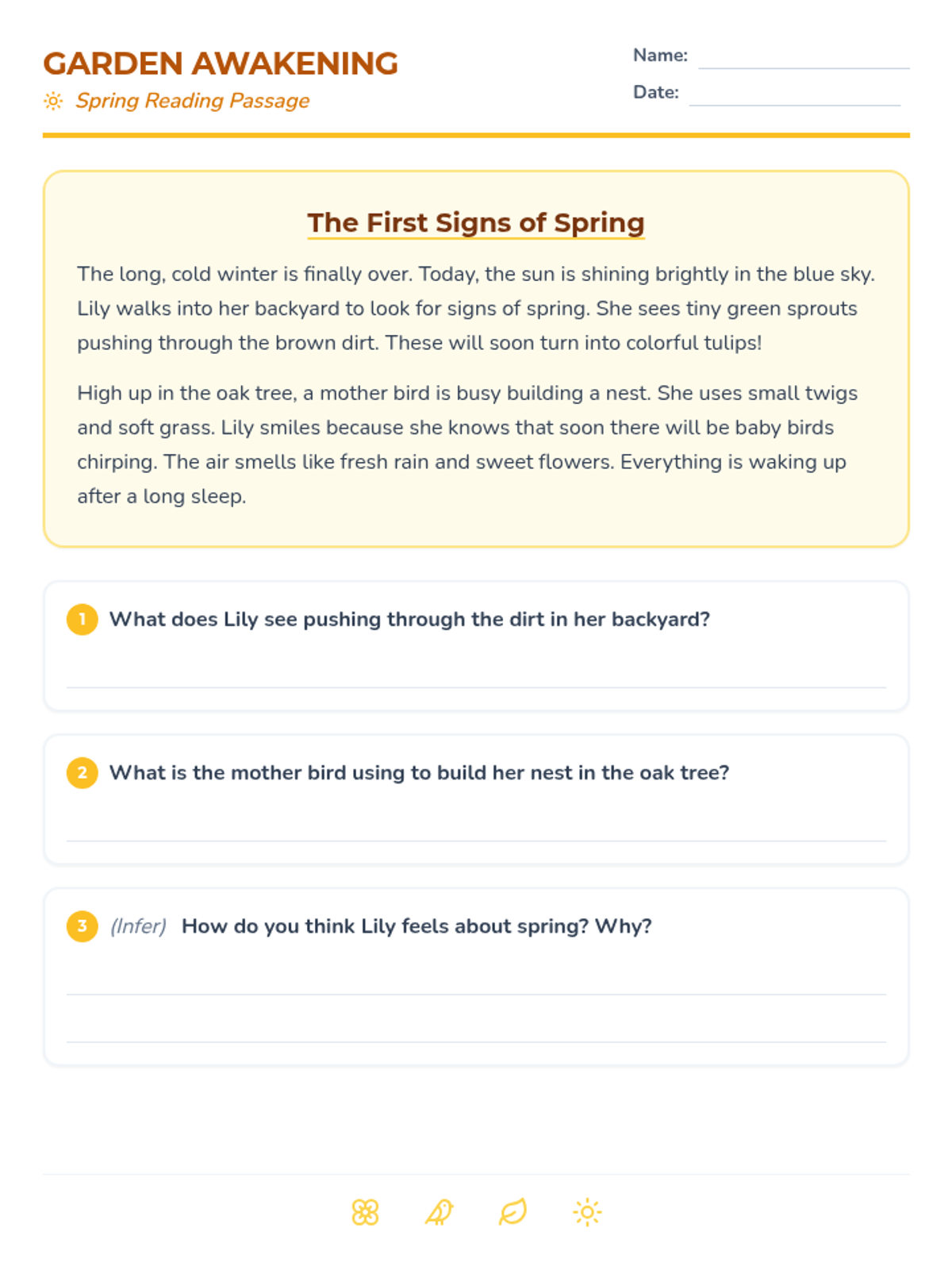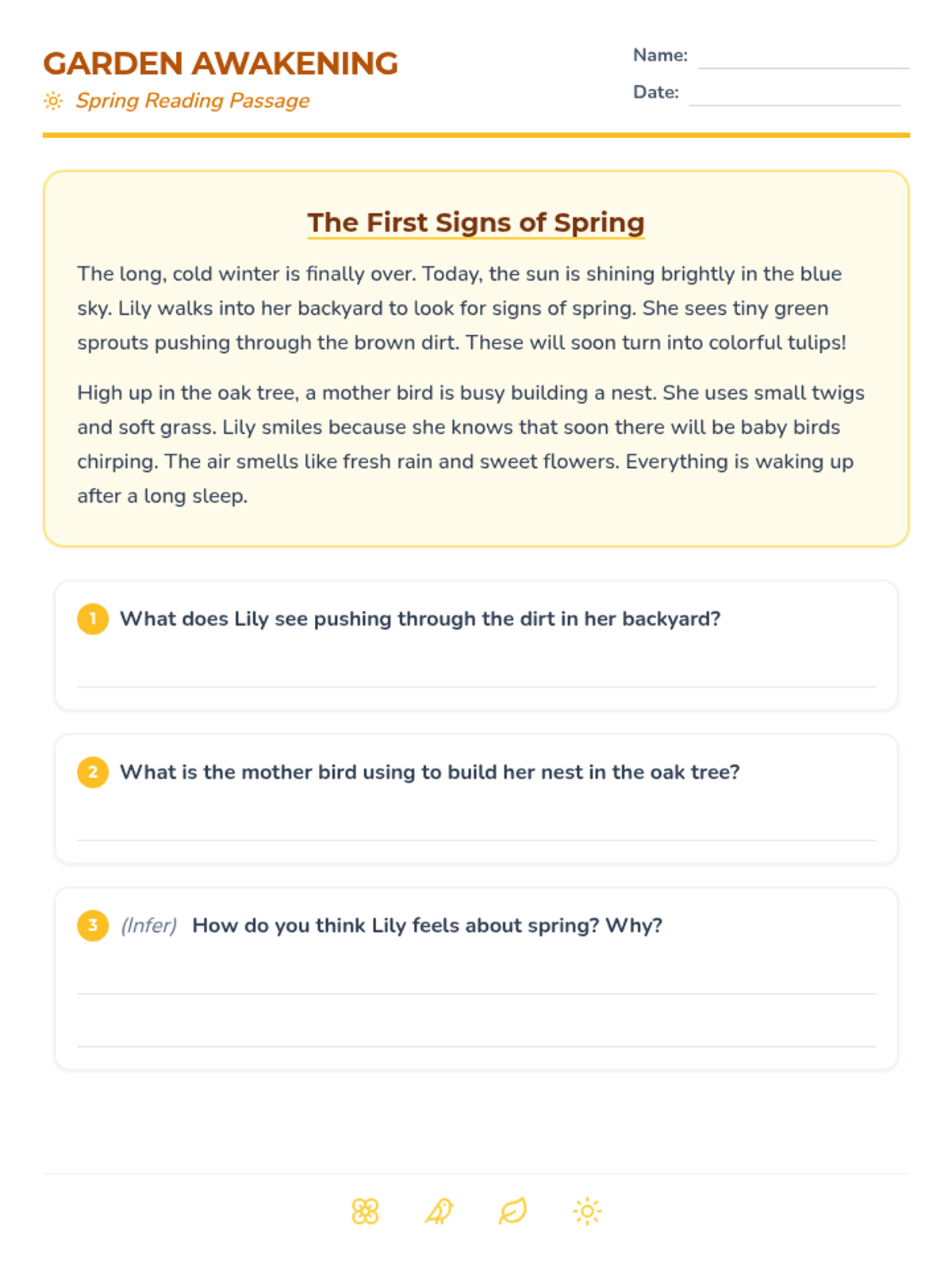 A collection of four diverse homework worksheets for 2nd-grade students, covering fractions, reading comprehension, multiplication basics, and phonics word sorting with a cohesive spring theme.