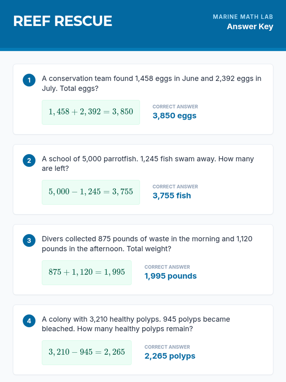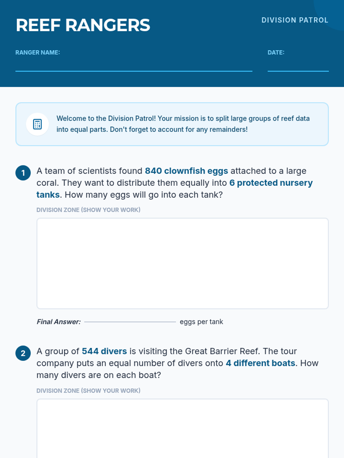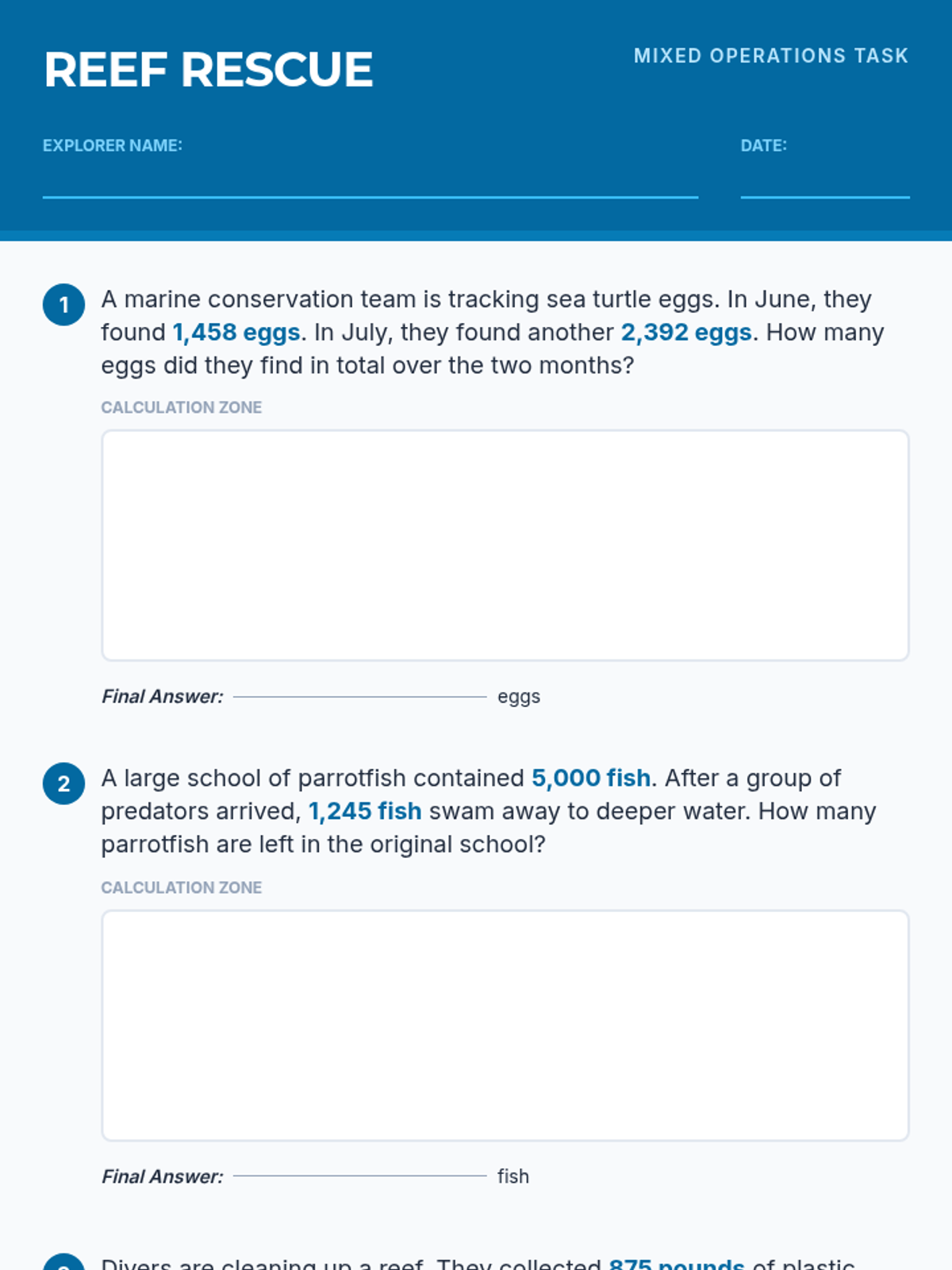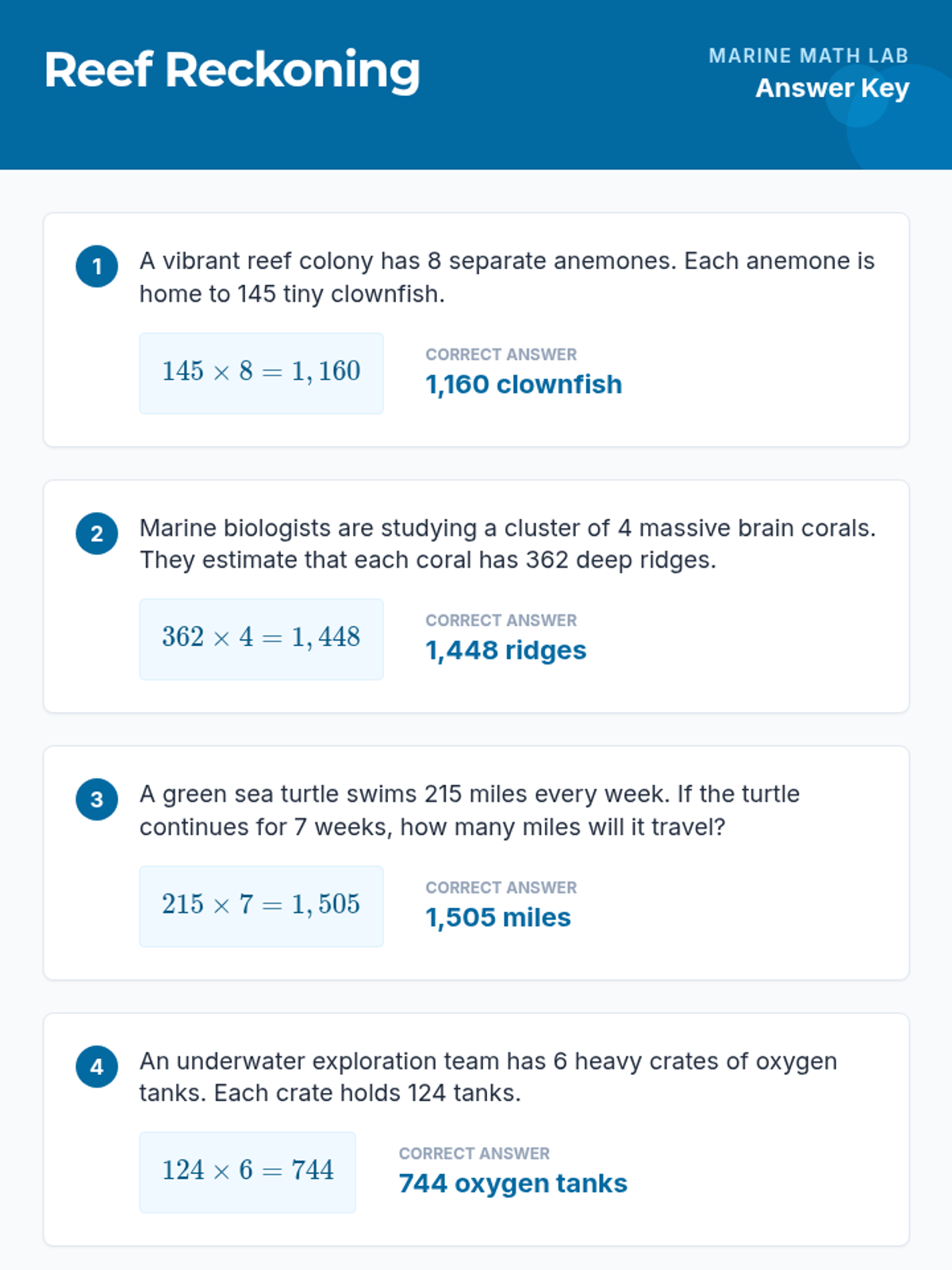 Students solve word problems involving multi-digit multiplication, addition, subtraction, and division, all centered around the ecology and exploration of coral reefs.