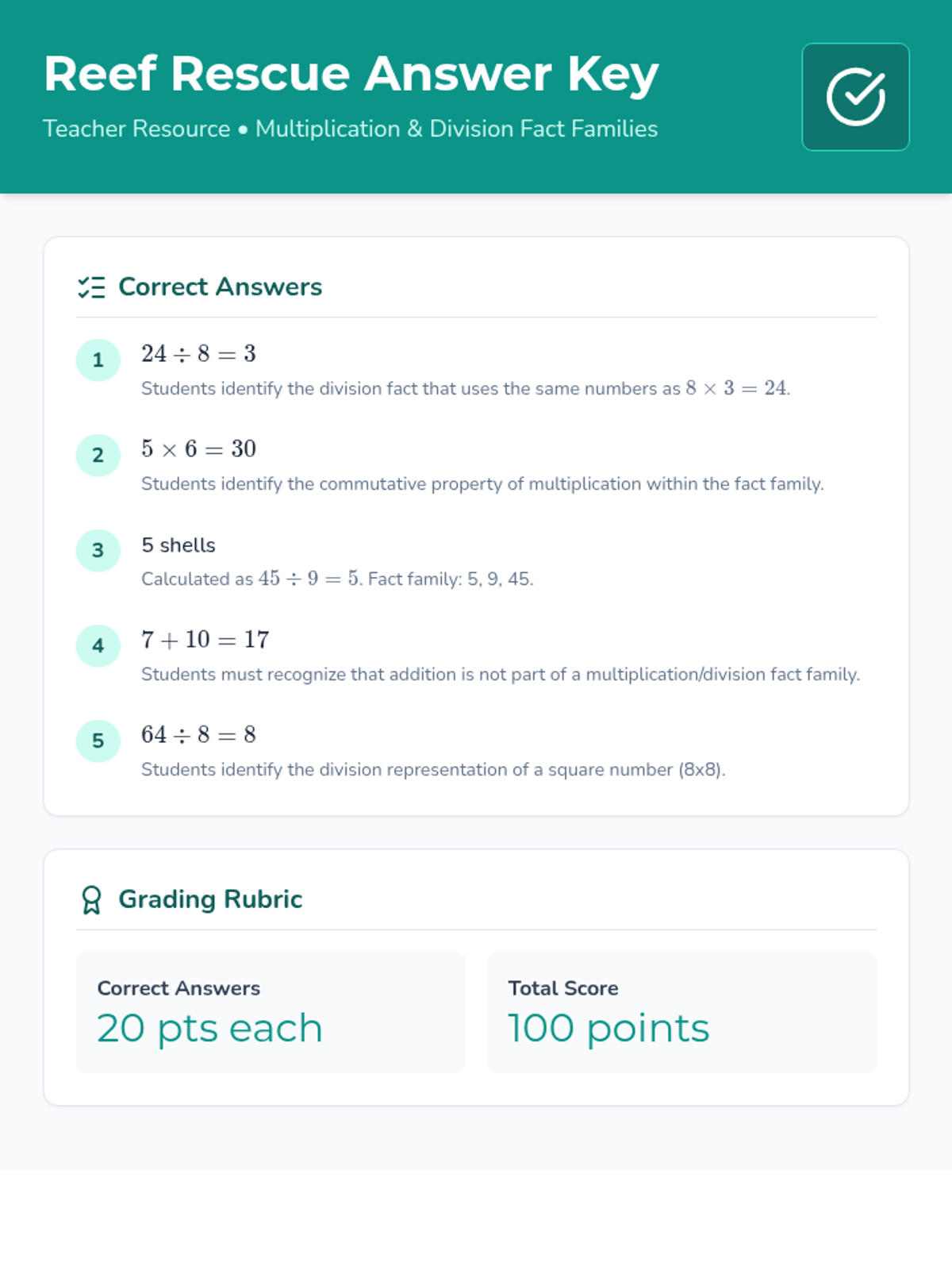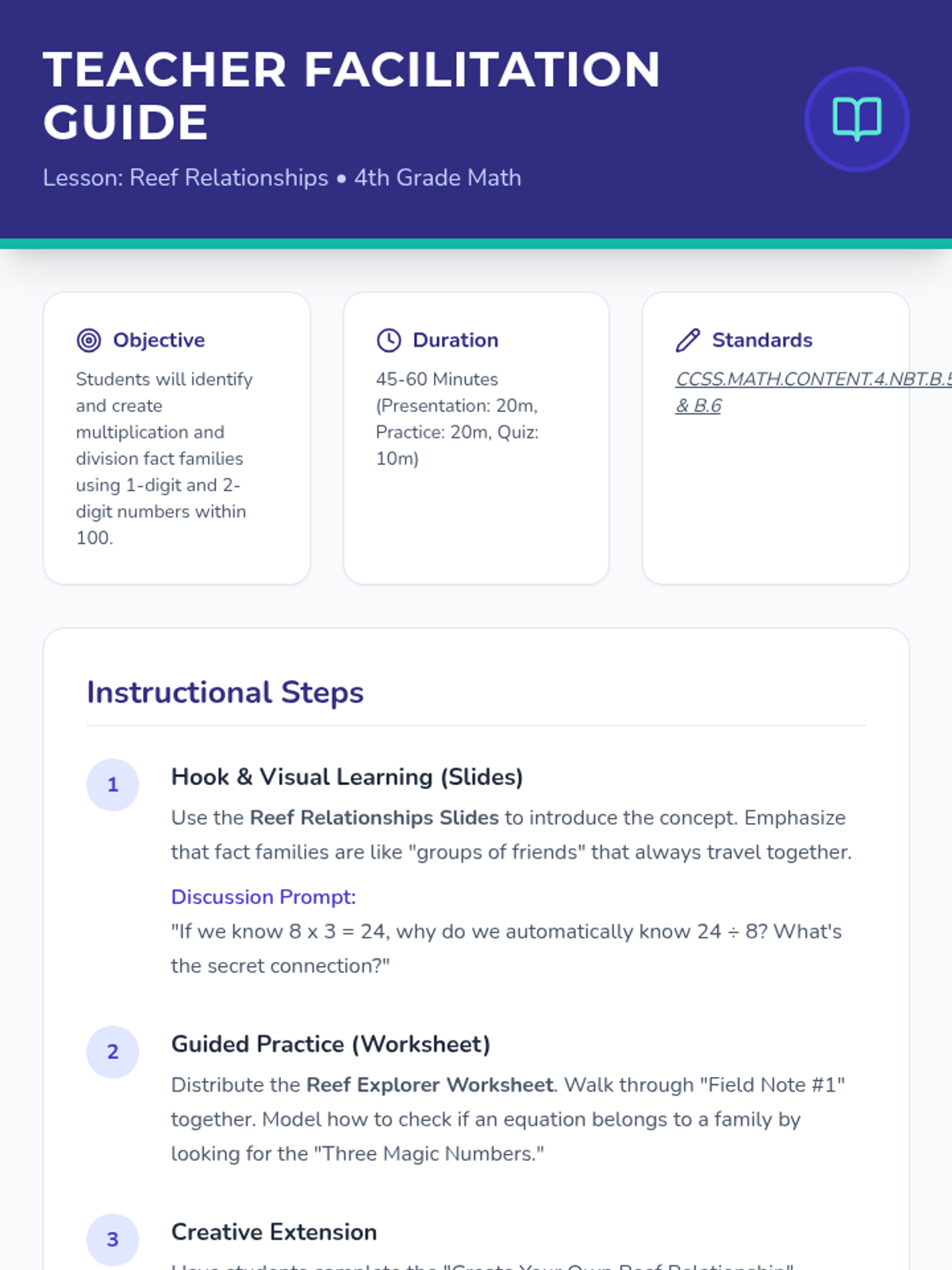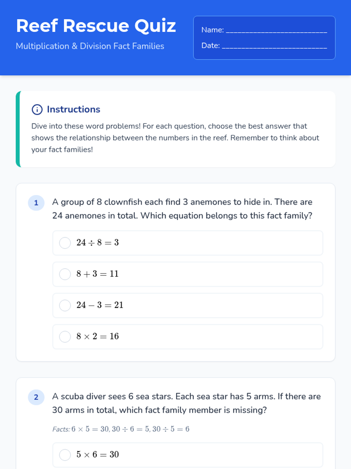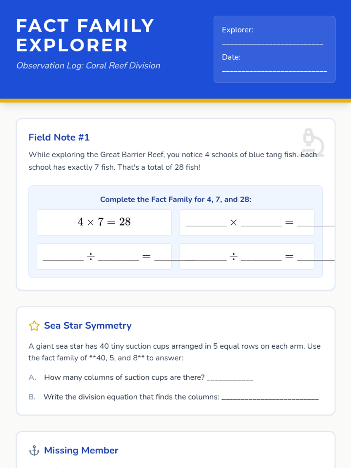 In this lesson, students explore the mathematical relationships within the coral reef ecosystem, focusing on multiplication and division fact families through engaging word problems.